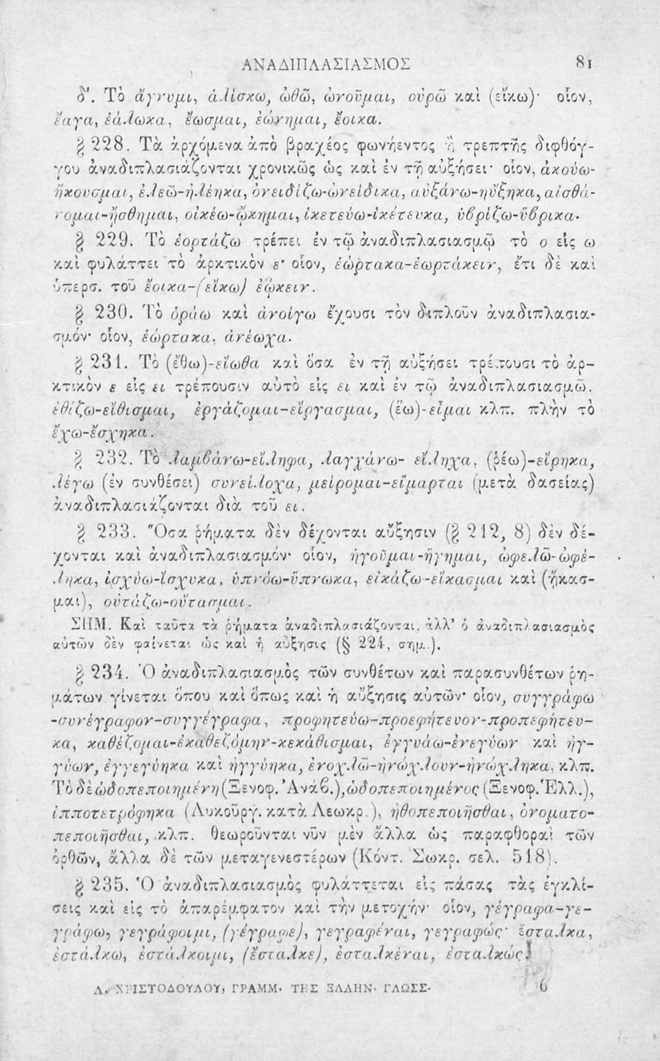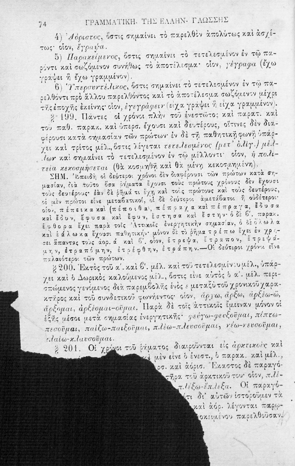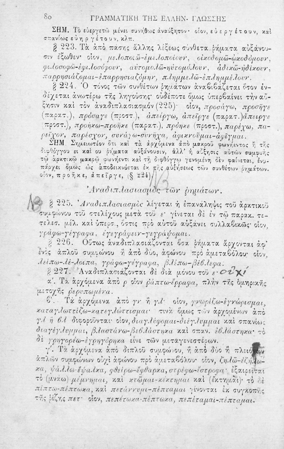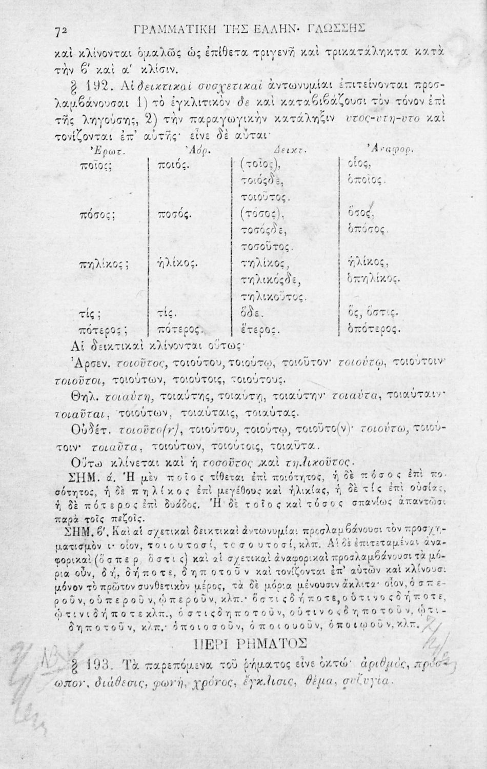 Σχολικό εγχειρίδιο Αρχαίων Ελληνικών για τα Ελληνικά Σχολεία, Παρθεναγωγεία και Γυμνάσια που περιέχει τους κανόνες γραμματικής και είναι χωρισμένο σε φθογγολογικό, τυπολογικό και ετυμολογικό μέρος.