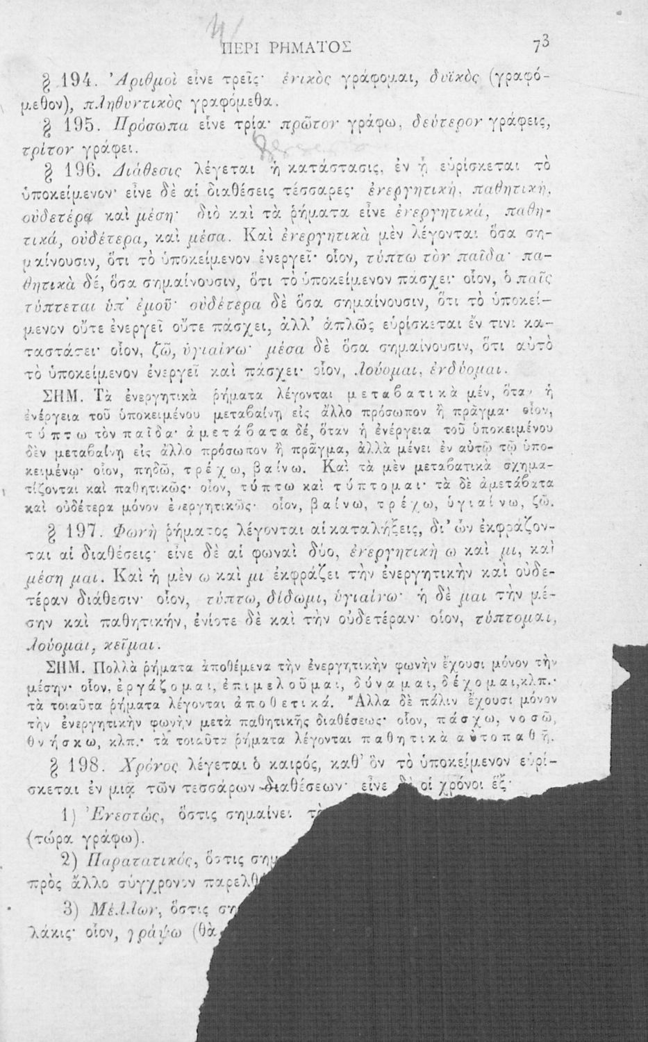 Μαθητικό βοήθημα Αρχαίων Ελληνικών για τα Ελληνικά Σχολεία, Παρθεναγωγεία και Γυμνάσια που περιλαμβάνει γραμματική της αρχαίας ελληνικής και κατάλογο ανωμάλων ρημάτων.