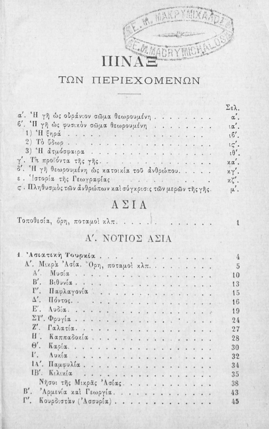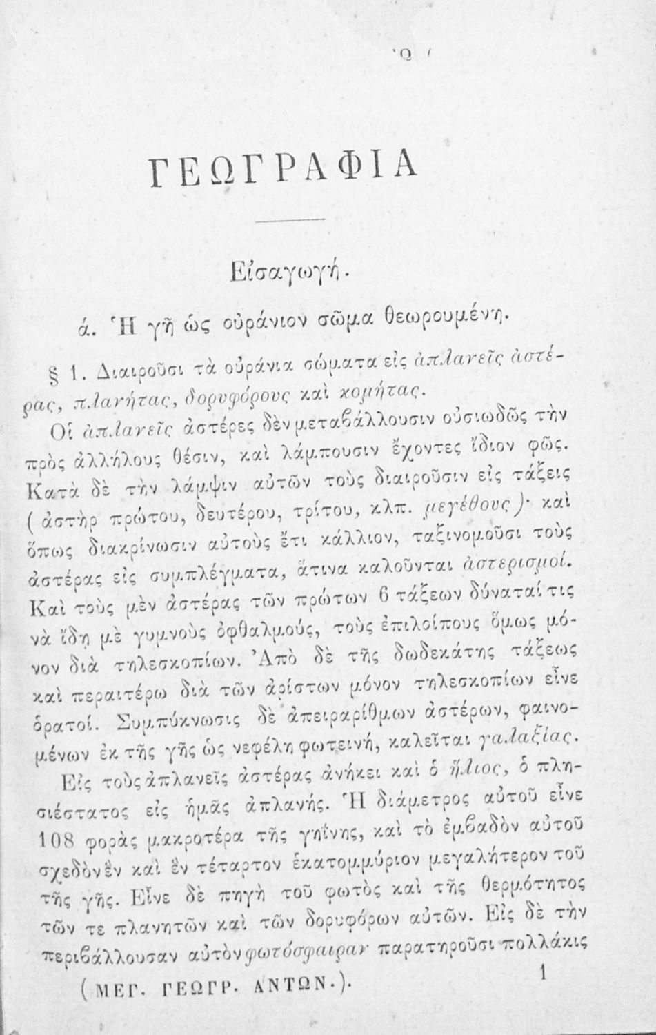 Βαθμίδα εκπαίδευσης: Δευτεροβάθμια Τάξη: Γυμνάσιο Μάθημα: Γεωγραφία Γλώσσα: Καθαρεύουσα Παρουσίαση περιεχομένου: Σχολικό εγχειρίδιο Γεωγραφίας Γυμνασίου που περιλαμβάνει εισαγωγικά γενικές γνώσεις για την δομή και σύσταση της Γης και την ιστορία της γεωγραφίας και της ανθρωπογεωγραφίας. Περιέχει και ανάλυση κρατών από τις πέντε ηπείρους από γεωπολιτική και γεωφυσική άποψη. |