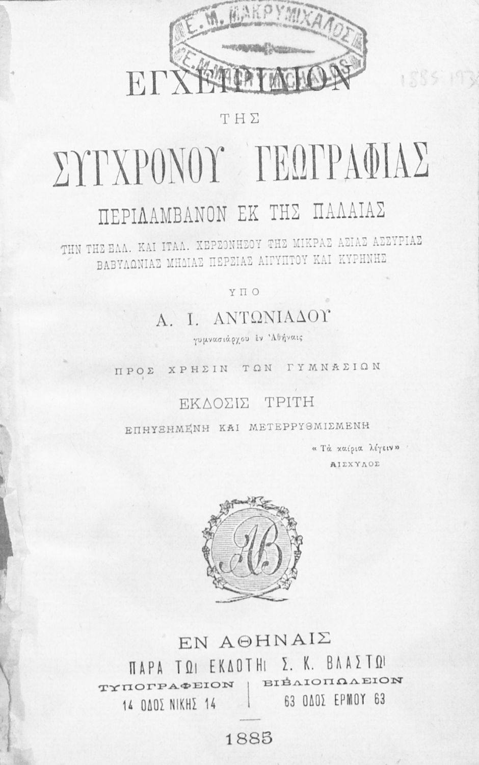 Εκδότης: Σ. Κ. Βλαστός Έτος έκδοσης: 1885 Τόπος έκδοσης: Αθήνα Έκδοση: 3η |
