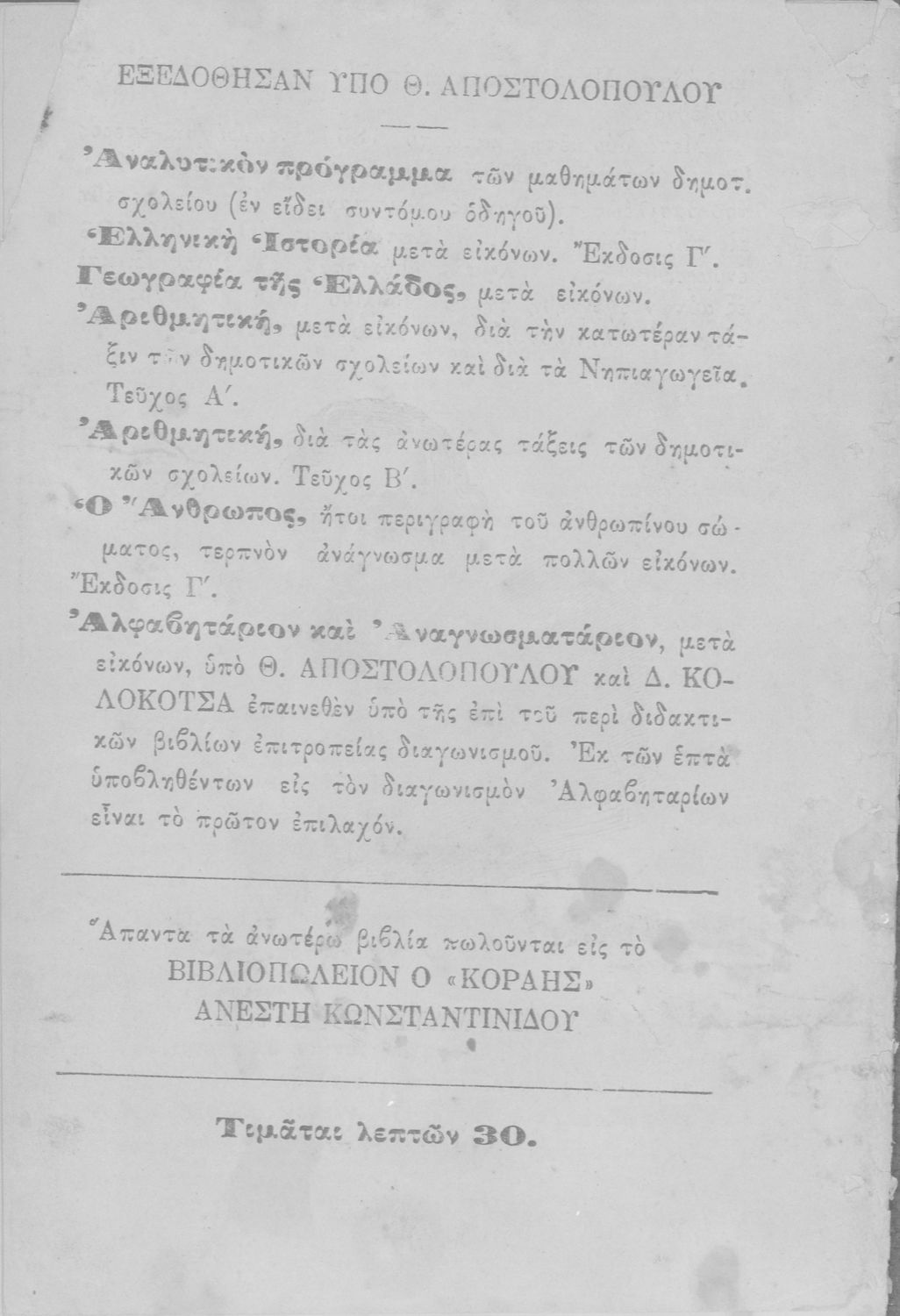Εκδότης: Ανέστης Κωνσταντινίδης Έτος έκδοσης: 1885 Τόπος έκδοσης: Αθήνα Έκδοση: 2η |