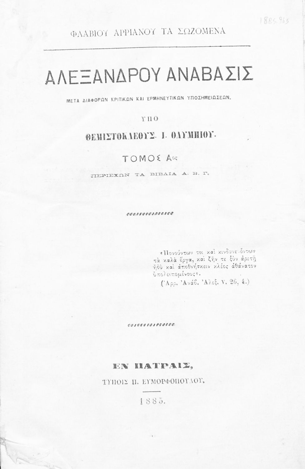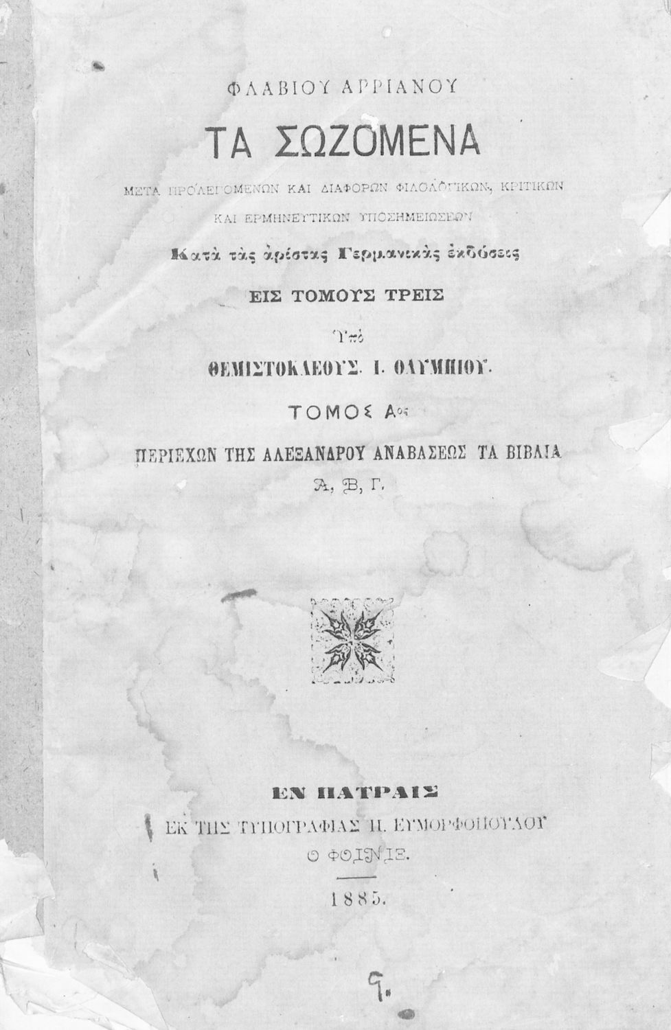 Επιστημονική μελέτη που περιλαμβάνει εκτενή εισαγωγή στη ζωή και το έργο του Αρριανού, την Αλεξάνδρου Ανάβασις και ερμηνευτικές παρατηρήσεις.