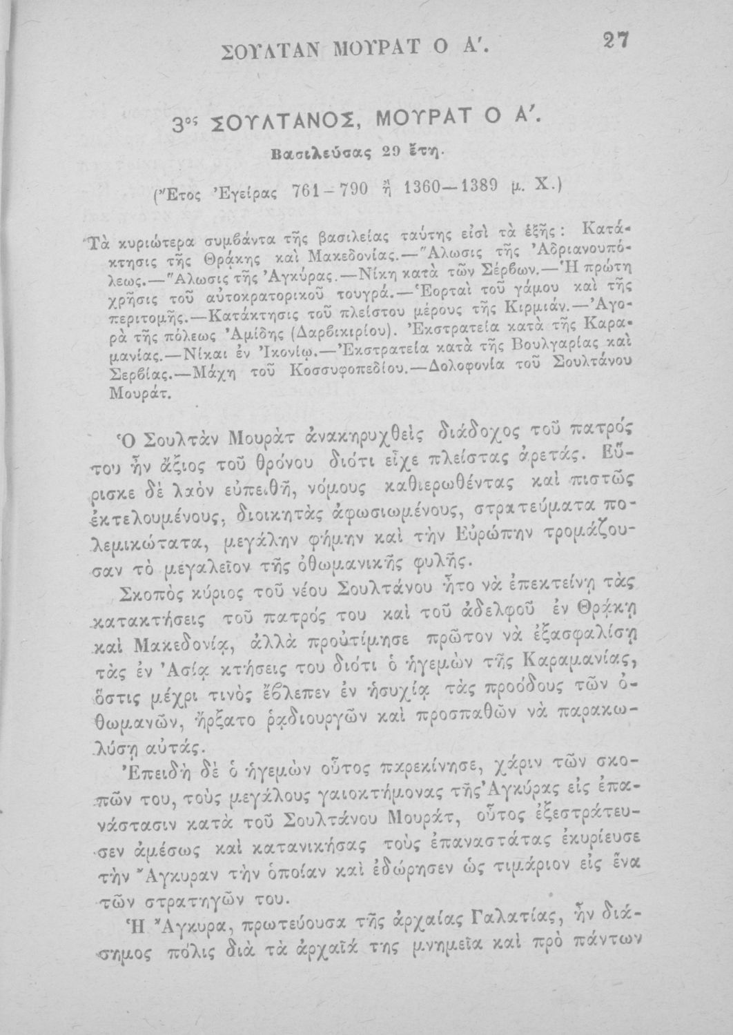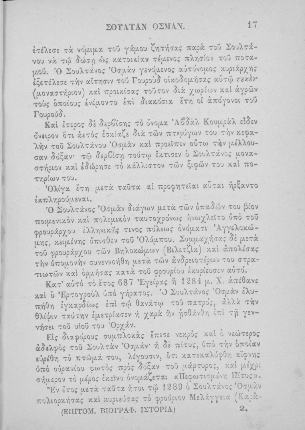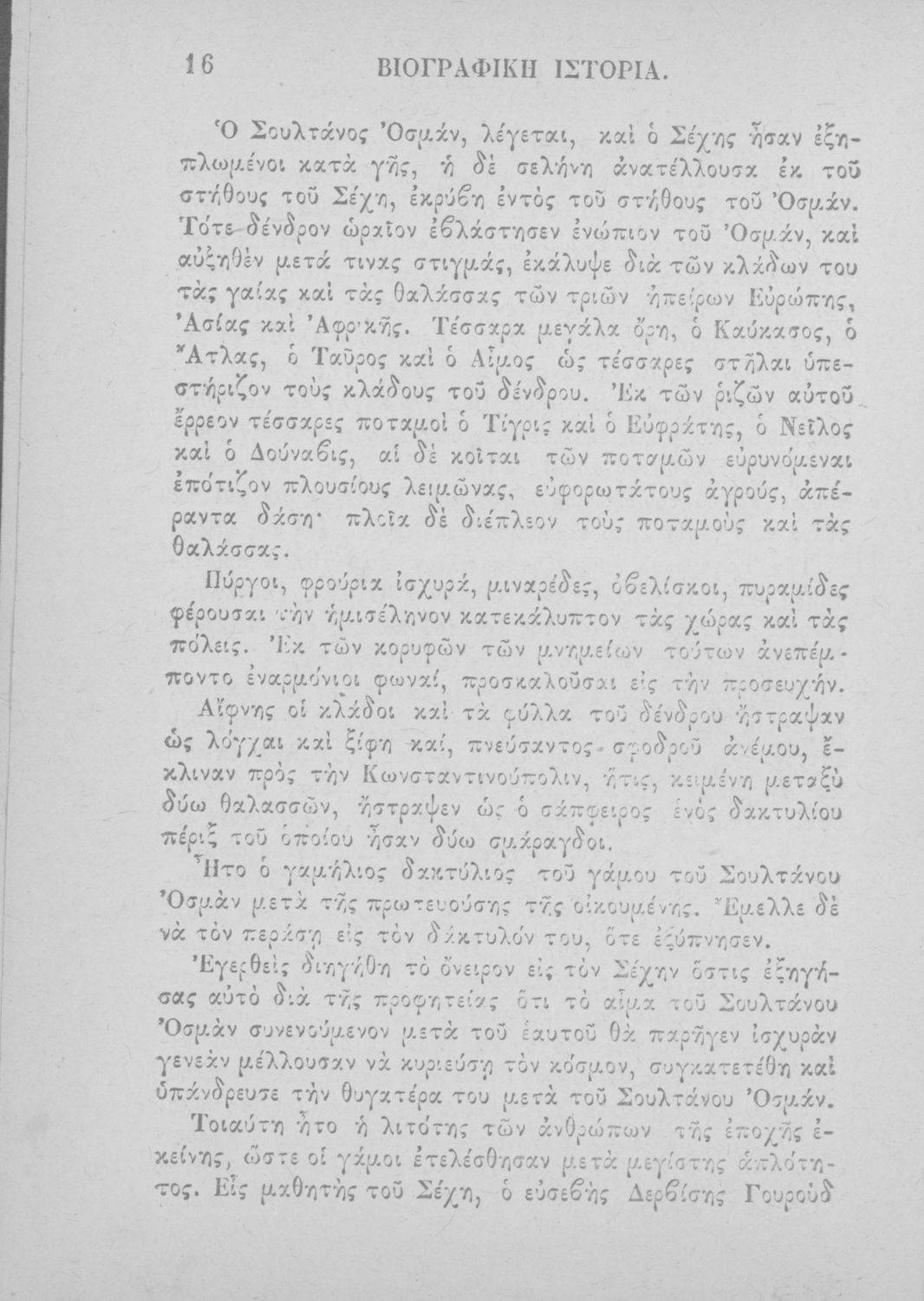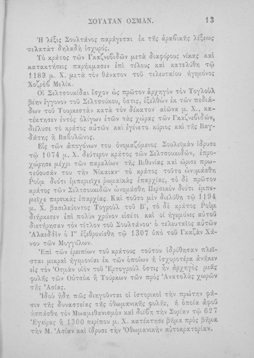 Βαθμίδα εκπαίδευσης: Πρωτοβάθμια Μάθημα: Ιστορία Γλώσσα: Καθαρεύουσα Παρουσίαση περιεχομένου: Σχολικό εγχειρίδιο Ιστορίας Δημοτικού που περιλαμβάνει βιογραφίες των Σουλτάνων της Οθωμανικής αυτοκρατορίας από την περίοδο του Οσμάν του νικητή (1299 μ. Χ.) μέχρι τα χρόνια του Σουλεϊμάν Α΄ (1520 μ. Χ.) |