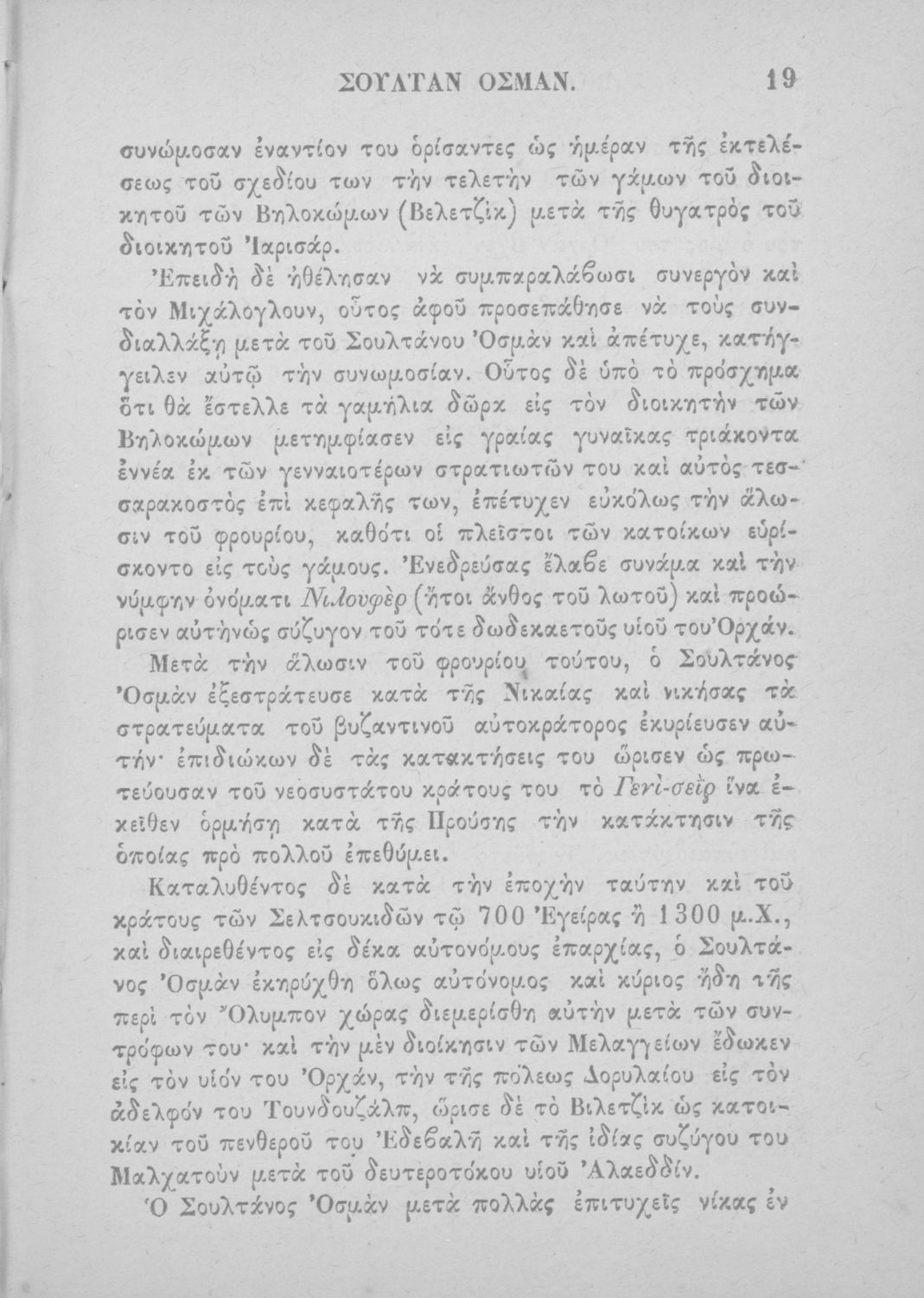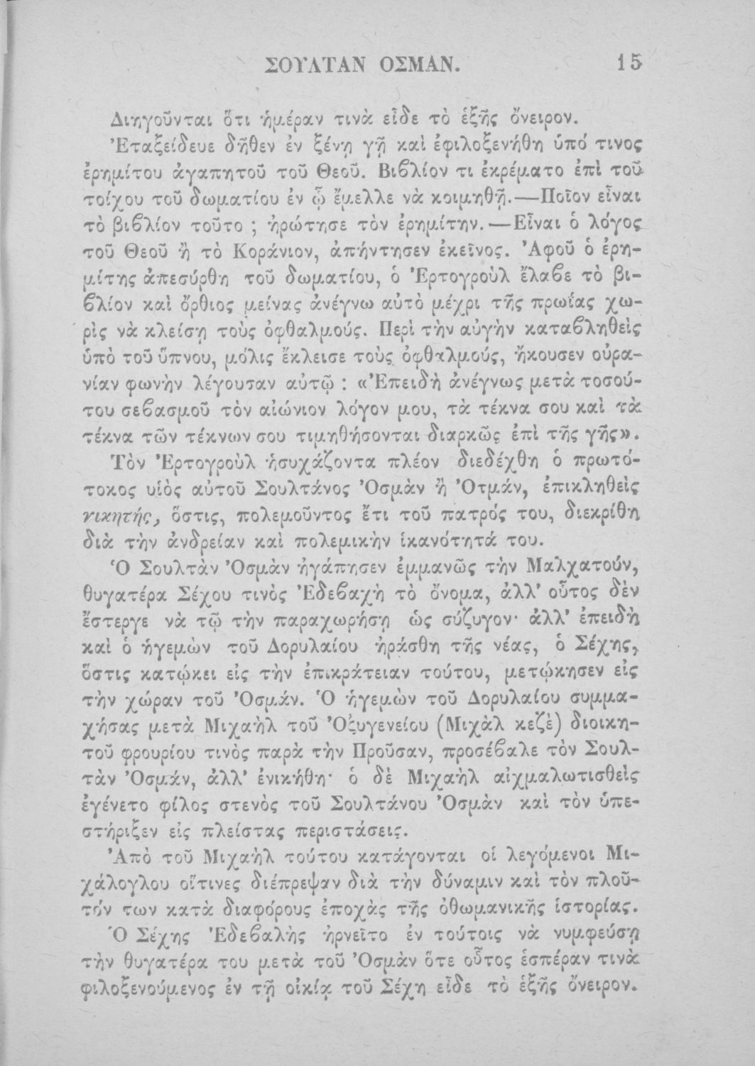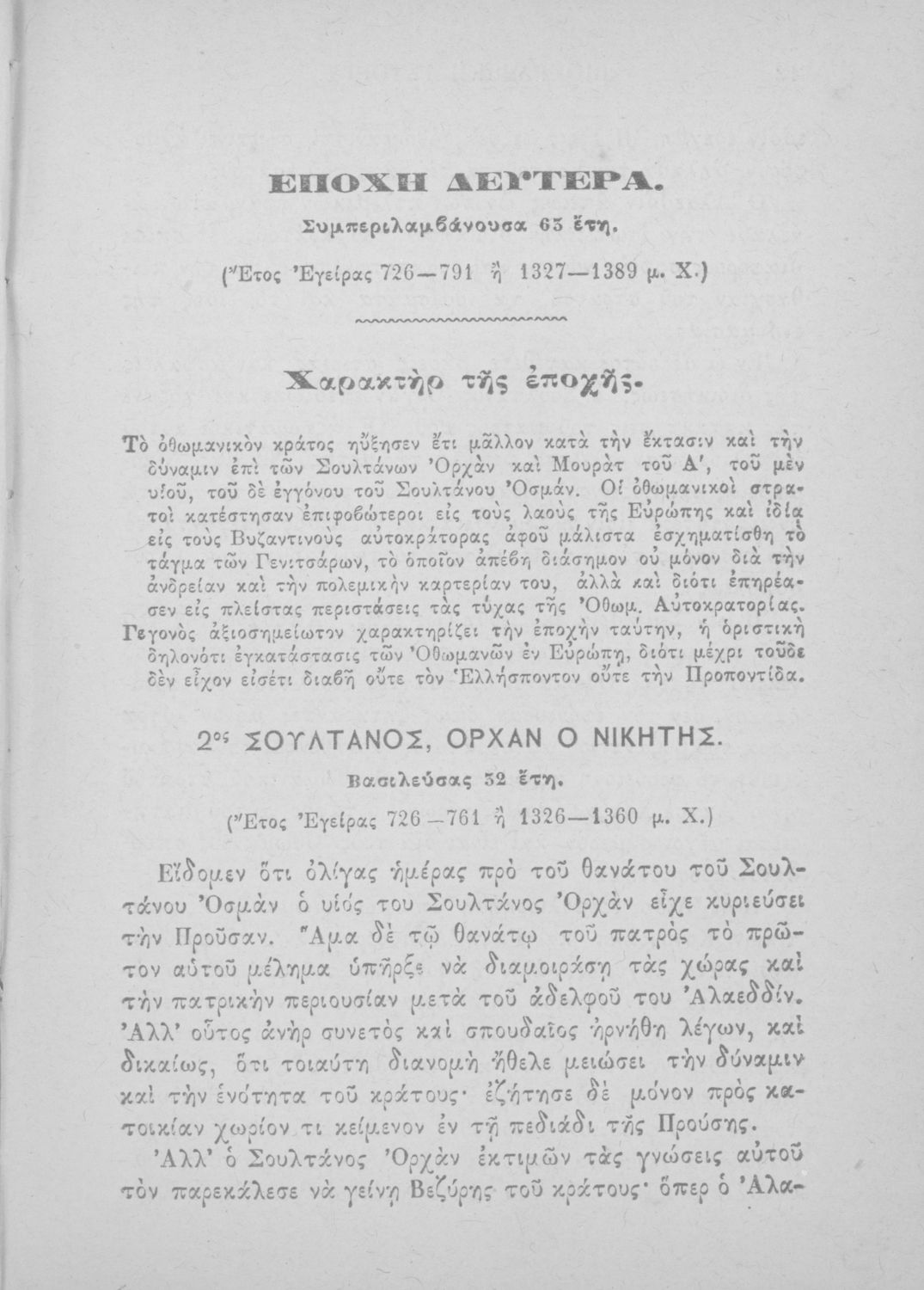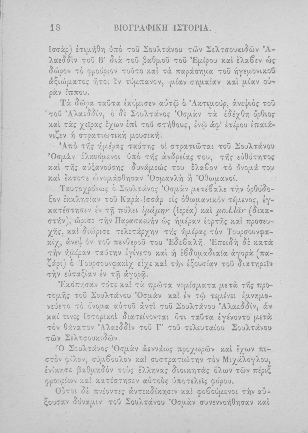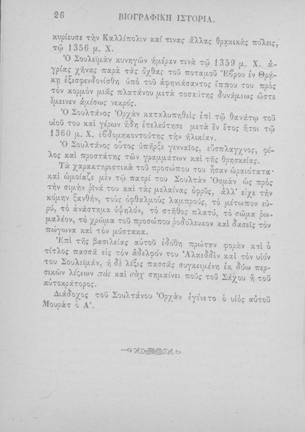 Βαθμίδα εκπαίδευσης: Πρωτοβάθμια Μάθημα: Ιστορία Γλώσσα: Καθαρεύουσα Παρουσίαση περιεχομένου: Σχολικό εγχειρίδιο Ιστορίας Δημοτικού που περιλαμβάνει βιογραφίες των Σουλτάνων της Οθωμανικής αυτοκρατορίας από την περίοδο του Οσμάν του νικητή (1299 μ. Χ.) μέχρι τα χρόνια του Σουλεϊμάν Α΄ (1520 μ. Χ.) |