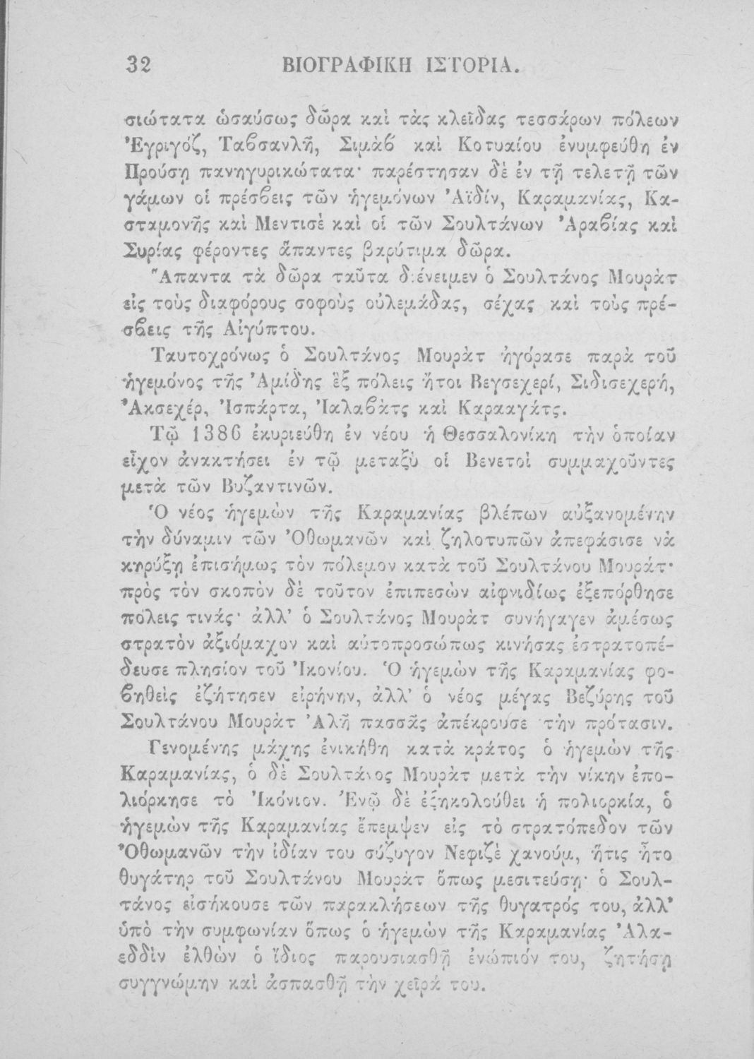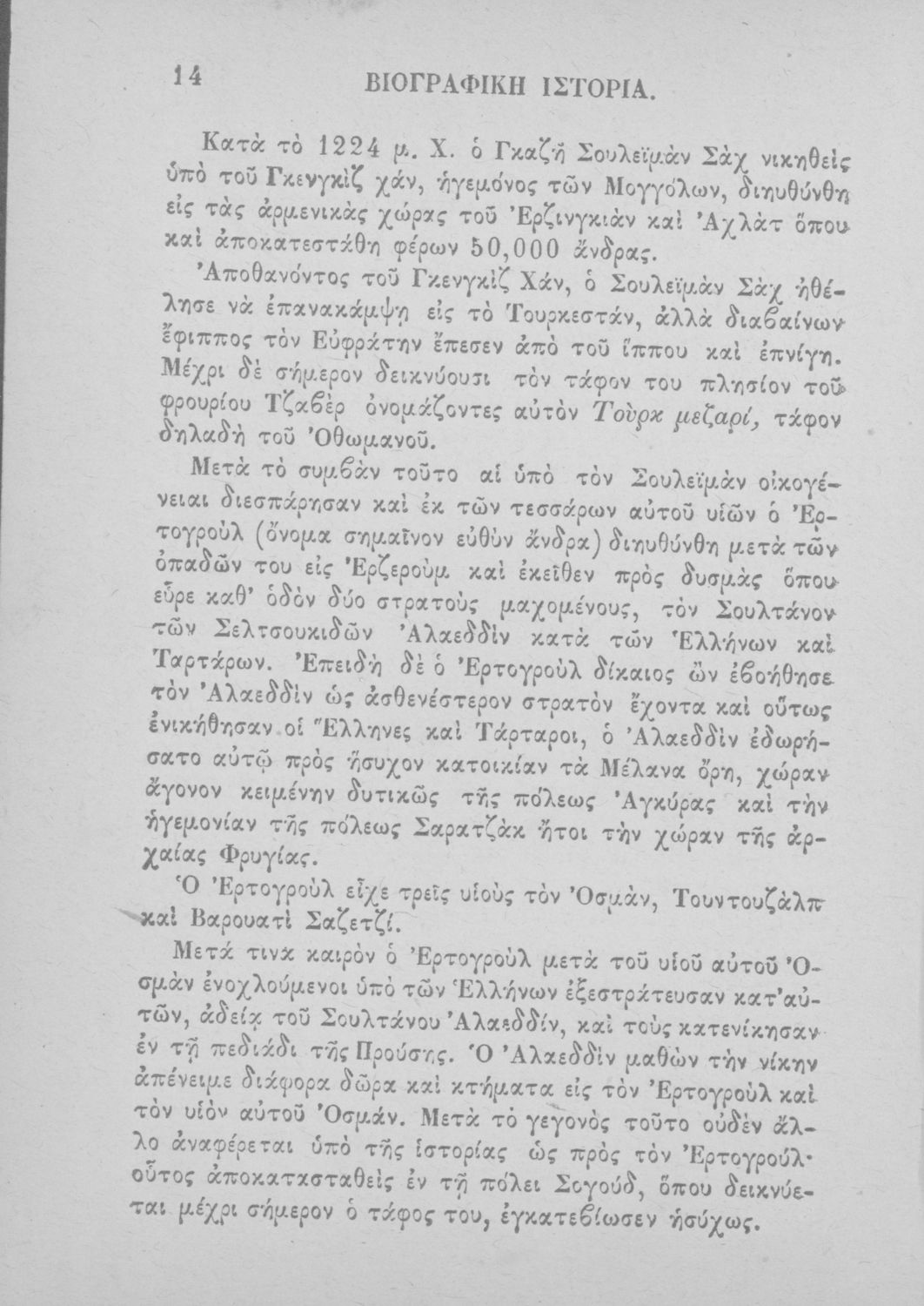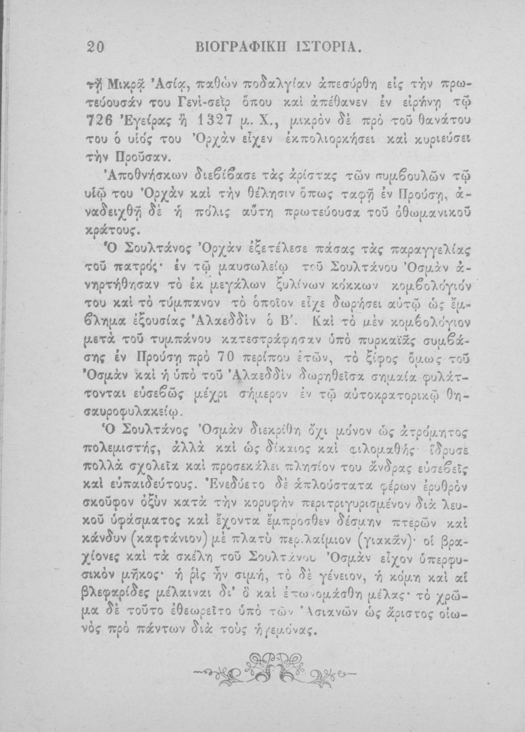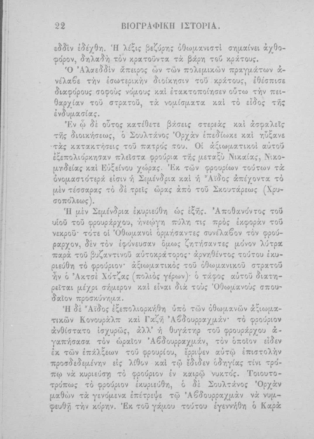 Βαθμίδα εκπαίδευσης: Πρωτοβάθμια Μάθημα: Ιστορία Γλώσσα: Καθαρεύουσα Παρουσίαση περιεχομένου: Σχολικό εγχειρίδιο Ιστορίας Δημοτικού που περιλαμβάνει βιογραφίες των Σουλτάνων της Οθωμανικής αυτοκρατορίας από την περίοδο του Οσμάν του νικητή (1299 μ. Χ.) μέχρι τα χρόνια του Σουλεϊμάν Α΄ (1520 μ. Χ.) |