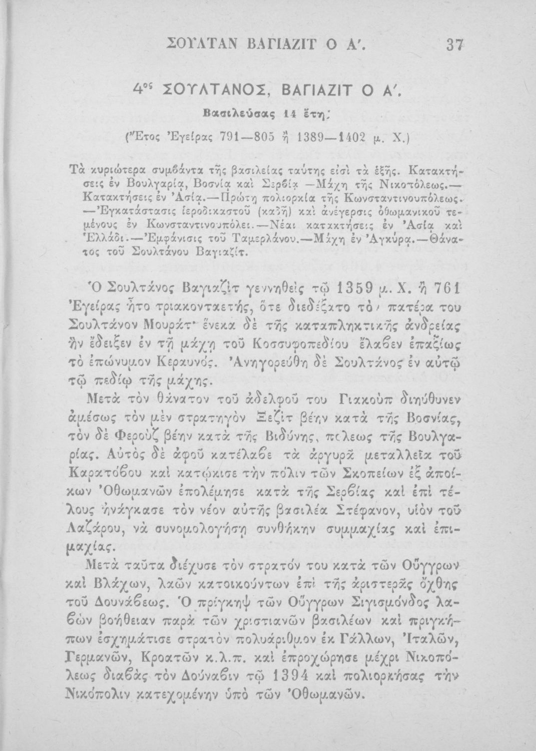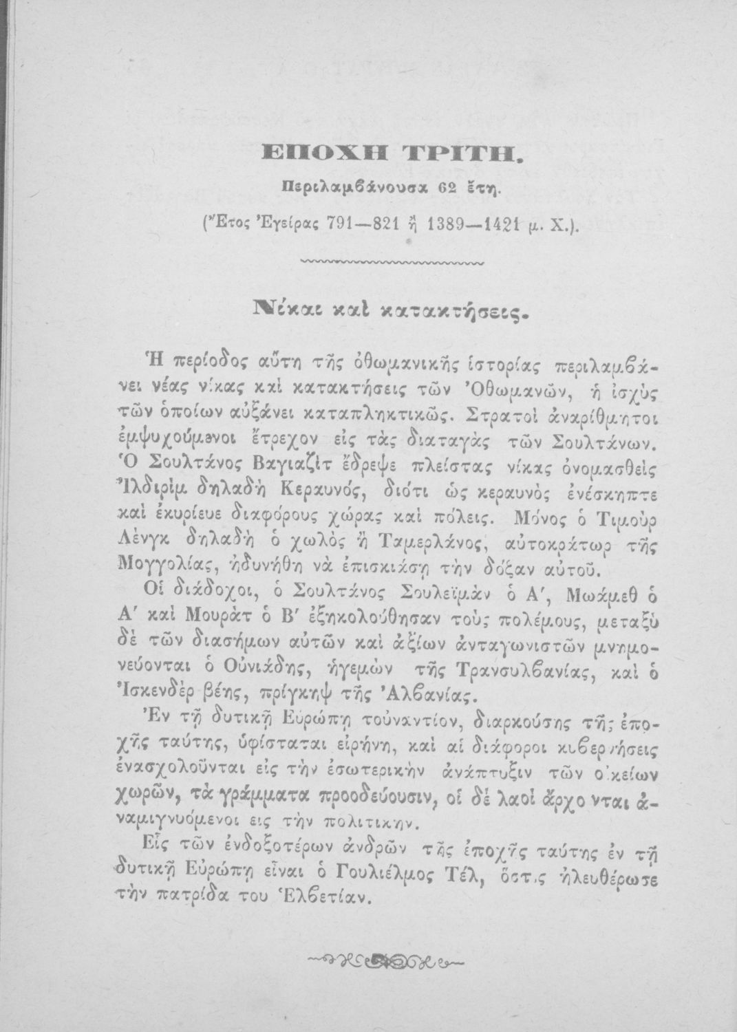 Βαθμίδα εκπαίδευσης: Πρωτοβάθμια Μάθημα: Ιστορία Γλώσσα: Καθαρεύουσα Παρουσίαση περιεχομένου: Σχολικό εγχειρίδιο Ιστορίας Δημοτικού που περιλαμβάνει βιογραφίες των Σουλτάνων της Οθωμανικής αυτοκρατορίας από την περίοδο του Οσμάν του νικητή (1299 μ. Χ.) μέχρι τα χρόνια του Σουλεϊμάν Α΄ (1520 μ. Χ.) |
