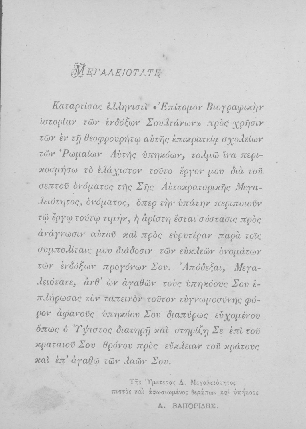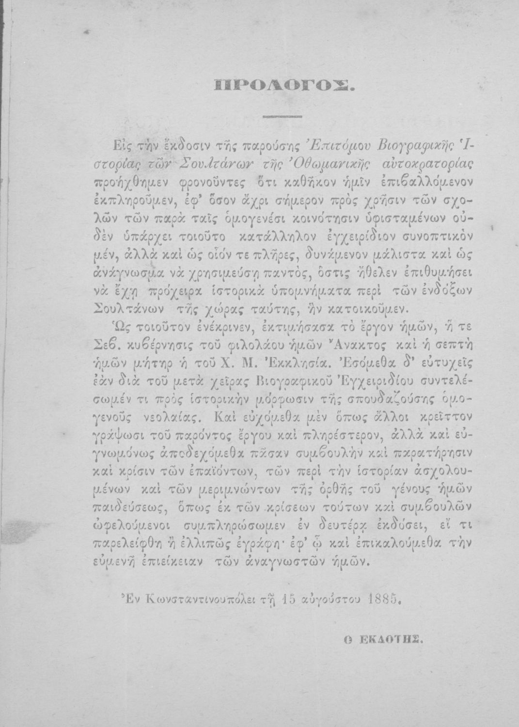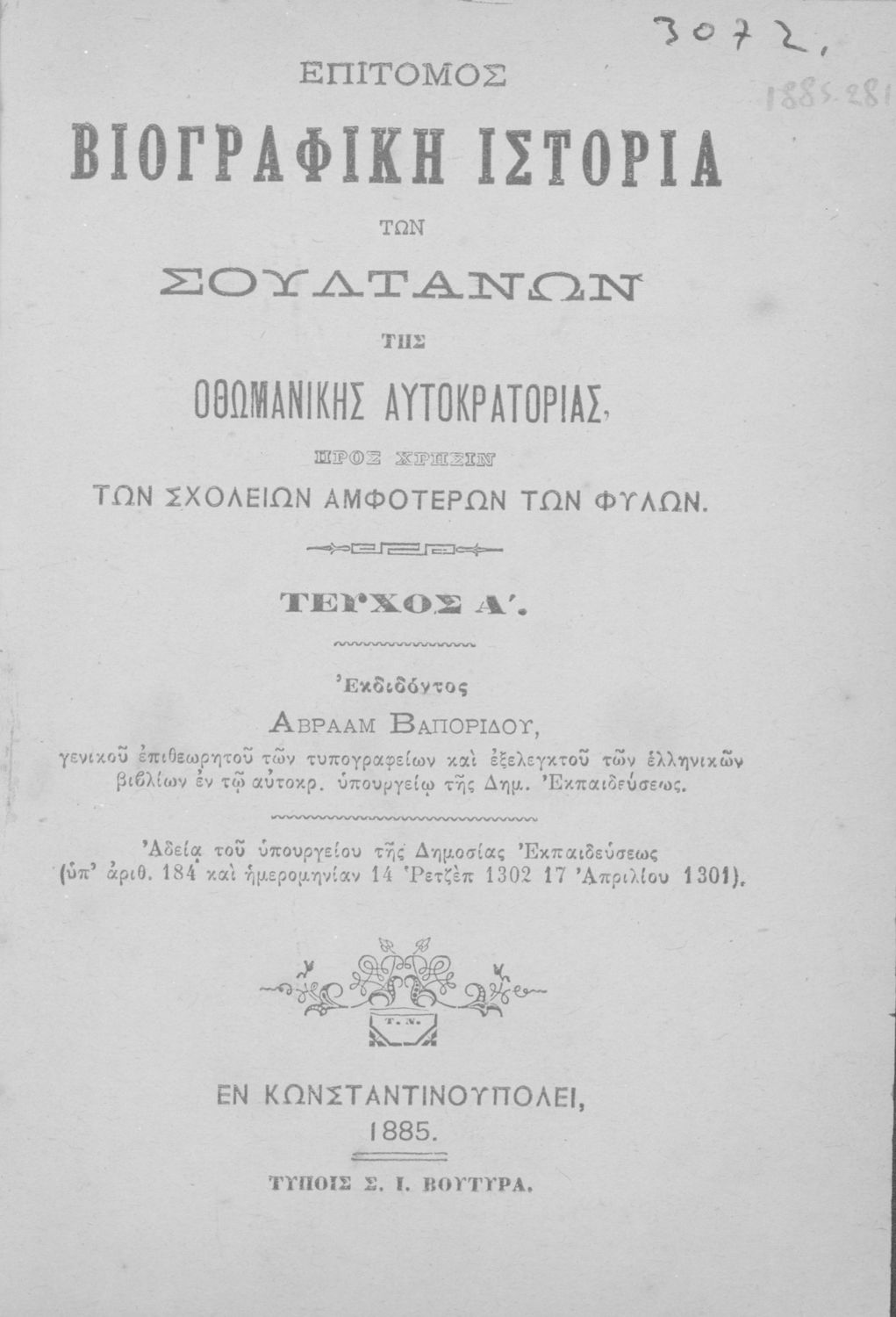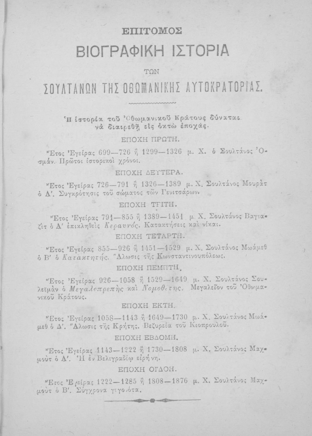 Τίτλος: Επίτομος βιογραφική ιστορία των σουλτάνων της Οθωμανικής αυτοκρατορίας προς χρήσιν των σχολείων αμφοτέρων των φύλων, τεύχος Α΄