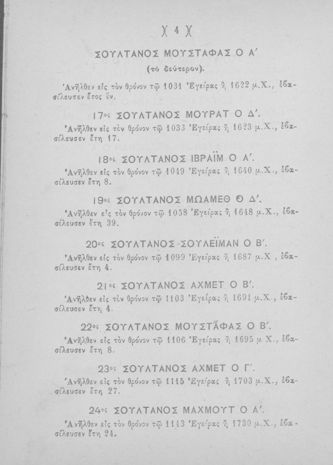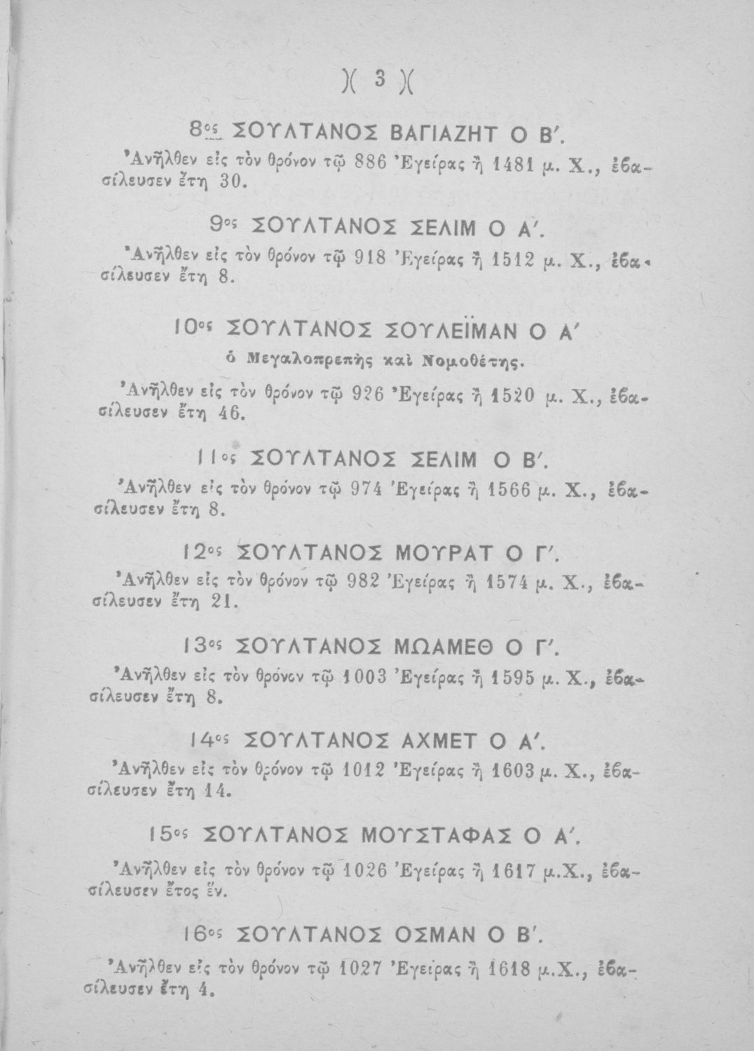 Σχολικό εγχειρίδιο Ιστορίας Δημοτικού που περιλαμβάνει βιογραφίες των Σουλτάνων της Οθωμανικής αυτοκρατορίας από την περίοδο του Οσμάν του νικητή (1299 μ. Χ.) μέχρι τα χρόνια του Σουλεϊμάν Α΄ (1520 μ. Χ.)
