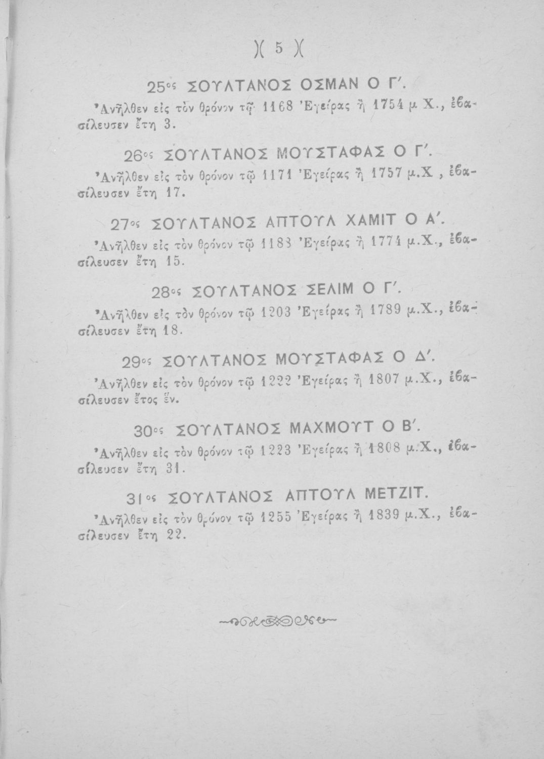 Σχολικό εγχειρίδιο Ιστορίας Δημοτικού που περιλαμβάνει βιογραφίες των Σουλτάνων της Οθωμανικής αυτοκρατορίας από την περίοδο του Σελίμ του Β΄ (1574 μ. Χ.) μέχρι τα χρόνια του Απτούλ Μετζίτ (1839 μ. Χ.)