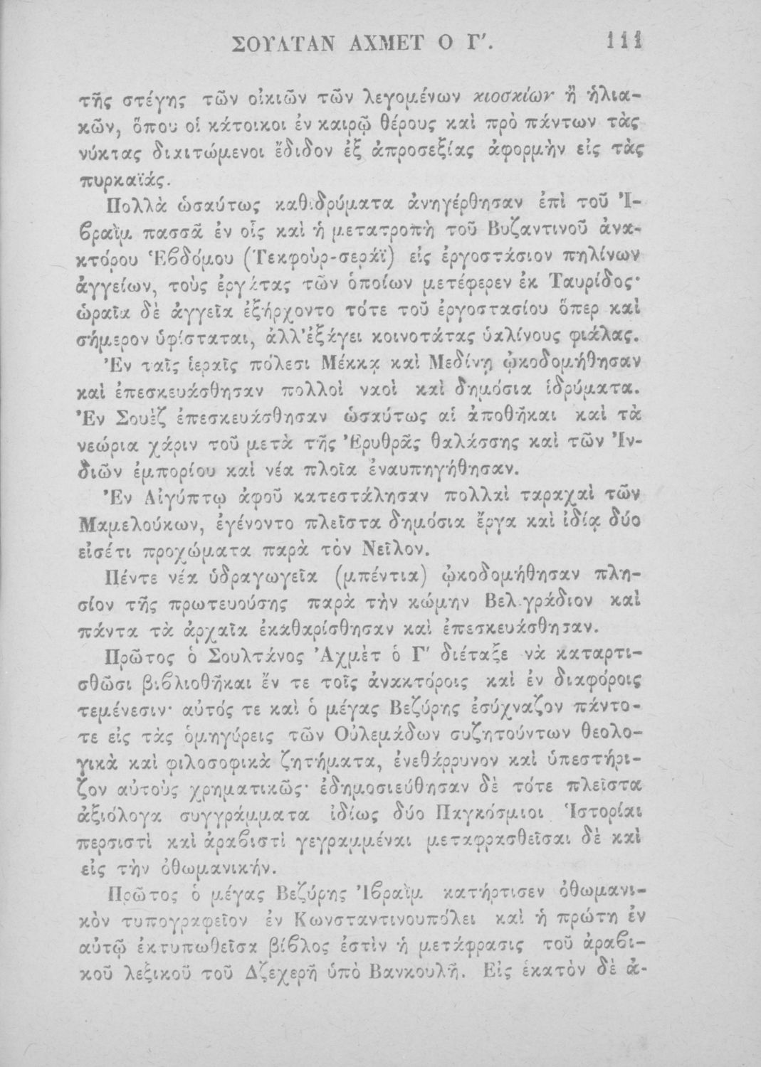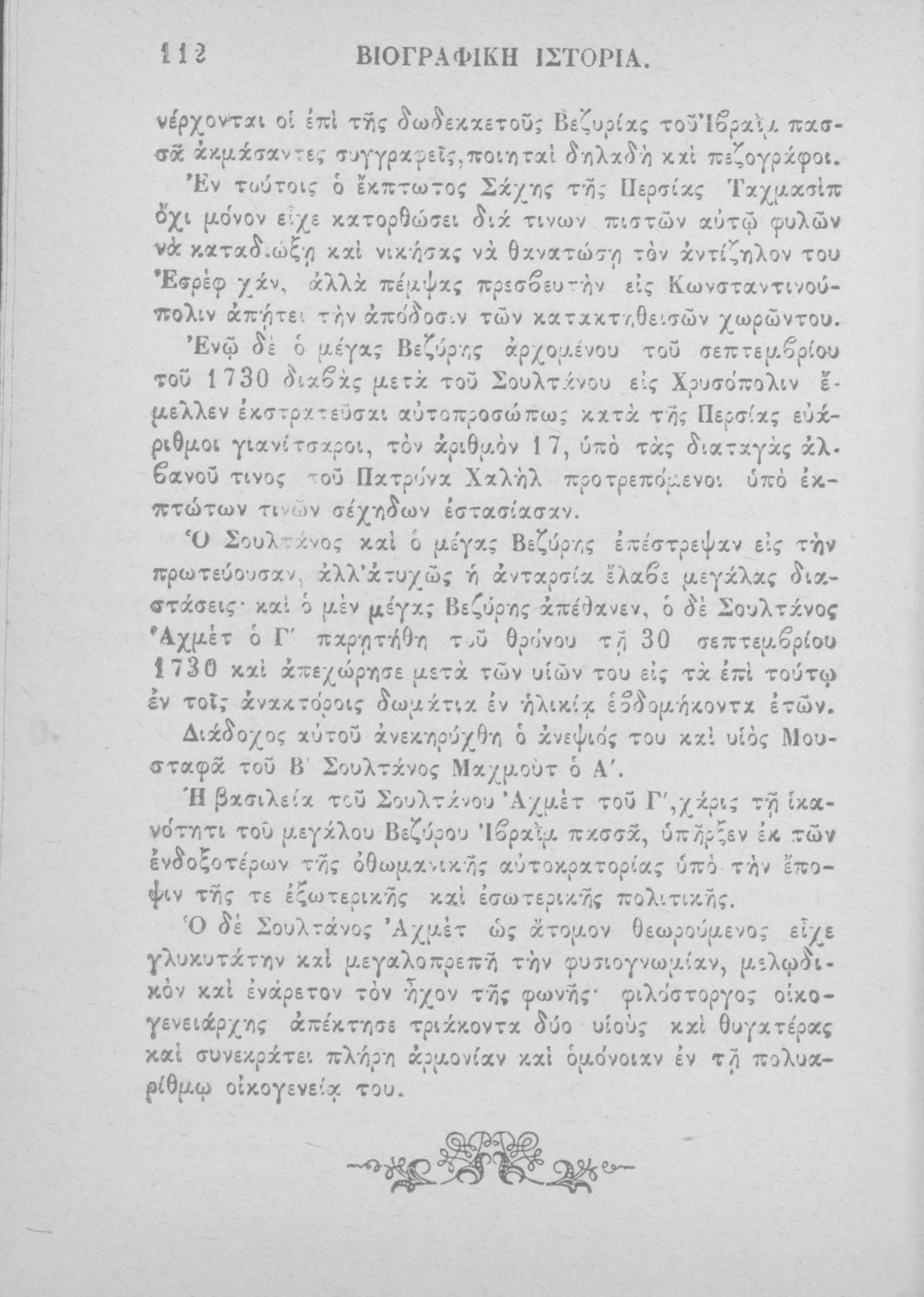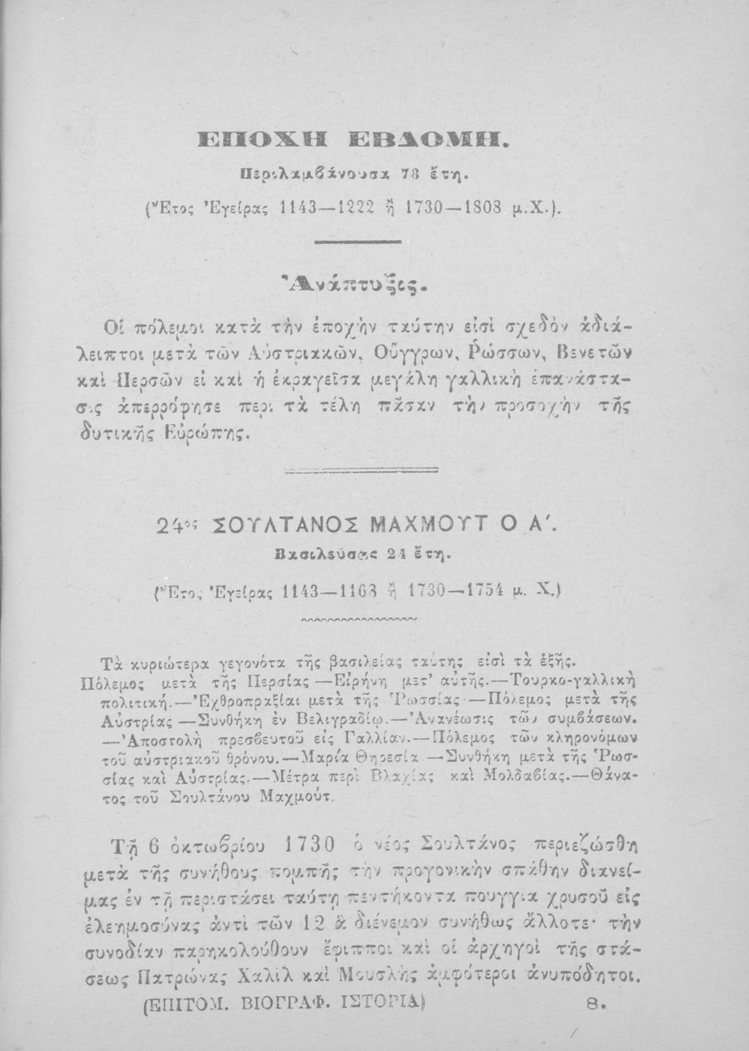 Σχολικό εγχειρίδιο Ιστορίας Δημοτικού που περιλαμβάνει βιογραφίες των Σουλτάνων της Οθωμανικής αυτοκρατορίας από την περίοδο του Σελίμ του Β΄ (1574 μ. Χ.) μέχρι τα χρόνια του Απτούλ Μετζίτ (1839 μ. Χ.)