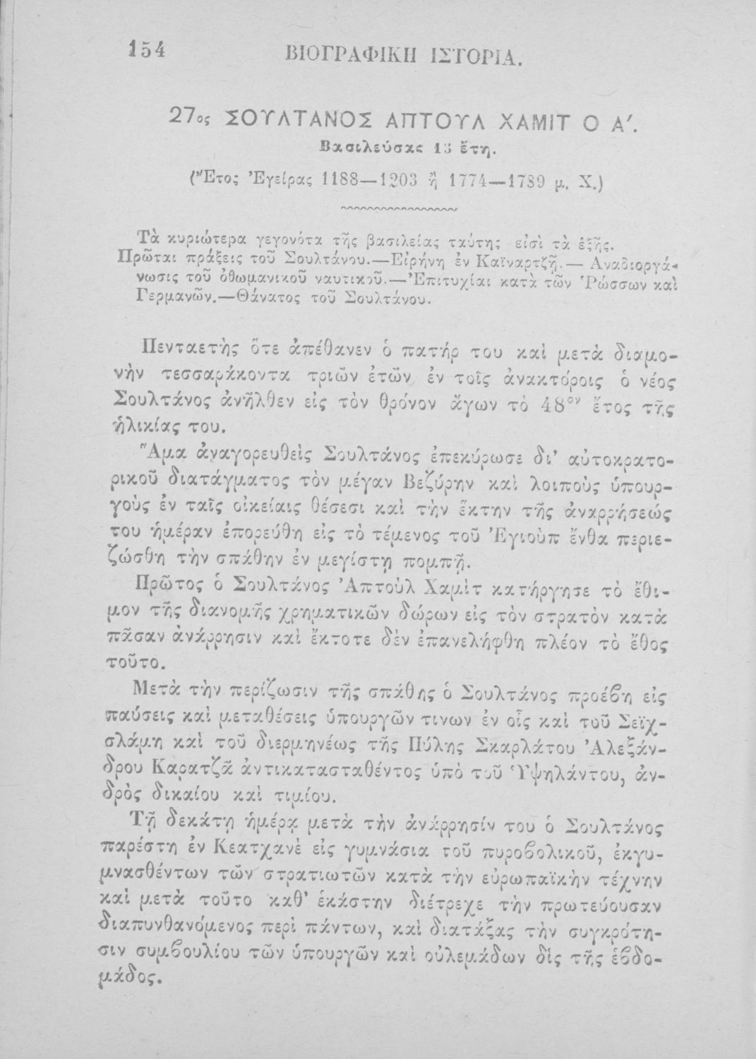 Σχολικό εγχειρίδιο Ιστορίας Δημοτικού που περιλαμβάνει βιογραφίες των Σουλτάνων της Οθωμανικής αυτοκρατορίας από την περίοδο του Σελίμ του Β΄ (1574 μ. Χ.) μέχρι τα χρόνια του Απτούλ Μετζίτ (1839 μ. Χ.)