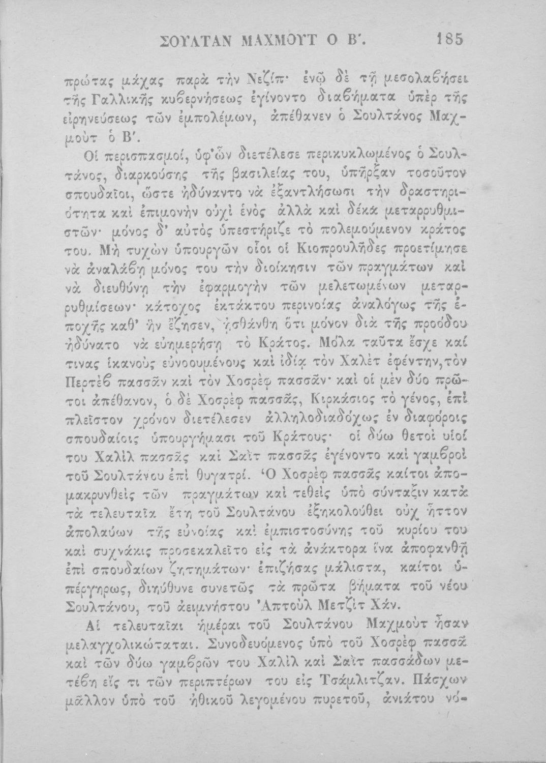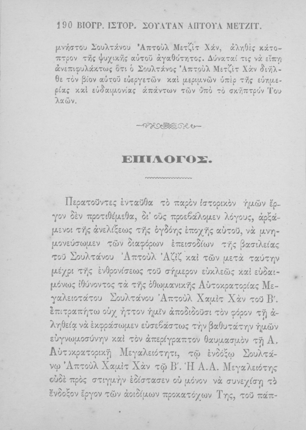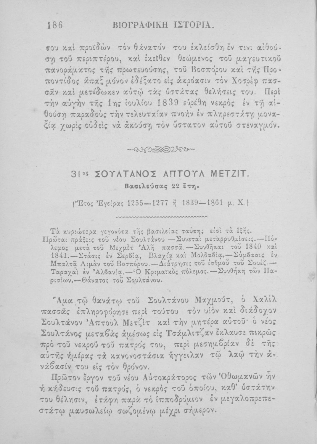 Σχολικό εγχειρίδιο Ιστορίας Δημοτικού που περιλαμβάνει βιογραφίες των Σουλτάνων της Οθωμανικής αυτοκρατορίας από την περίοδο του Σελίμ του Β΄ (1574 μ. Χ.) μέχρι τα χρόνια του Απτούλ Μετζίτ (1839 μ. Χ.)