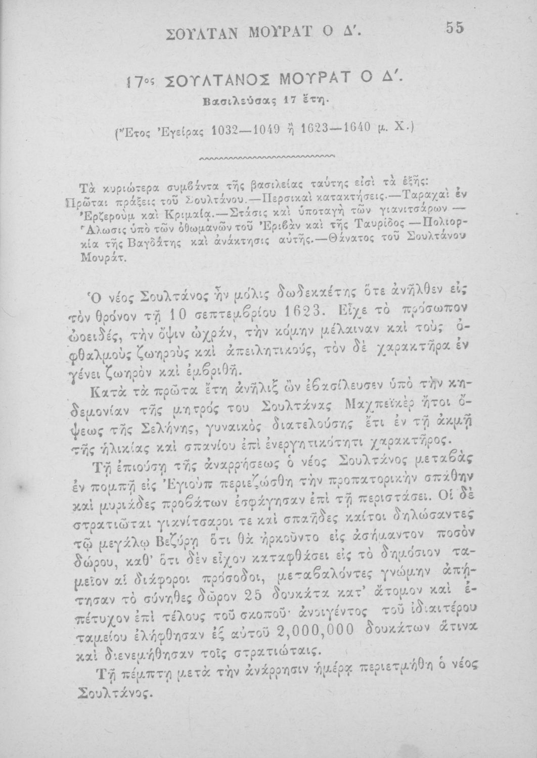 Σχολικό εγχειρίδιο Ιστορίας Δημοτικού που περιλαμβάνει βιογραφίες των Σουλτάνων της Οθωμανικής αυτοκρατορίας από την περίοδο του Σελίμ του Β΄ (1574 μ. Χ.) μέχρι τα χρόνια του Απτούλ Μετζίτ (1839 μ. Χ.)