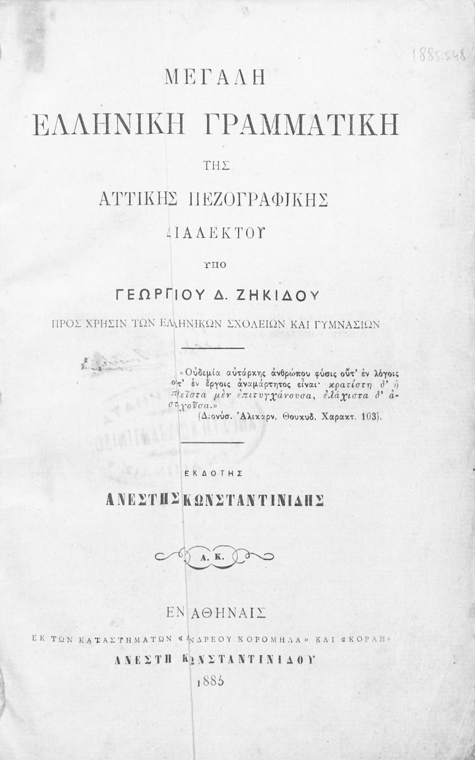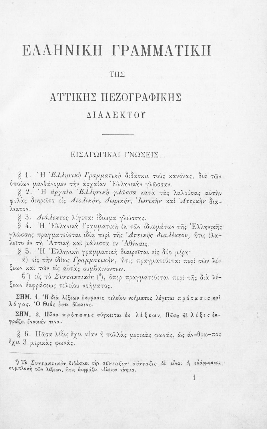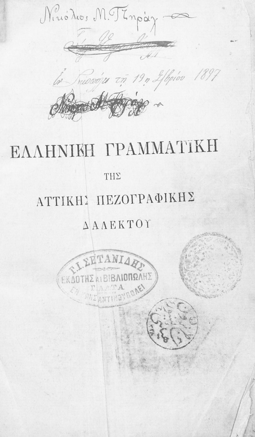 Σχολικό εγχειρίδιο Αρχαίων Ελληνικών για τα Ελληνικά Σχολεία και Γυμνάσια που περιλαμβάνει γραμματική της αρχαίας ελληνικής και είναι χωρισμένο σε φθογγολογικό, τυπολογικό και ετυμολογικό μέρος.