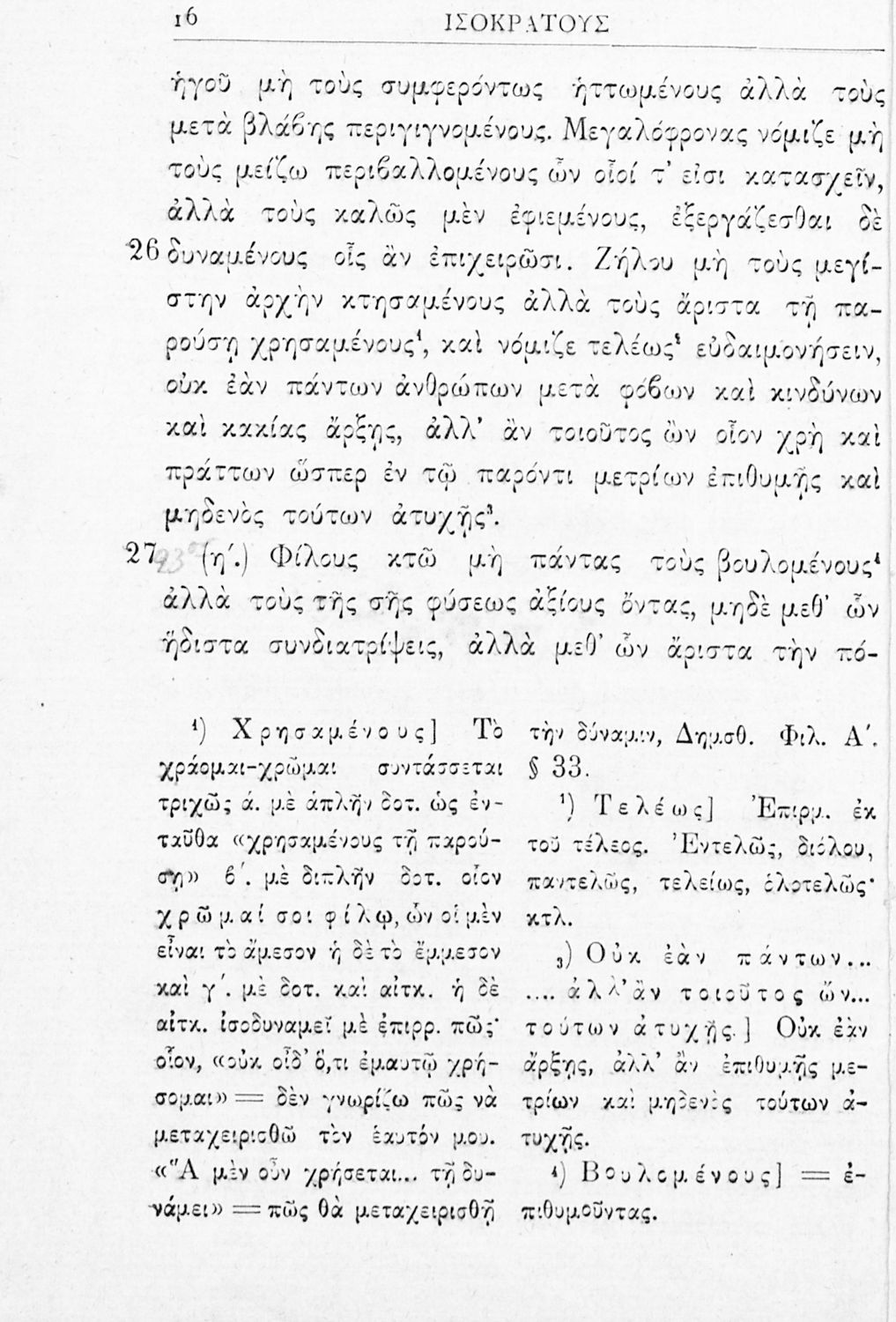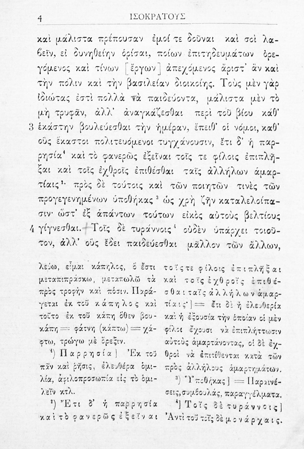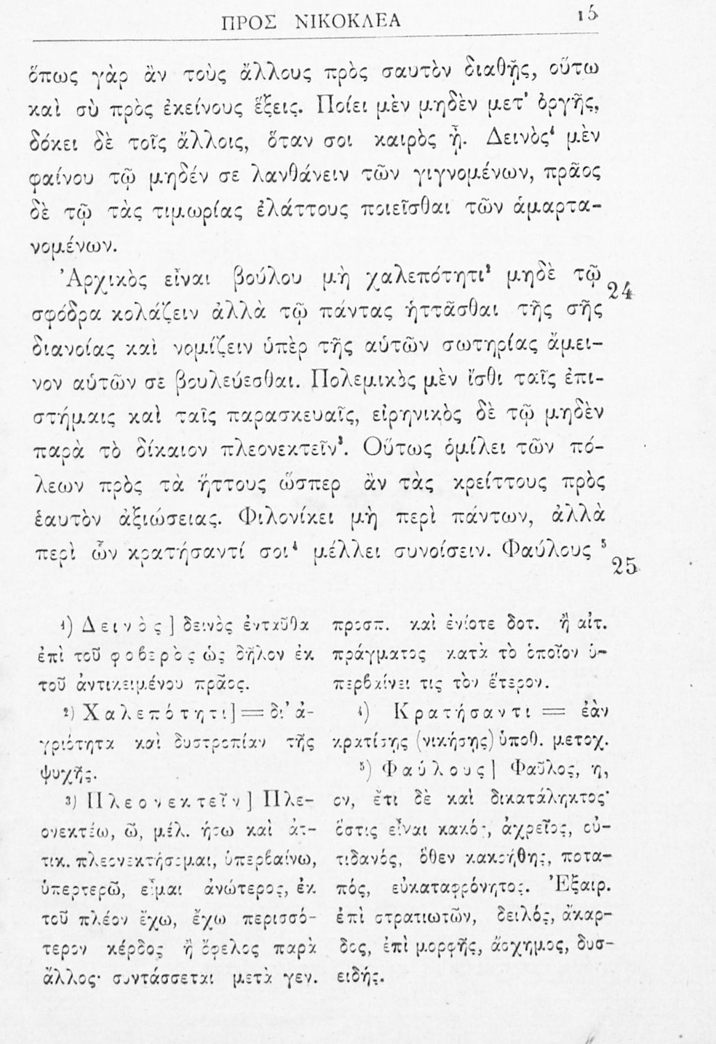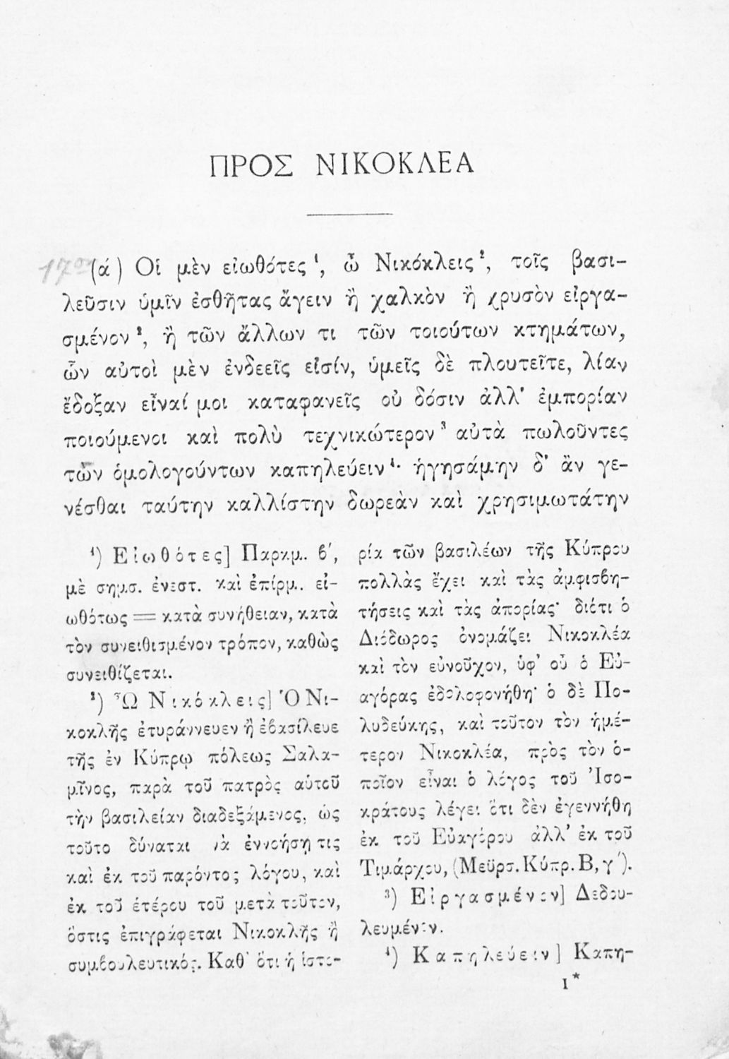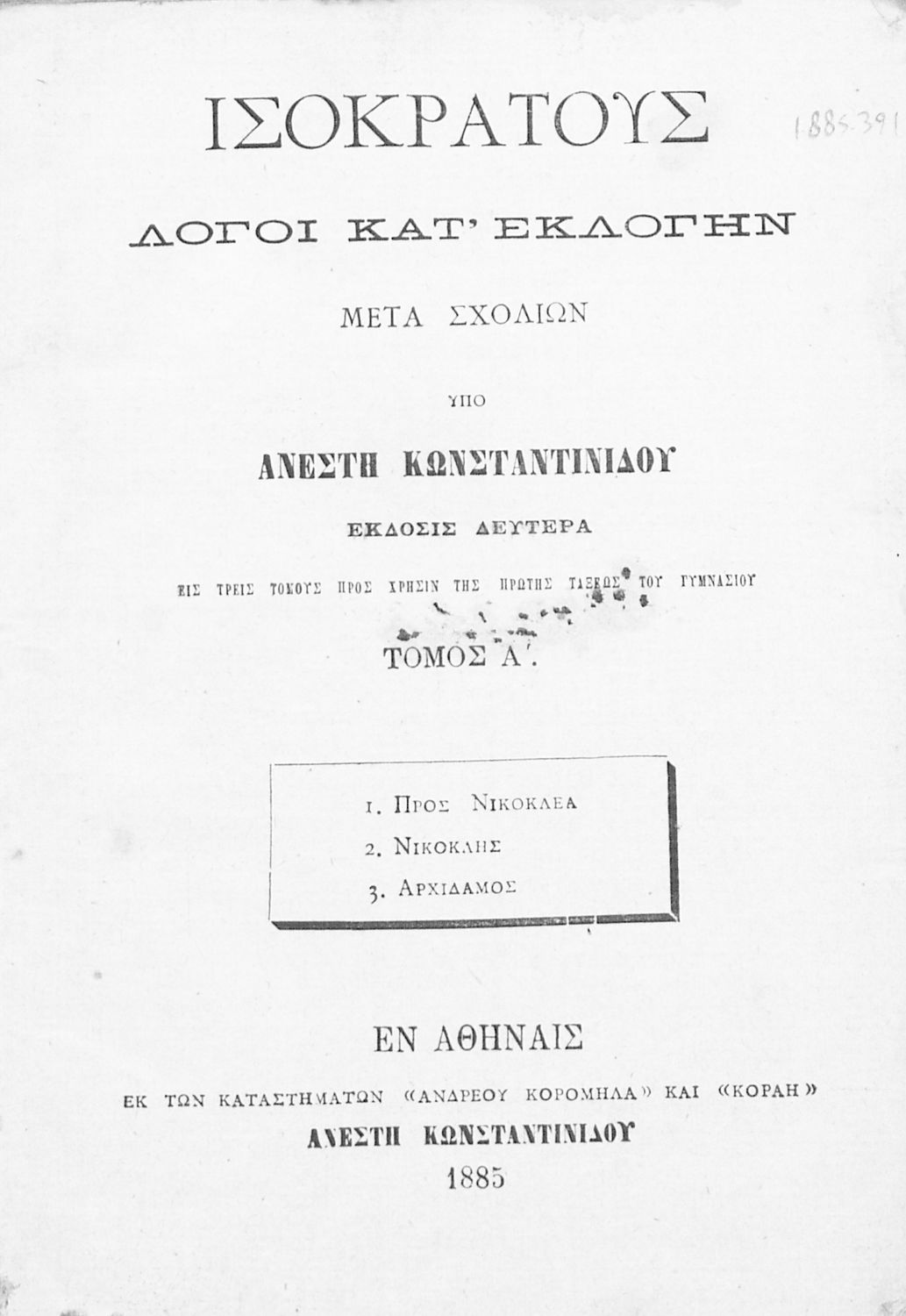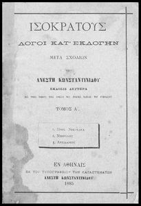 Βαθμίδα εκπαίδευσης: Δευτεροβάθμια Τάξη: Α' Γυμνασίου Μάθημα: Αρχαία Ελληνικά Γλώσσα: Καθαρεύουσα Παρουσίαση περιεχομένου: Σχολικό εγχειρίδιο Αρχαίων Ελληνικών Α΄ Γυμνασίου που περιλαμβάνει τους Λόγους του Ισοκράτη Προς Νικοκλέα, Νικοκλής και Αρχίδαμος και ερμηνευτικά σχόλια. |
