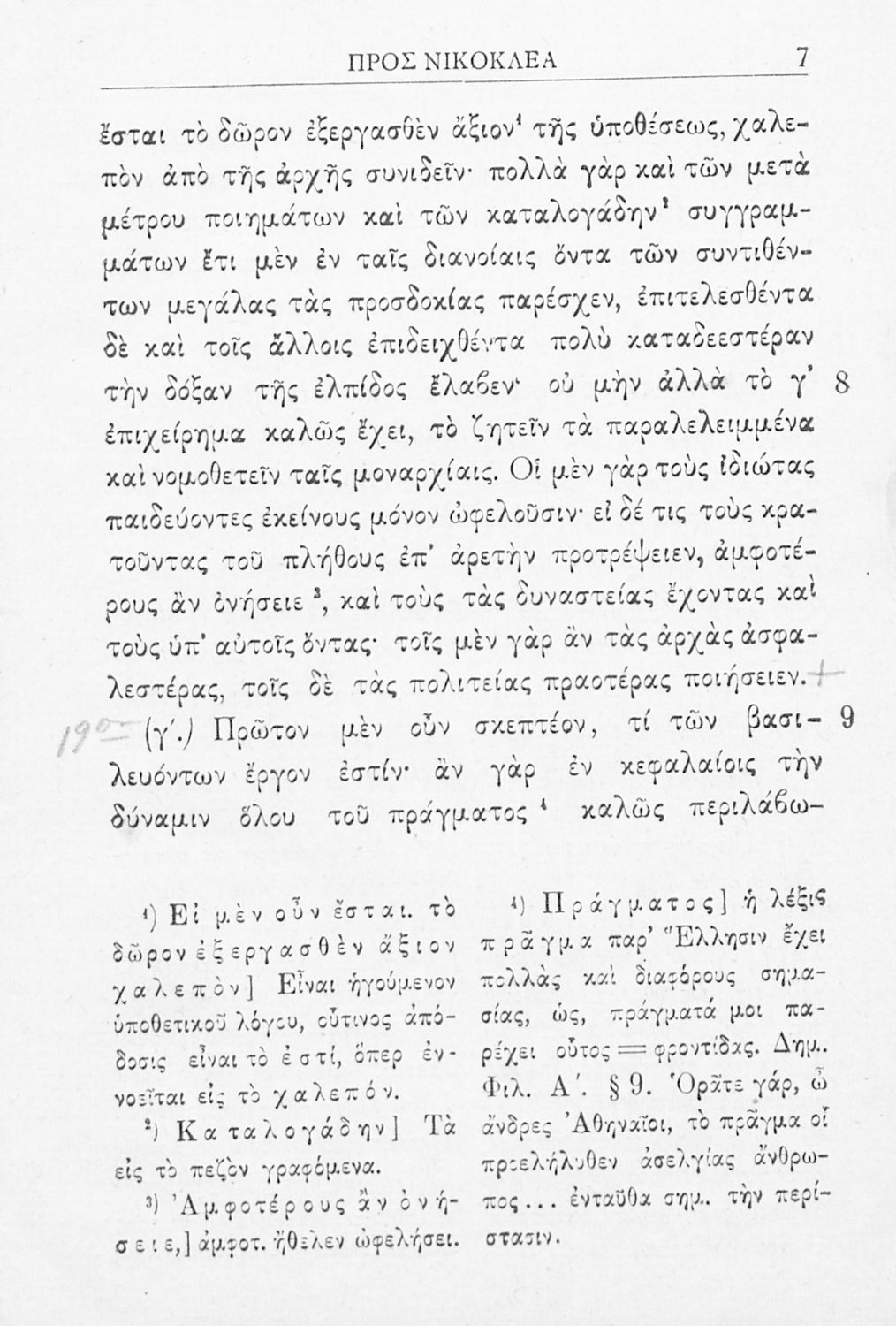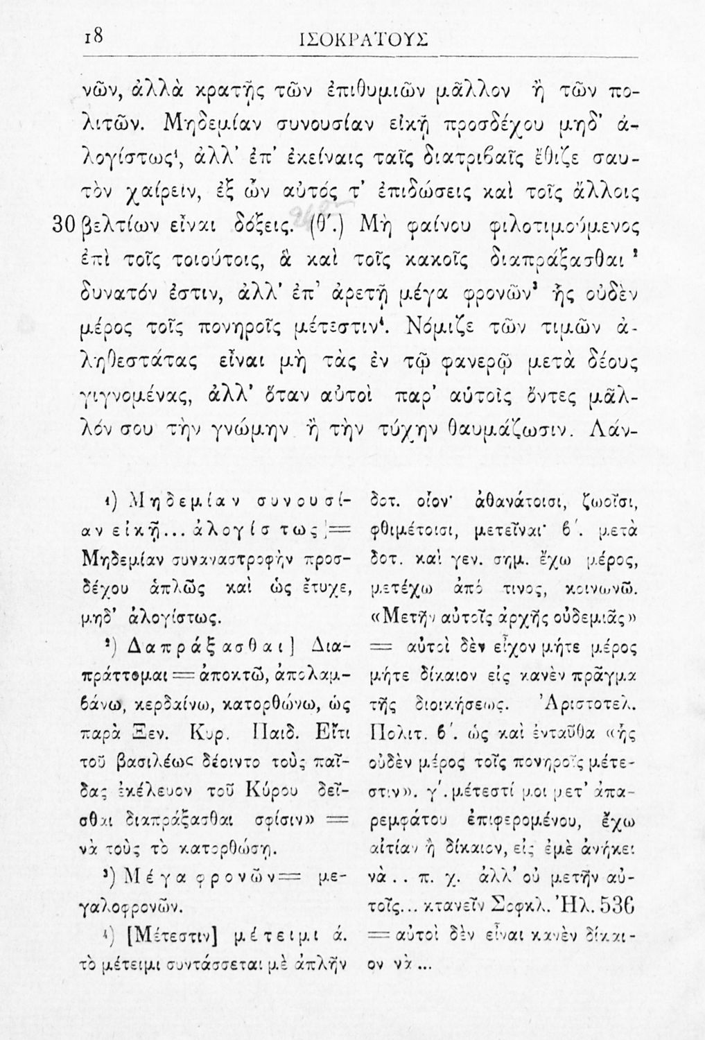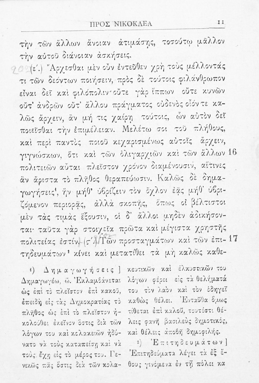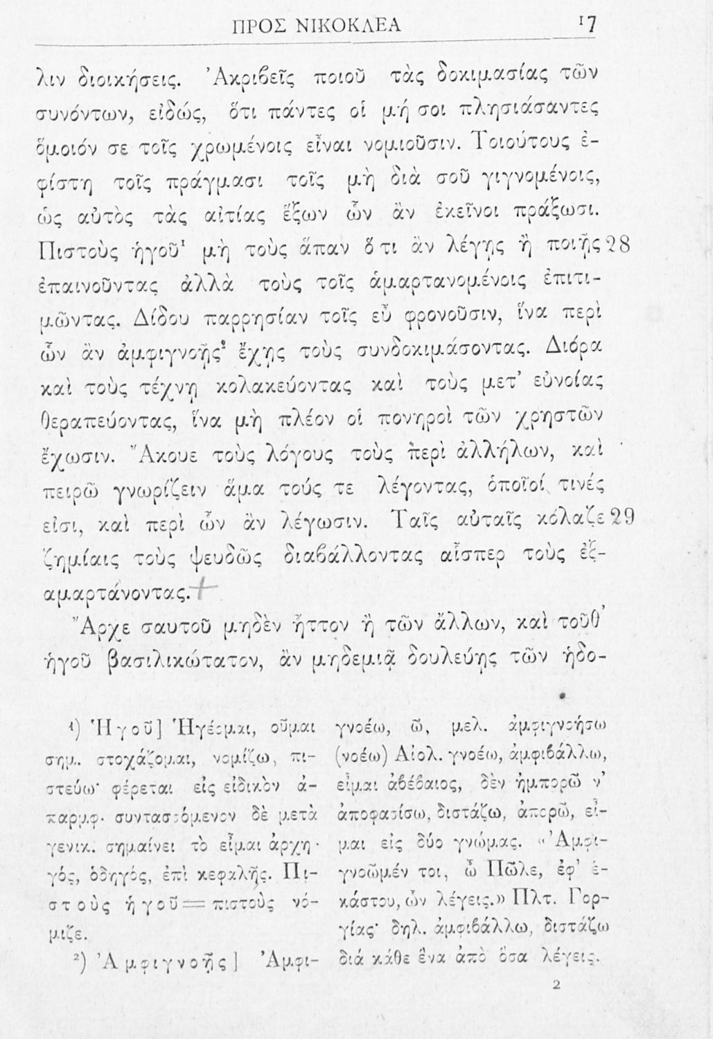 Βαθμίδα εκπαίδευσης: Δευτεροβάθμια Τάξη: Α' Γυμνασίου Μάθημα: Αρχαία Ελληνικά Γλώσσα: Καθαρεύουσα Παρουσίαση περιεχομένου: Σχολικό εγχειρίδιο Αρχαίων Ελληνικών Α΄ Γυμνασίου που περιλαμβάνει τους Λόγους του Ισοκράτη Προς Νικοκλέα, Νικοκλής και Αρχίδαμος και ερμηνευτικά σχόλια. |