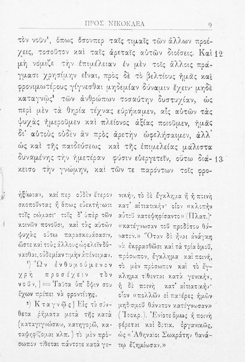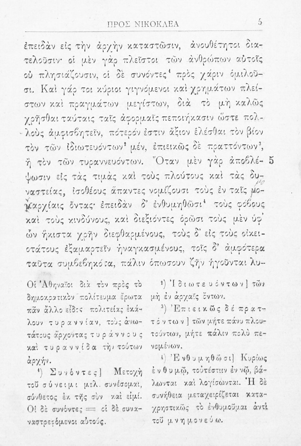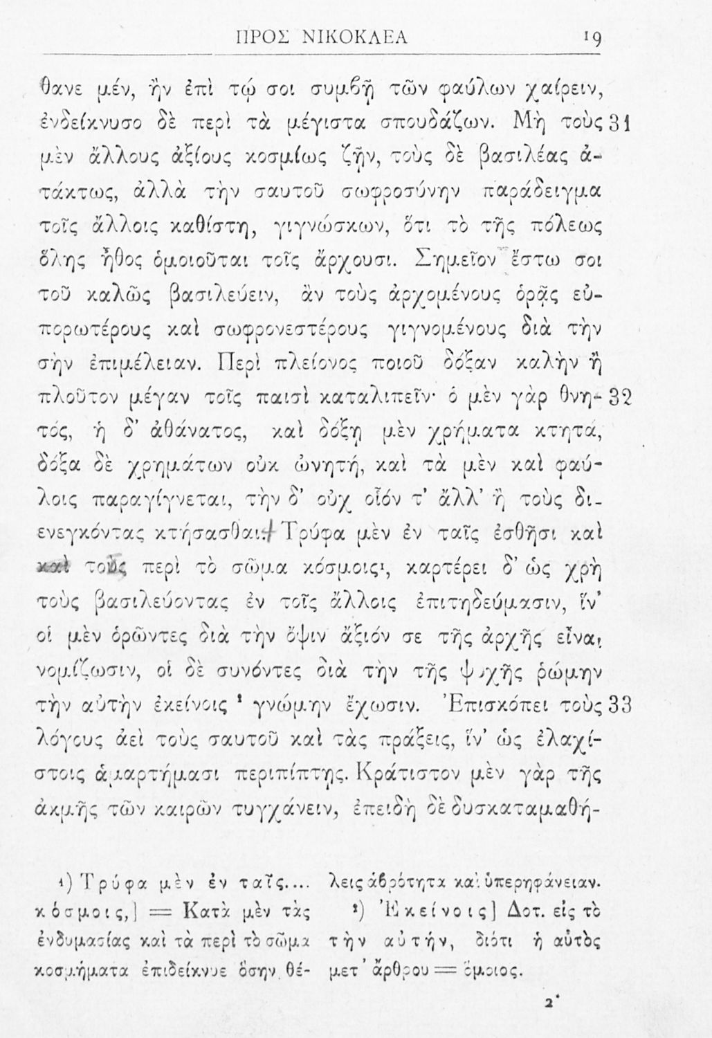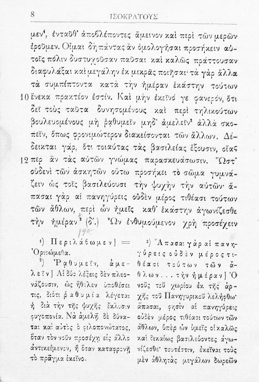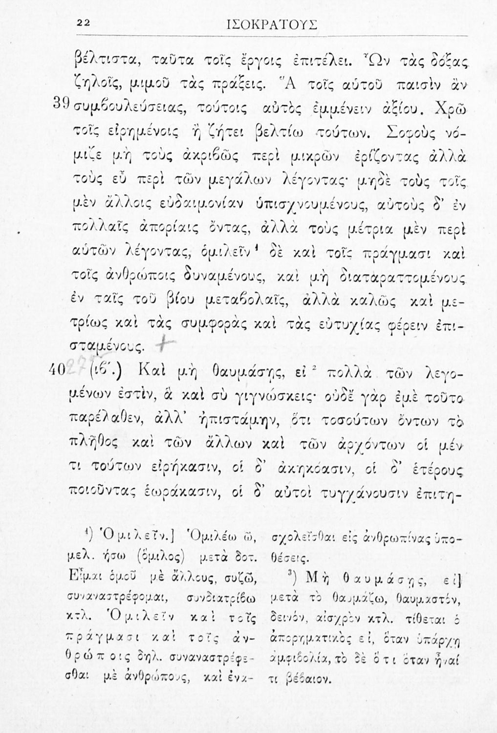 Βαθμίδα εκπαίδευσης: Δευτεροβάθμια Τάξη: Α' Γυμνασίου Μάθημα: Αρχαία Ελληνικά Γλώσσα: Καθαρεύουσα Παρουσίαση περιεχομένου: Σχολικό εγχειρίδιο Αρχαίων Ελληνικών Α΄ Γυμνασίου που περιλαμβάνει τους Λόγους του Ισοκράτη Προς Νικοκλέα, Νικοκλής και Αρχίδαμος και ερμηνευτικά σχόλια. |