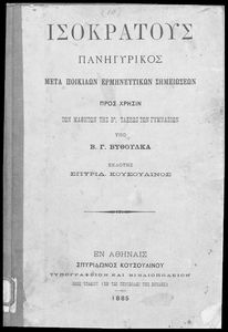 Βαθμίδα εκπαίδευσης: Δευτεροβάθμια Τάξη: Β' Γυμνασίου Μάθημα: Αρχαία Ελληνικά Γλώσσα: Καθαρεύουσα Παρουσίαση περιεχομένου: Σχολικό εγχειρίδιο Αρχαίων Ελληνικών Β΄ Γυμνασίου που περιλαμβάνει το Λόγο του Ισοκράτη Πανηγυρικός, εκτενή εισαγωγή στη δομή και το περιεχόμενο του έργοy και ερμηνευτικές παρατηρήσεις. |