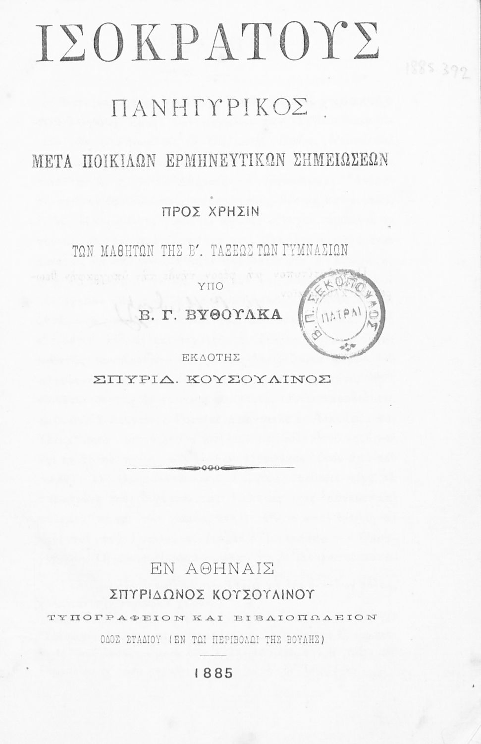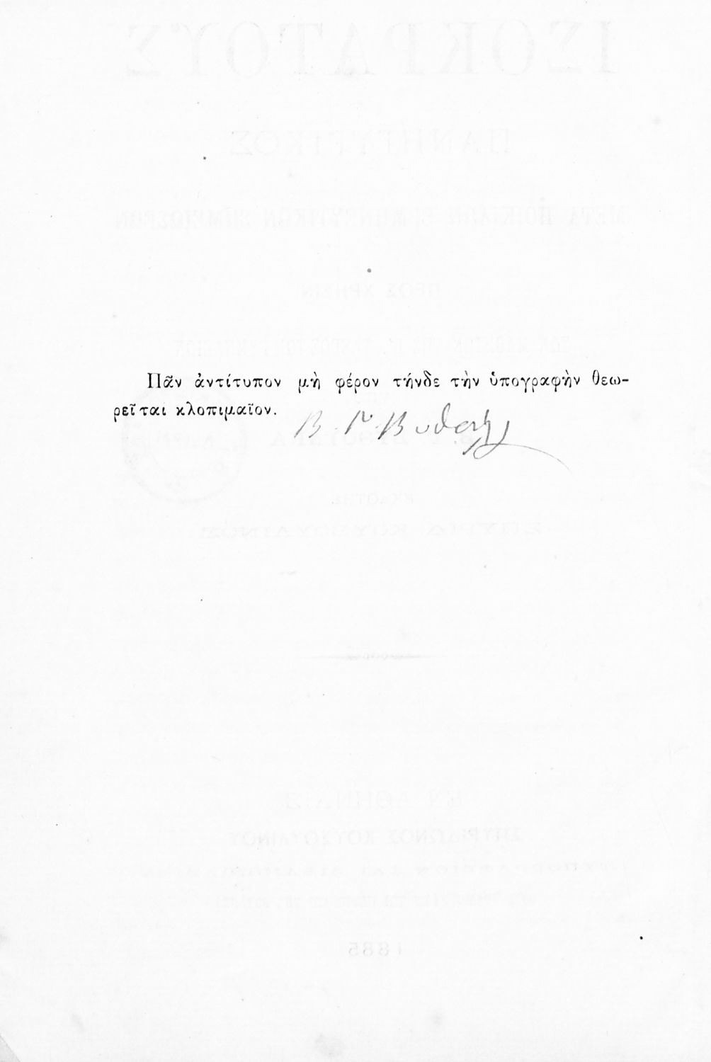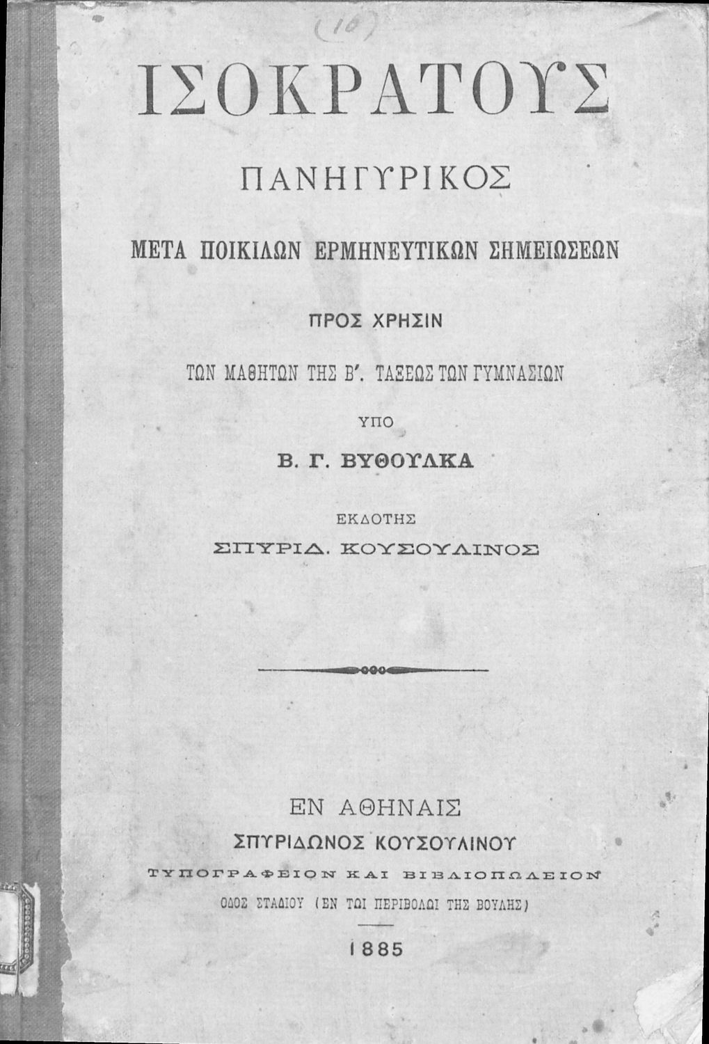 Εκδότης: Σπυρίδων Κουσουλίνος Έτος έκδοσης: 1885 Τόπος έκδοσης: Αθήνα |