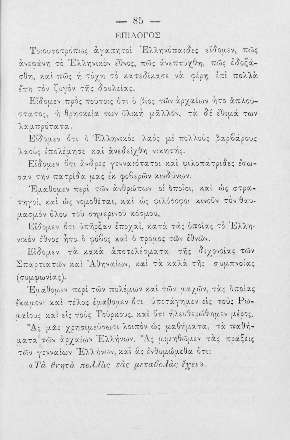 Βαθμίδα εκπαίδευσης: Πρωτοβάθμια Μάθημα: Ιστορία Γλώσσα: Καθαρεύουσα Παρουσίαση περιεχομένου: Σχολικό εγχειρίδιο Ιστορίας Δημοτικού που καλύπτει την περίοδο από τους προϊστορικούς χρόνους ως τη Μακεδονική Ηγεμονία. |