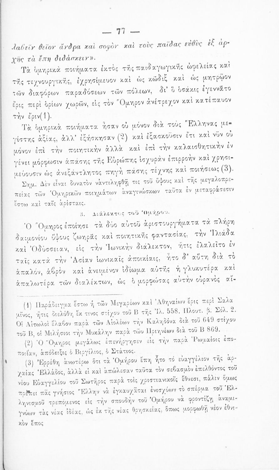 Σχολικό εγχειρίδιο Αρχαίων Ελληνικών Γυμνασίου που περιλαμβάνει γραμματική της ομηρικής διαλέκτου και εκτενή αναφορά στη δομή και το περιεχόμενο της ομηρικής ποίησης.