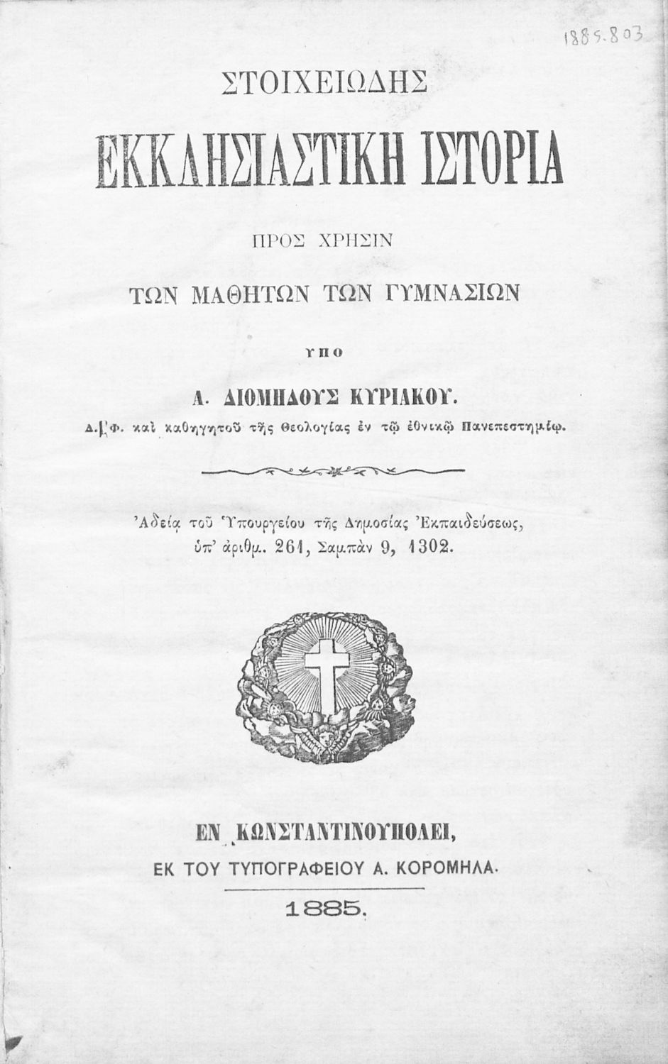 Τίτλος: Στοιχειώδης εκκλησιαστική ιστορία προς χρήσιν των μαθητών των Γυμνασίων
