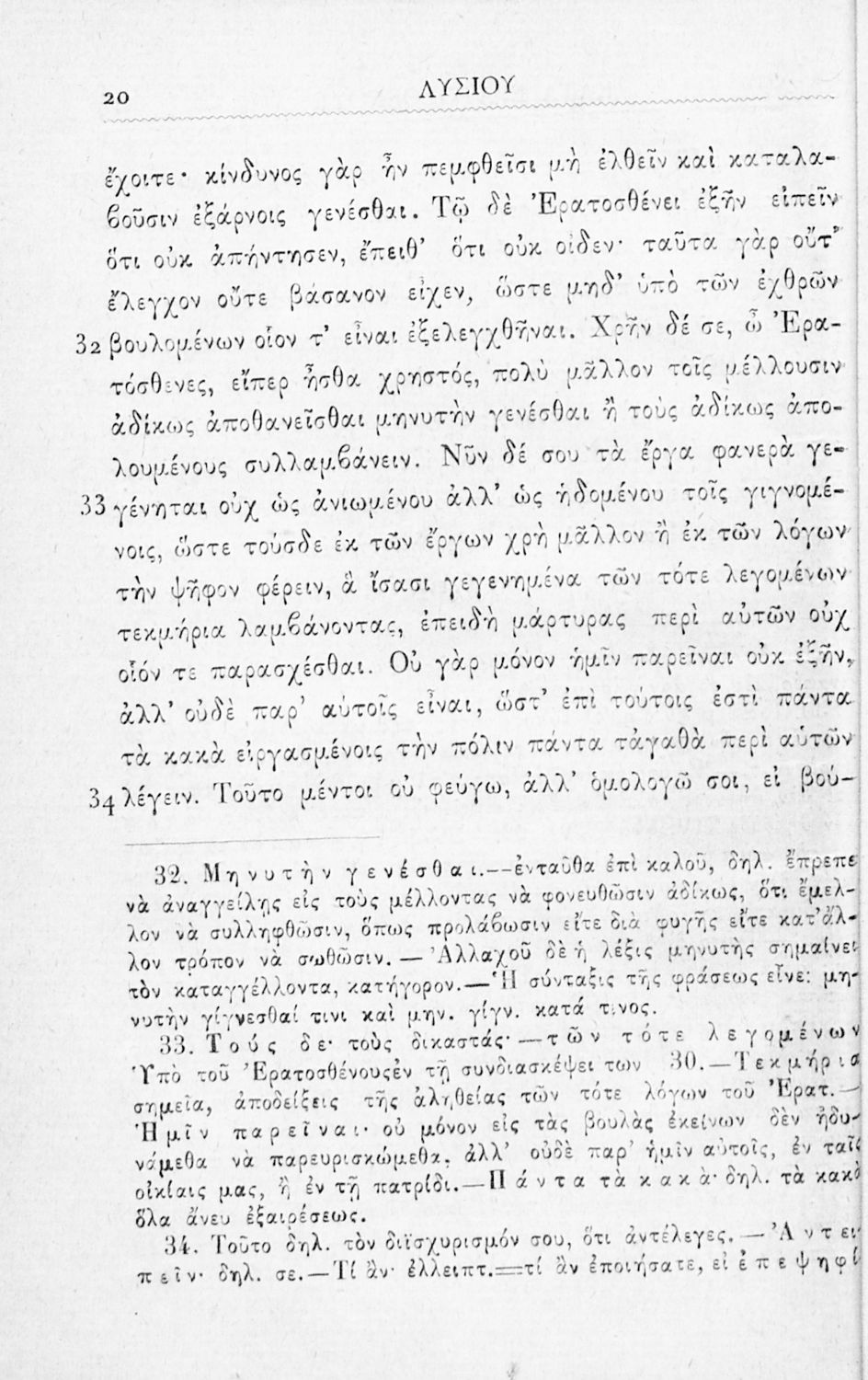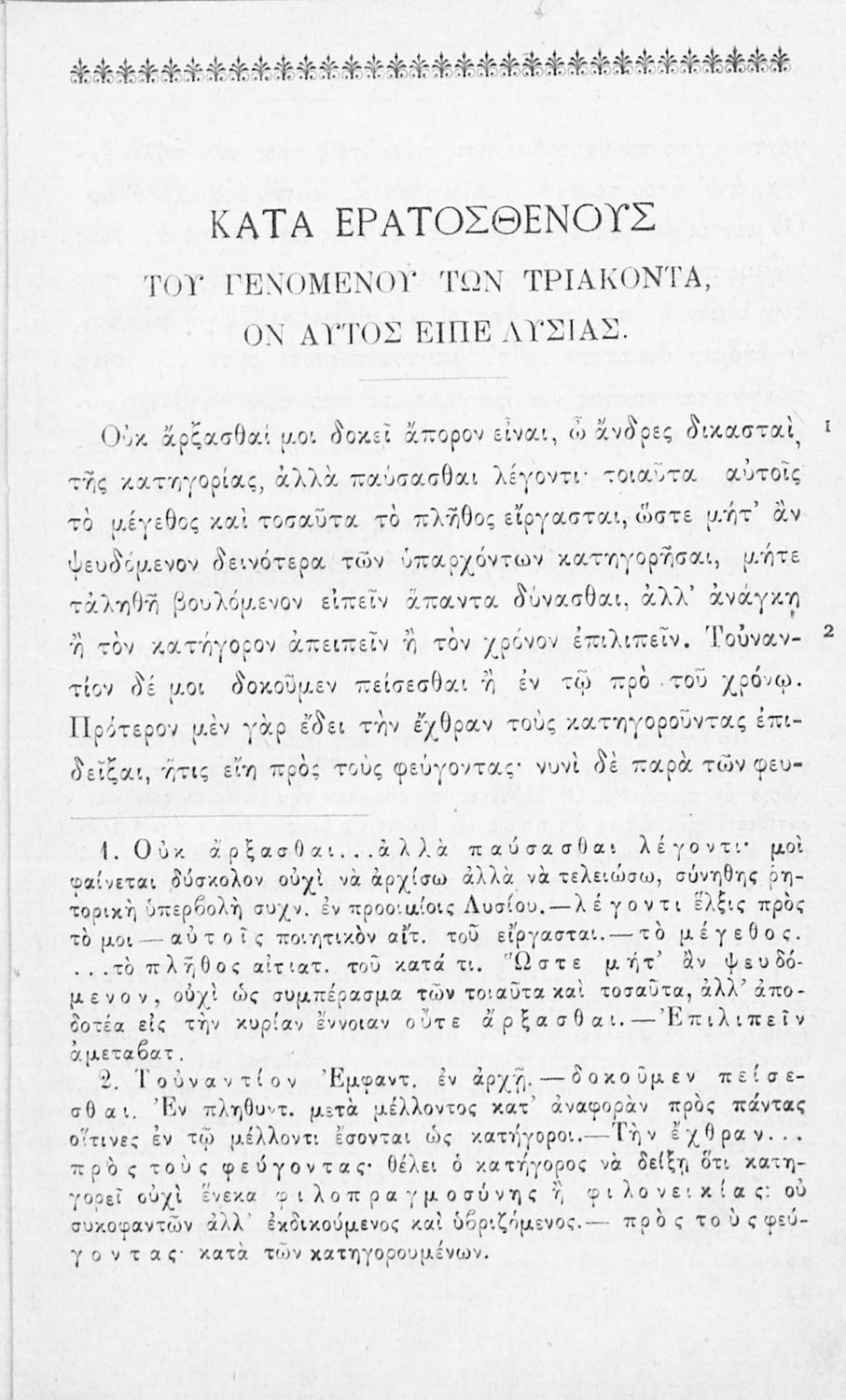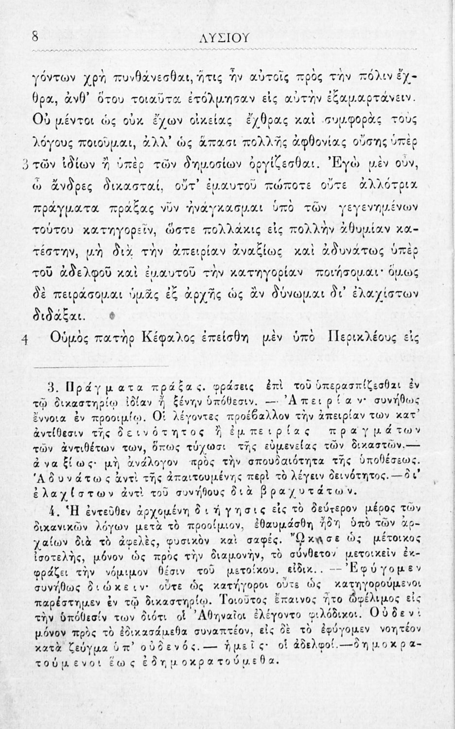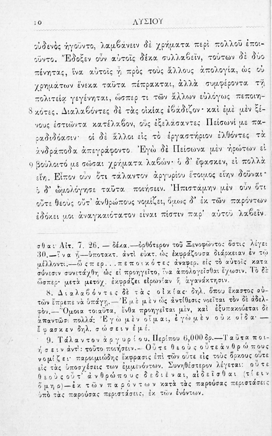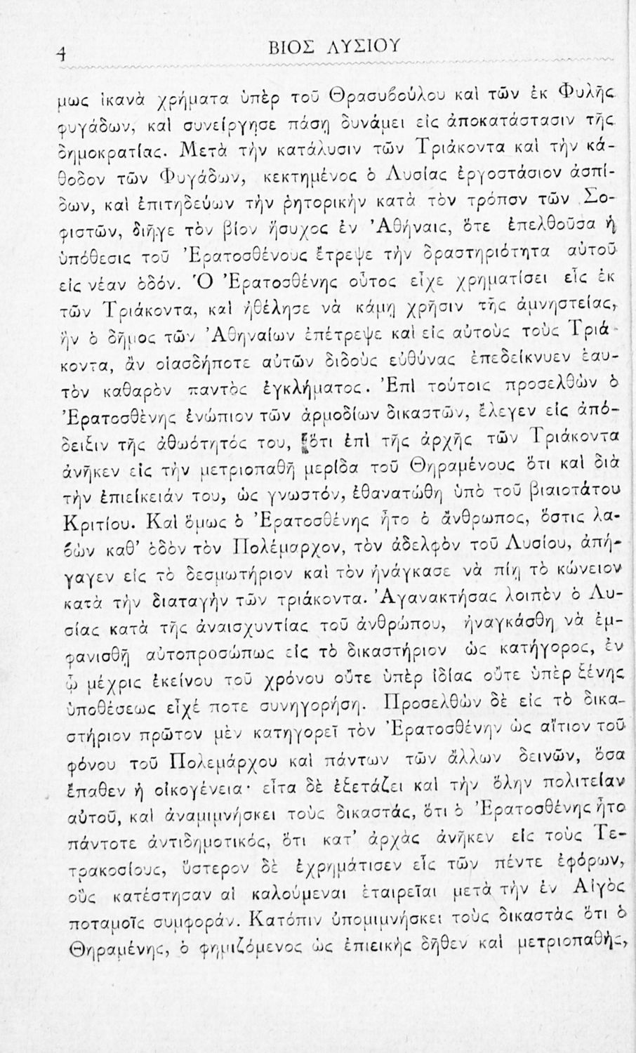 Μαθητικό βοήθημα Αρχαίων Ελληνικών Γυμνασίου που περιλαμβάνει τους Λόγους του Λυσία Κατά Ερατοσθένους, Κατά Αγοράτου, Υπέρ Μαντιθέου, Υπέρ των Αριστοφάνους χρημάτων, Δήμου καταλύσεως απολογία, Περί του μη διδόσθαι τω αδυνάτω αργύριον, Κατά Νικομάχου γραμματέως εισαγωγή στους Λόγους, και ερμηνευτικές και λεξιλογικές παρατηρήσεις.