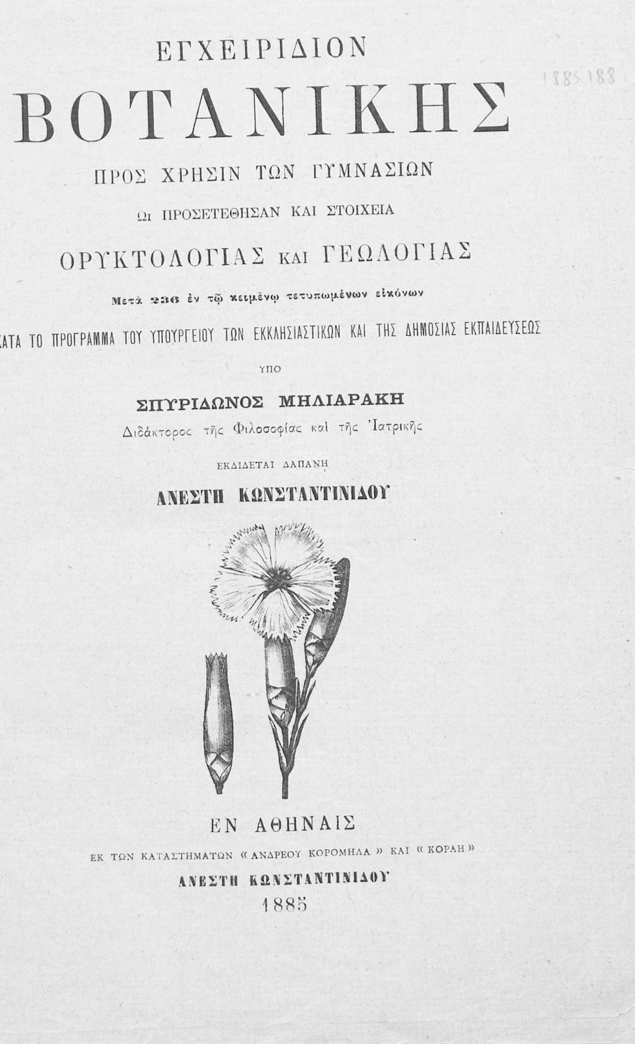 Τίτλος: Εγχειρίδιον Βοτανικής, προς χρήσιν των Γυμνασίων, ως προσετέθησαν και στοιχεία Ορυκτολογίας και Γεωλογίας