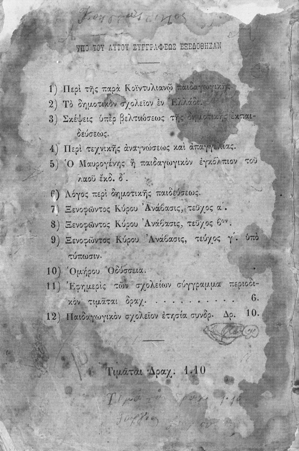 Σχολικό εγχειρίδιο Αρχαίων Ελληνικών για τα Ελληνικά Σχολεία και Παρθεναγωγεία που περιέχει αποσπάσματα από τα έργα του Ξενοφώντα Ελληνικά (βιβλία Α΄ και Β΄ ) και Κύρου Παιδεία, σημειώσεις και ερμηνευτικά ...
