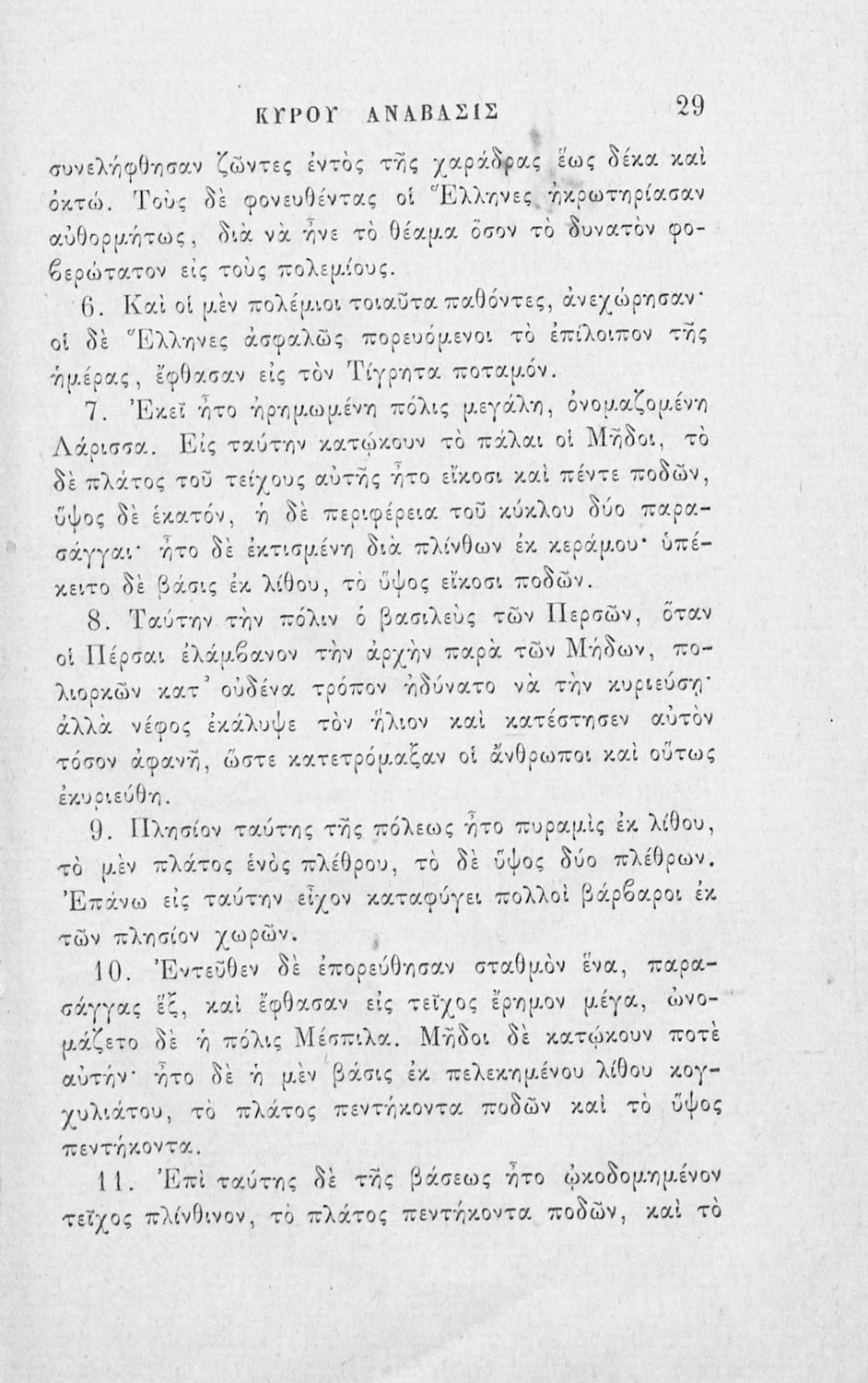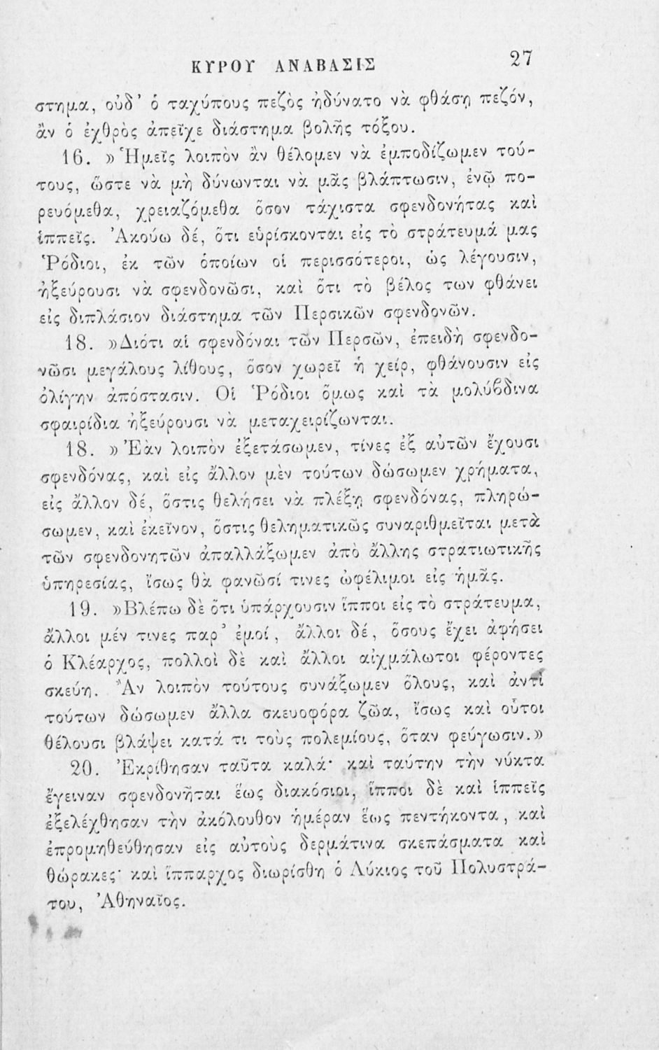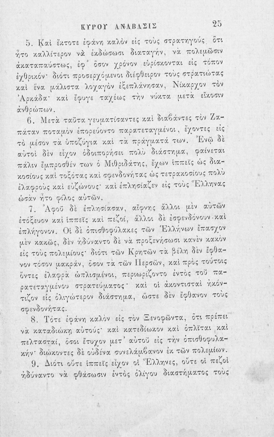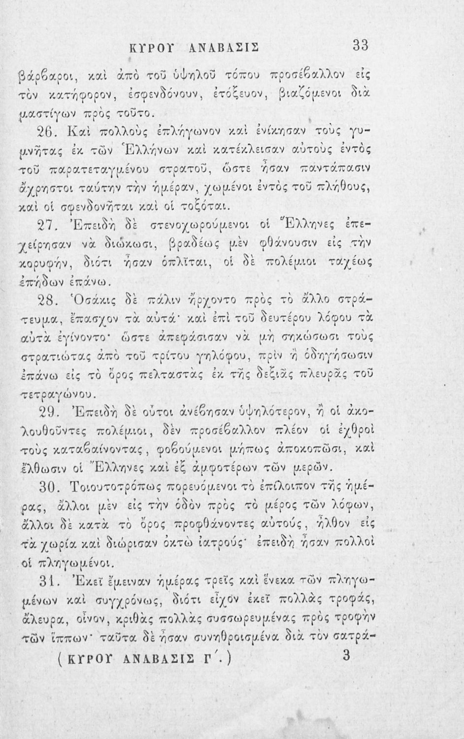 Σχολικό εγχειρίδιο Αρχαίων Ελληνικών για τα Ελληνικά Σχολεία και Παρθεναγωγεία που περιλαμβάνει αποσπάσματα από το έργο του Ξενοφώντα Κύρου Ανάβασις, και λεξικογραφικές παρατηρήσεις.