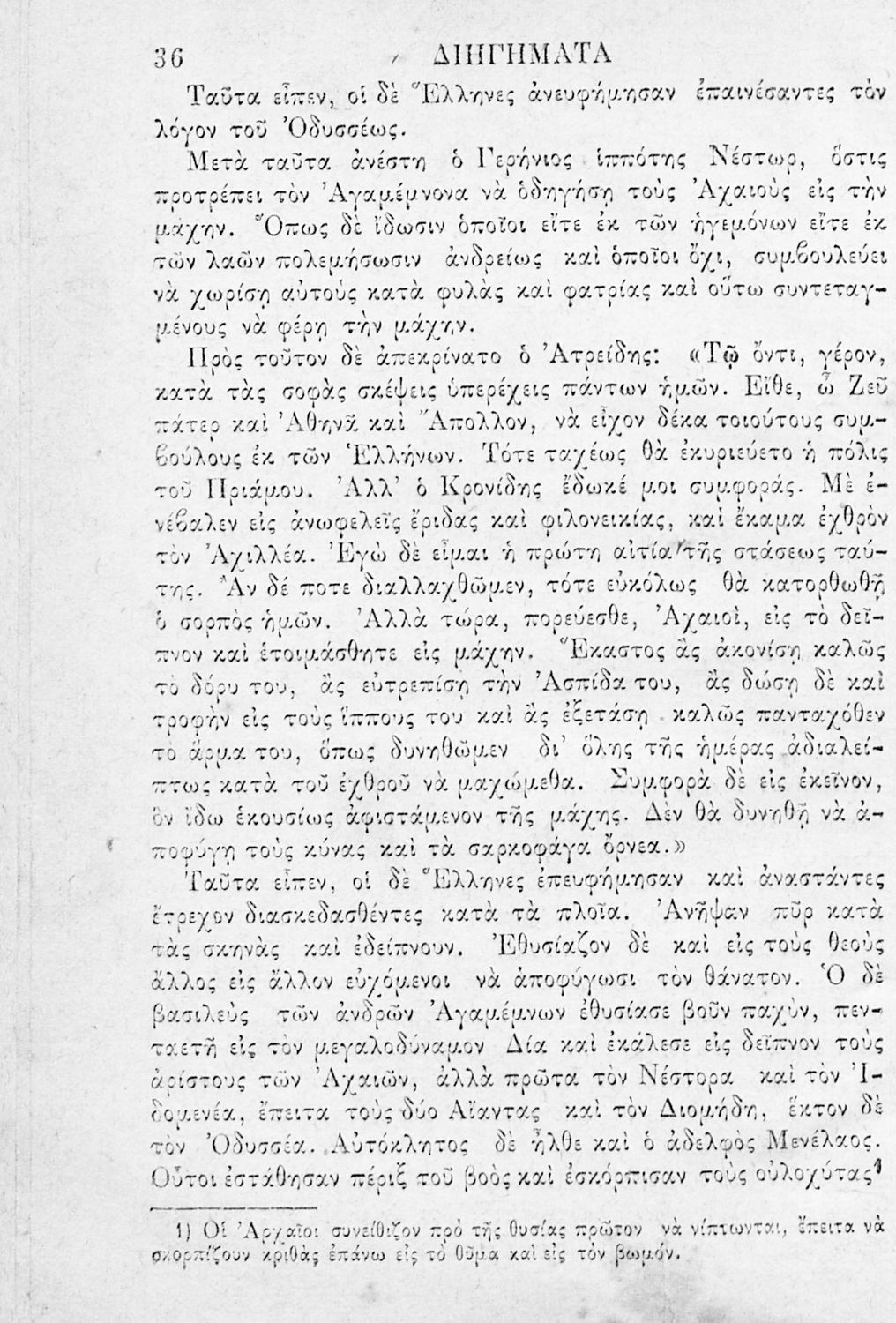 Βαθμίδα εκπαίδευσης: Πρωτοβάθμια Μάθημα: Νέα Ελληνικά Γλώσσα: Καθαρεύουσα Παρουσίαση περιεχομένου: Αναγνωστικό που περιλαμβάνει διηγήματα εμπνευσμένα από τον Τρωικό Πόλεμο και αποσκοπεί να διδάξει στους ελληνόπαιδες "ότι προς ταις αρεταίς της ειρήνης υπάρχουσι και αρεταίς του πολέμου, η αρετή της πειθαρχίας και του ξίφους". |