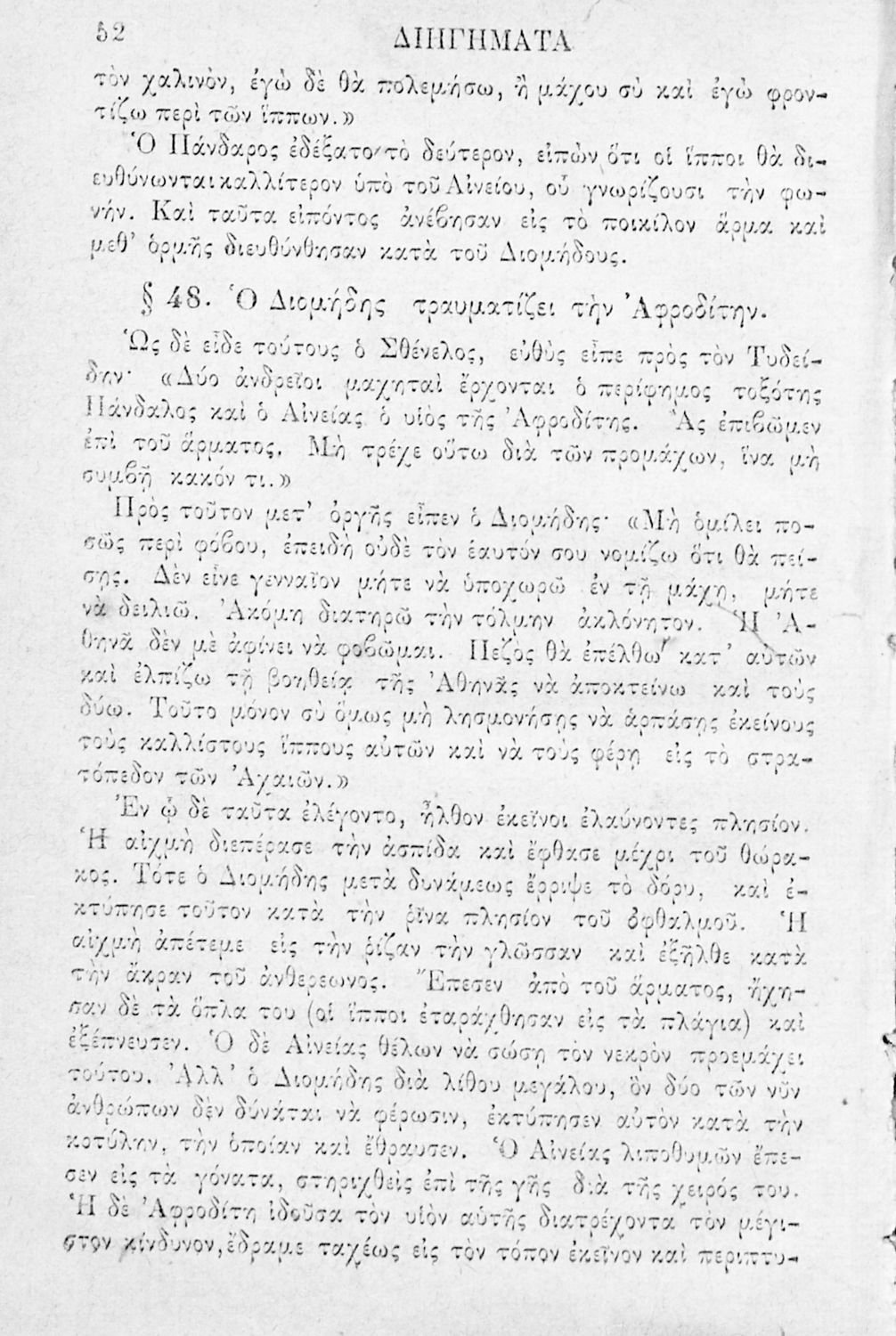 Βαθμίδα εκπαίδευσης: Πρωτοβάθμια Μάθημα: Νέα Ελληνικά Γλώσσα: Καθαρεύουσα Παρουσίαση περιεχομένου: Αναγνωστικό που περιλαμβάνει διηγήματα εμπνευσμένα από τον Τρωικό Πόλεμο και αποσκοπεί να διδάξει στους ελληνόπαιδες "ότι προς ταις αρεταίς της ειρήνης υπάρχουσι και αρεταίς του πολέμου, η αρετή της πειθαρχίας και του ξίφους". |