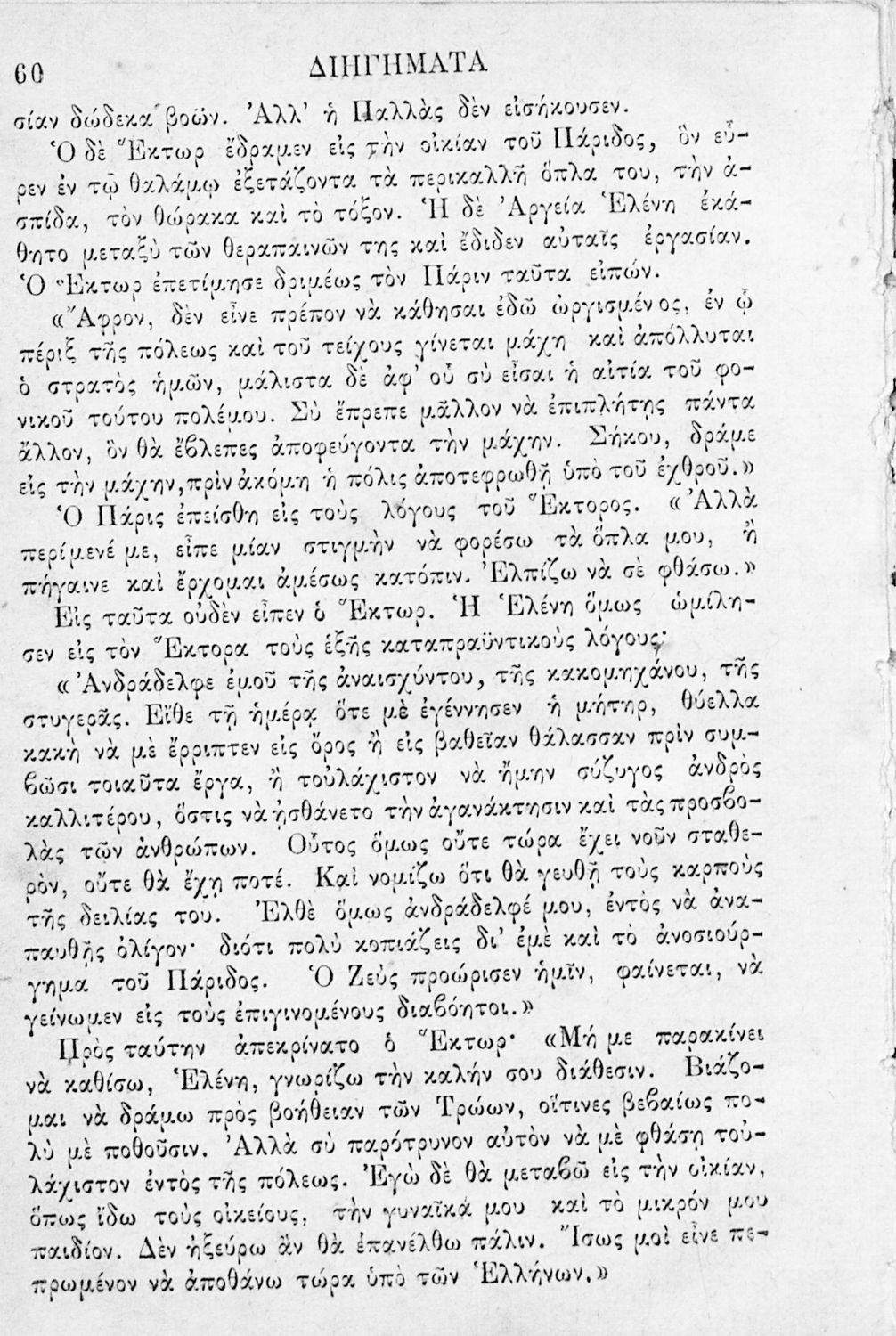 Αναγνωστικό που περιλαμβάνει διηγήματα εμπνευσμένα από τον Τρωικό Πόλεμο και αποσκοπεί να διδάξει στους ελληνόπαιδες "ότι προς ταις αρεταίς της ειρήνης υπάρχουσι και αρεταίς του πολέμου, η αρετή της πειθαρχίας και του ξίφους".