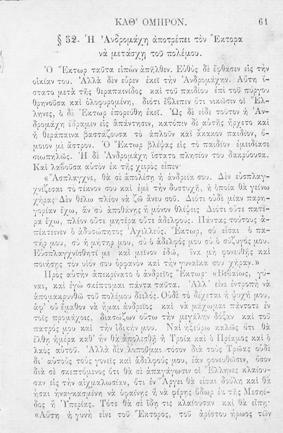 Βαθμίδα εκπαίδευσης: Πρωτοβάθμια Μάθημα: Νέα Ελληνικά Γλώσσα: Καθαρεύουσα Παρουσίαση περιεχομένου: Αναγνωστικό που περιλαμβάνει διηγήματα εμπνευσμένα από τον Τρωικό Πόλεμο και αποσκοπεί να διδάξει στους ελληνόπαιδες "ότι προς ταις αρεταίς της ειρήνης υπάρχουσι και αρεταίς του πολέμου, η αρετή της πειθαρχίας και του ξίφους". |