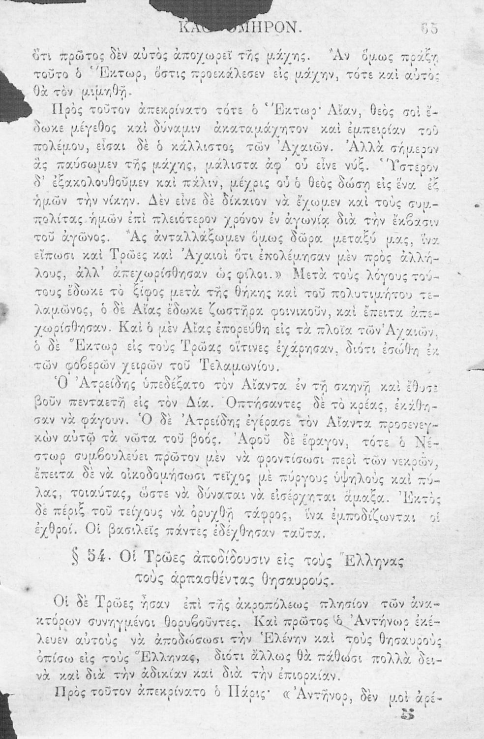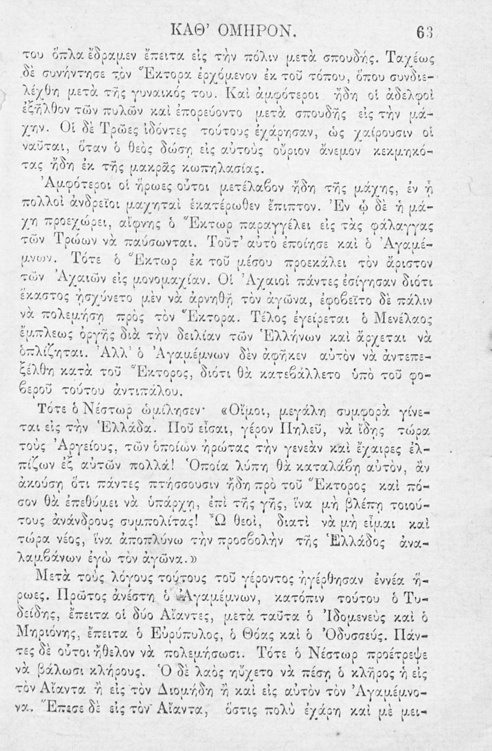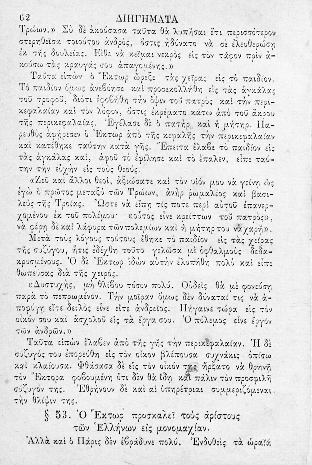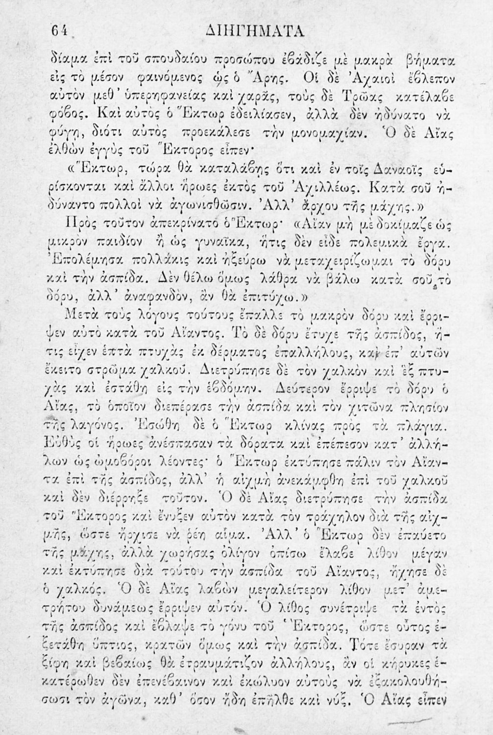 Αναγνωστικό που περιλαμβάνει διηγήματα εμπνευσμένα από τον Τρωικό Πόλεμο και αποσκοπεί να διδάξει στους ελληνόπαιδες "ότι προς ταις αρεταίς της ειρήνης υπάρχουσι και αρεταίς του πολέμου, η αρετή της πειθαρχίας και του ξίφους".