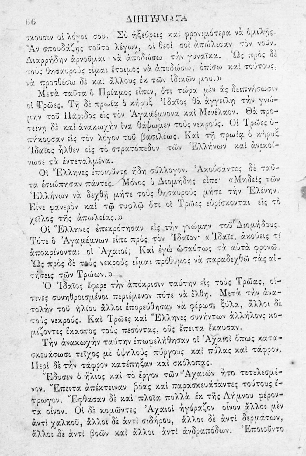 Κωδικός αναγνώρισης: 02-02525 Τίτλος: Διηγήματα καθ΄ Όμηρον και τους τραγικούς εκ του τρωικού κύκλου προς χρήσιν των μαθητών του Δημοτικού Σχολείου Συγγραφέας: Παναγιώτης Π. Οικονόμος Μέγεθος και υπόστρωμα: Σχολικό εγχειρίδιο, μαλακό εξώφυλλο, 66 σελίδες. |