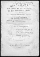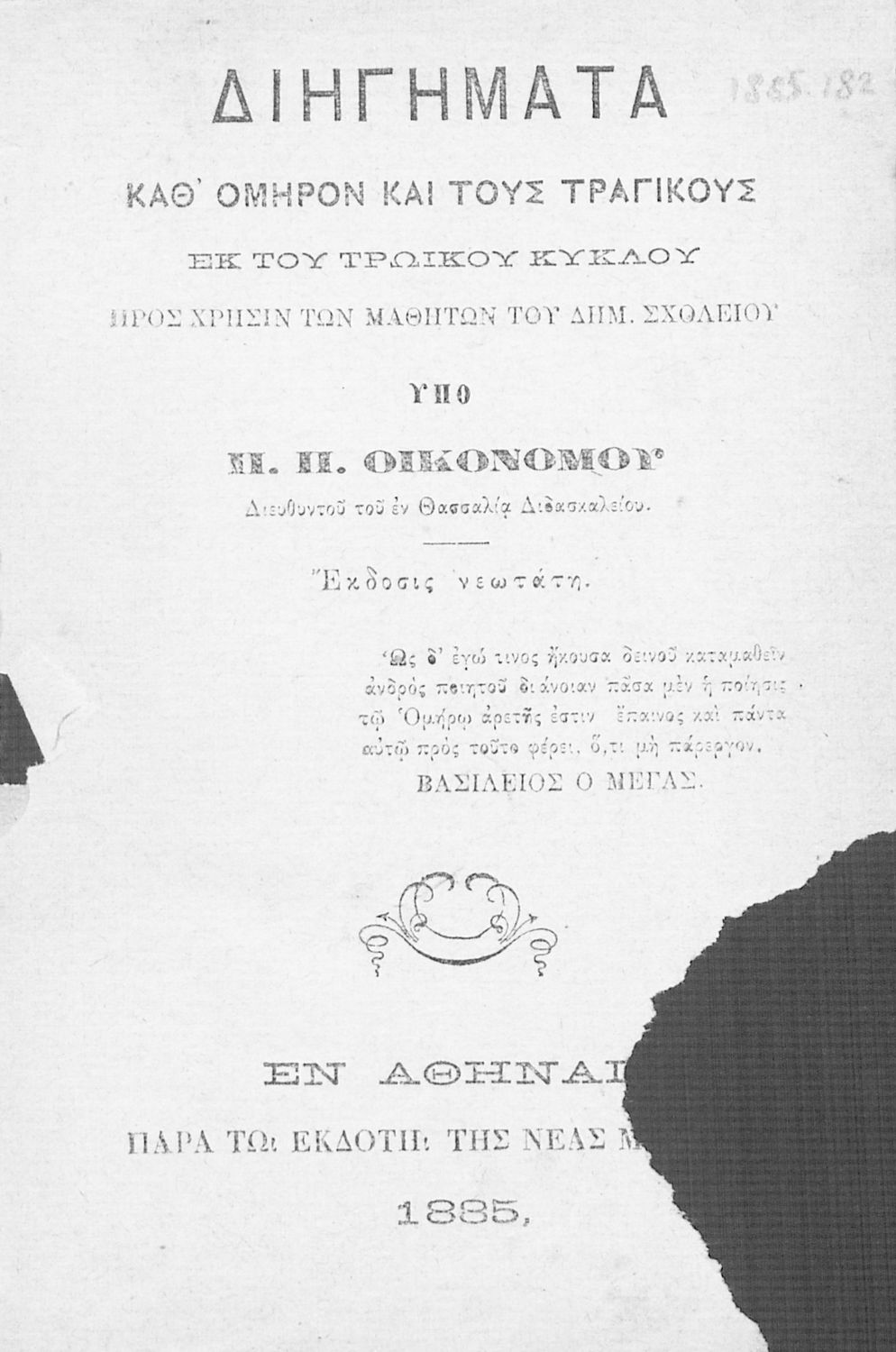 Κωδικός αναγνώρισης: 02-02525 Τίτλος: Διηγήματα καθ΄ Όμηρον και τους τραγικούς εκ του τρωικού κύκλου προς χρήσιν των μαθητών του Δημοτικού Σχολείου Συγγραφέας: Παναγιώτης Π. Οικονόμος Μέγεθος και υπόστρωμα: Σχολικό εγχειρίδιο, μαλακό εξώφυλλο, 66 σελίδες. |