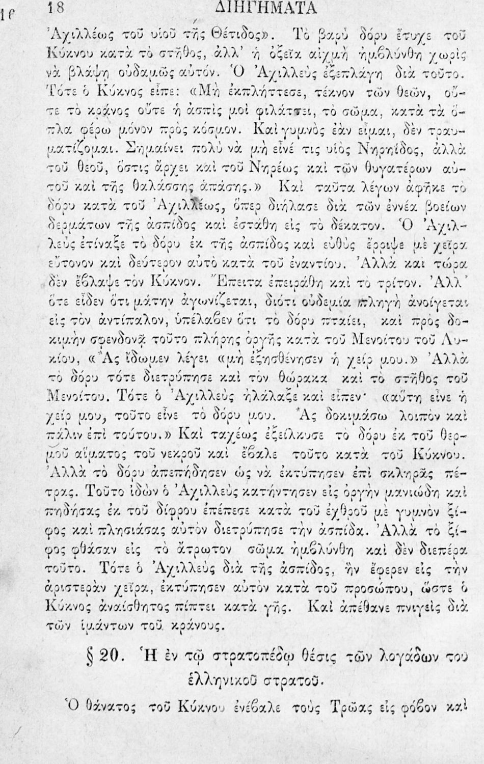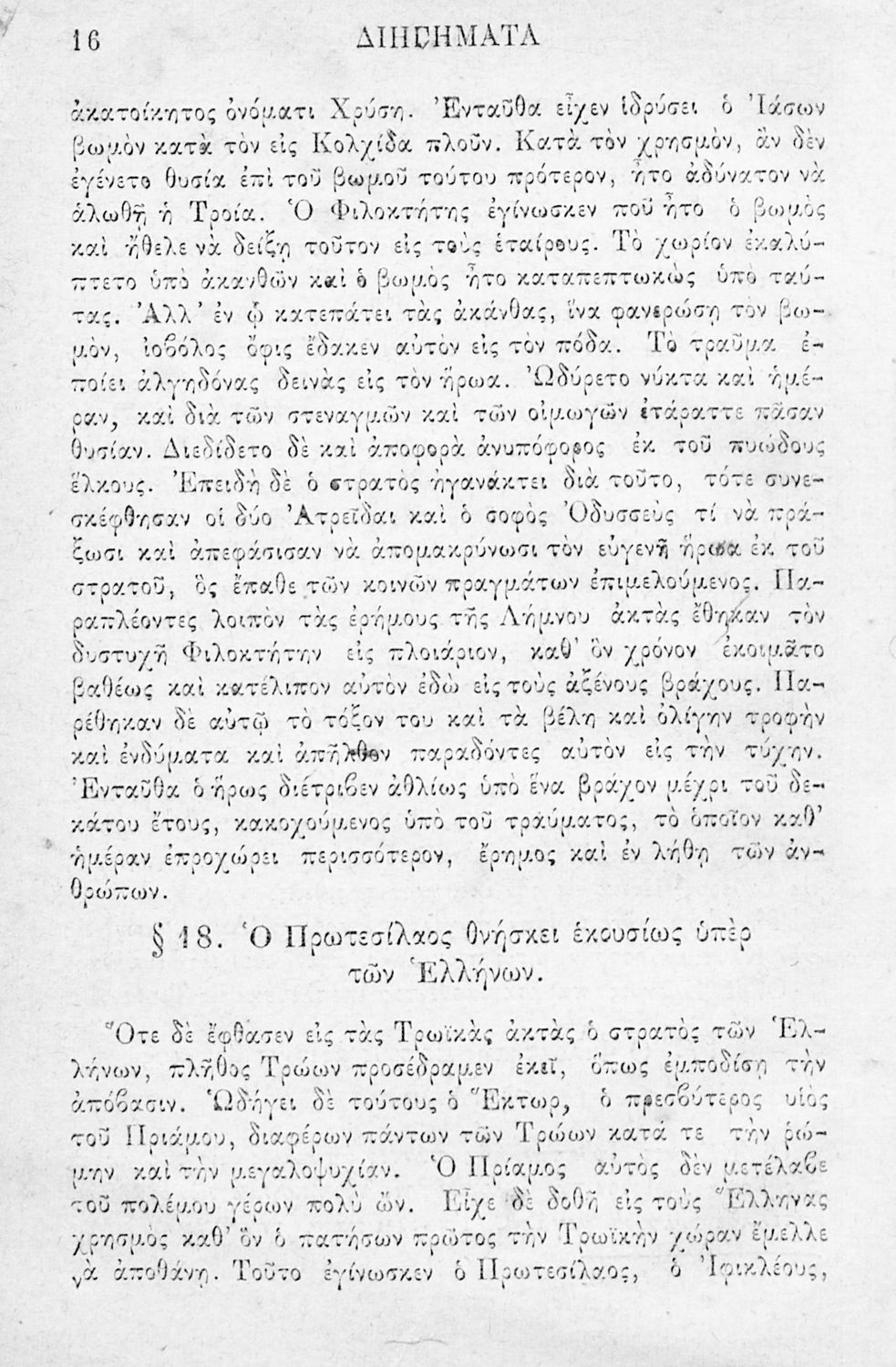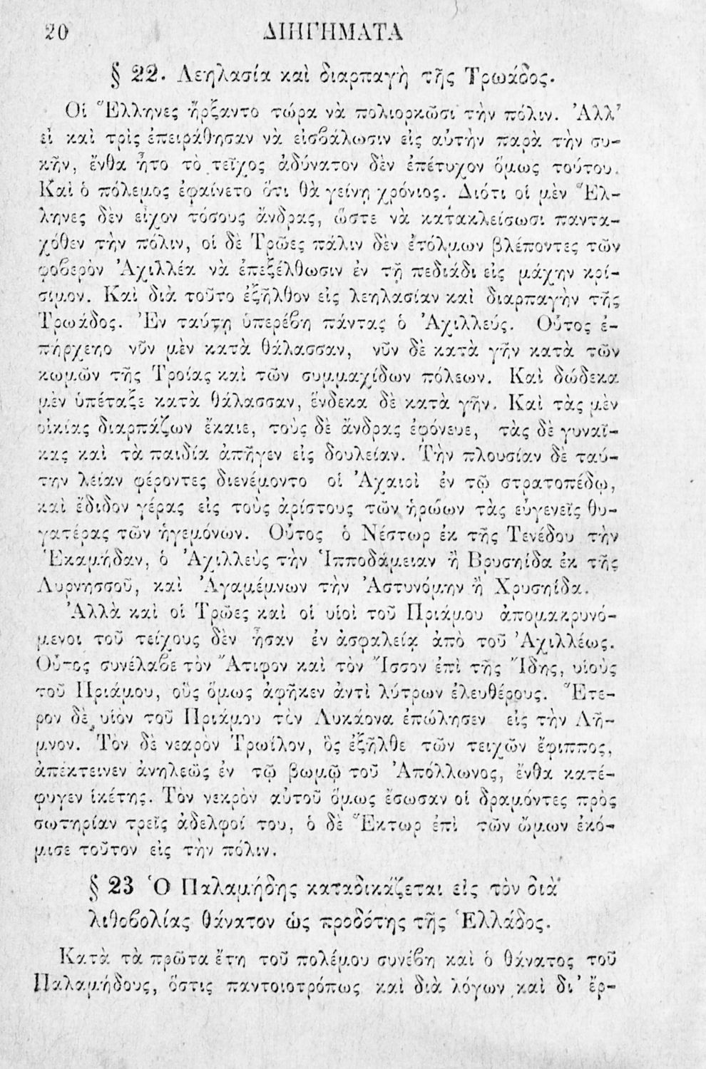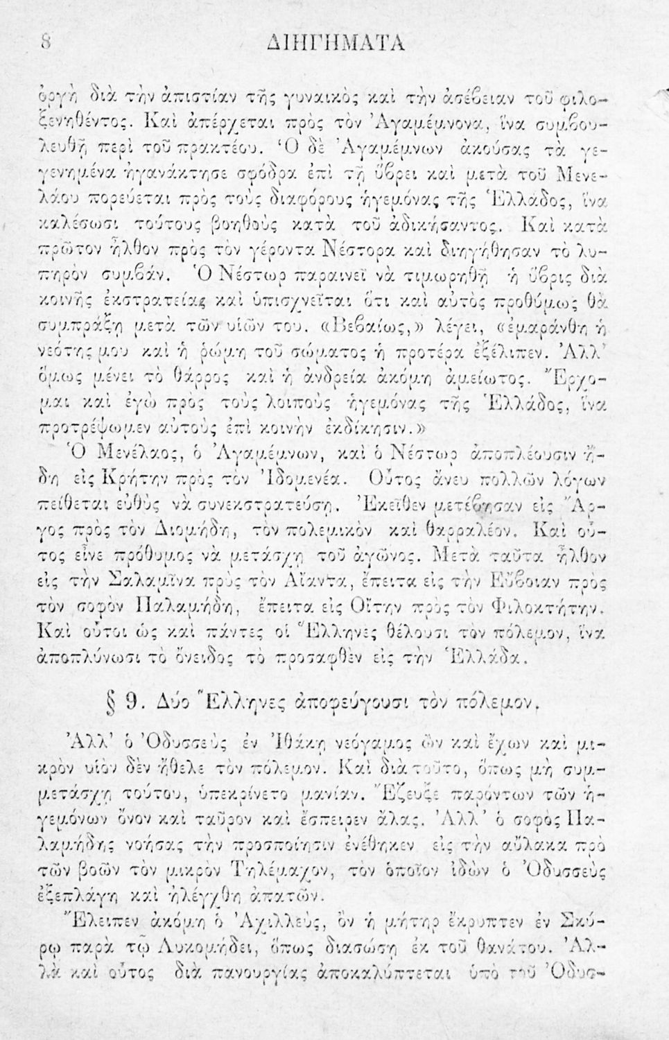 Αναγνωστικό που περιλαμβάνει διηγήματα εμπνευσμένα από τον Τρωικό Πόλεμο και αποσκοπεί να διδάξει στους ελληνόπαιδες "ότι προς ταις αρεταίς της ειρήνης υπάρχουσι και αρεταίς του πολέμου, η αρετή της πειθαρχίας και του ξίφους".