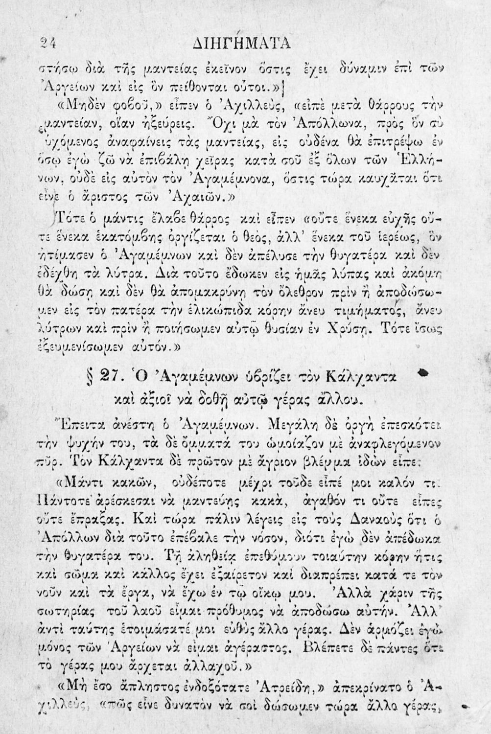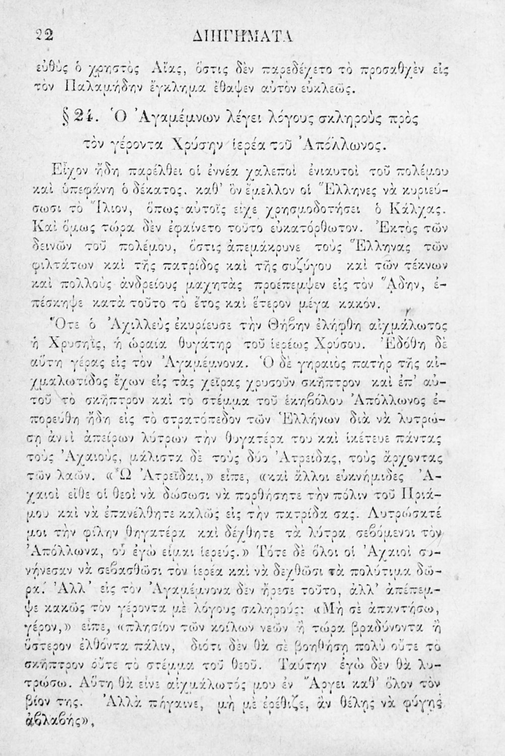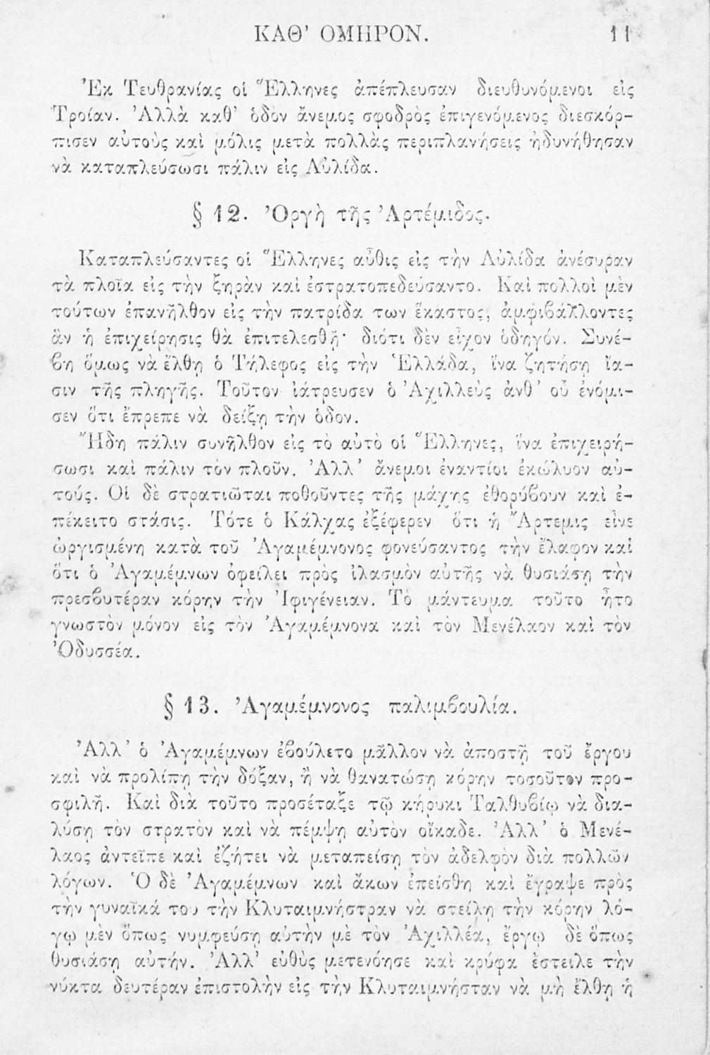 Αναγνωστικό που περιλαμβάνει διηγήματα εμπνευσμένα από τον Τρωικό Πόλεμο και αποσκοπεί να διδάξει στους ελληνόπαιδες "ότι προς ταις αρεταίς της ειρήνης υπάρχουσι και αρεταίς του πολέμου, η αρετή της πειθαρχίας και του ξίφους".