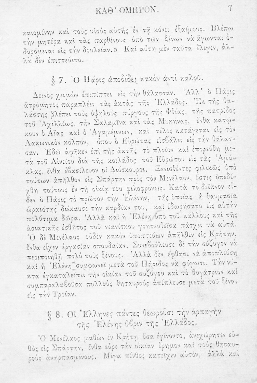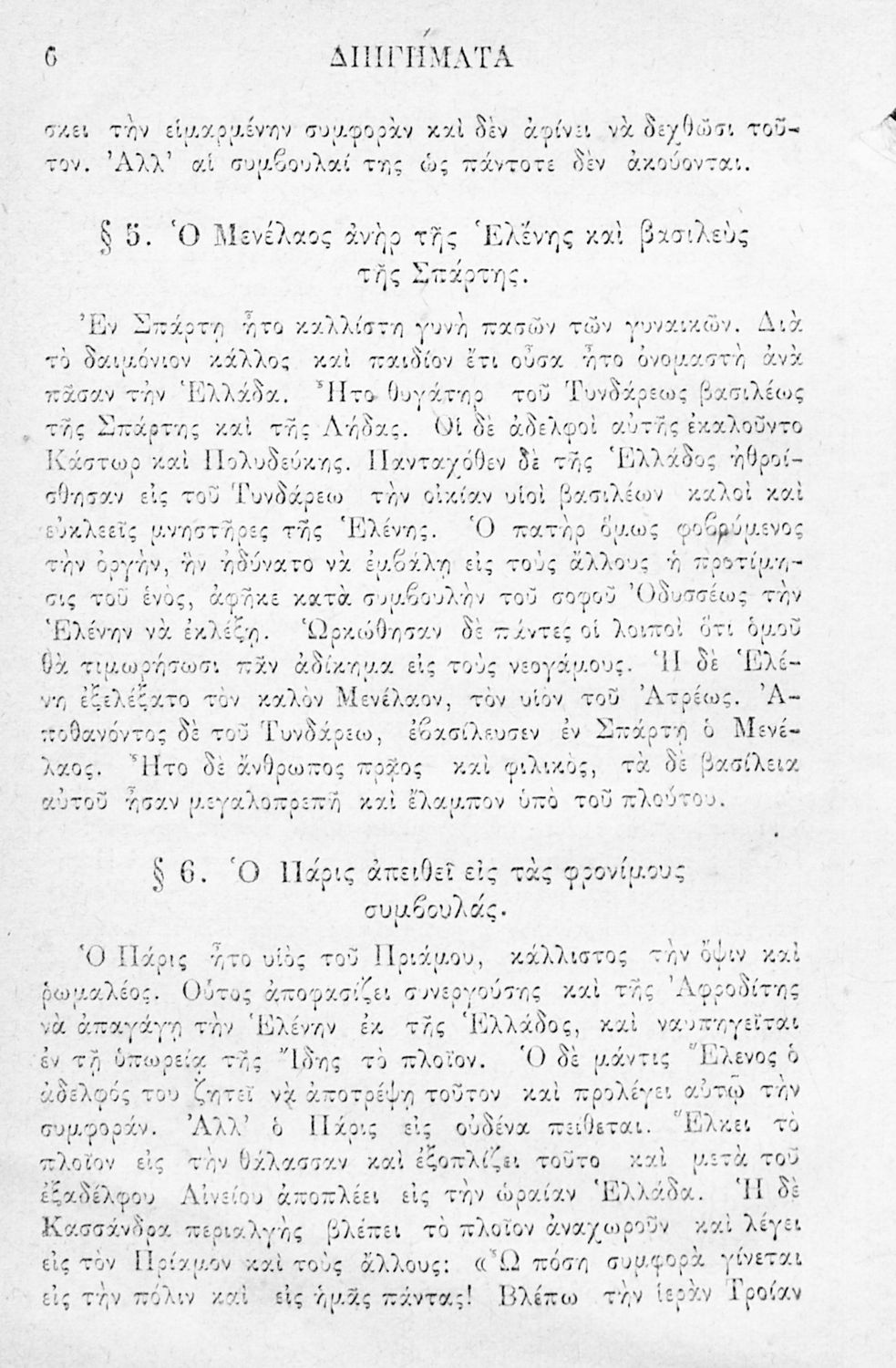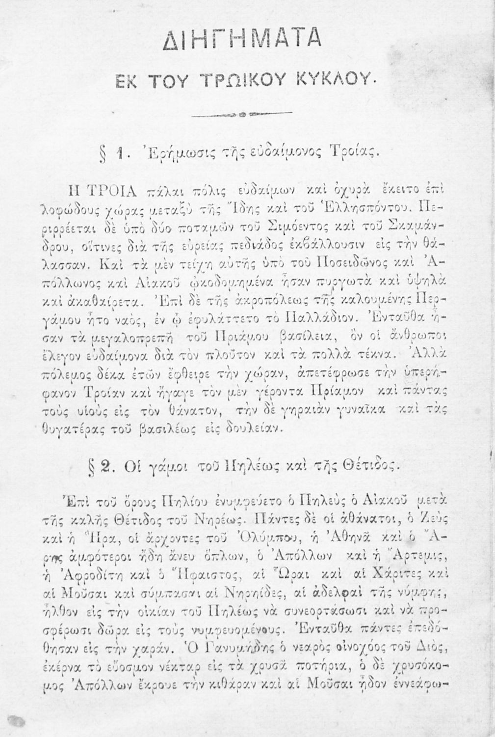 Βαθμίδα εκπαίδευσης: Πρωτοβάθμια Μάθημα: Νέα Ελληνικά Γλώσσα: Καθαρεύουσα Παρουσίαση περιεχομένου: Αναγνωστικό που περιλαμβάνει διηγήματα εμπνευσμένα από τον Τρωικό Πόλεμο και αποσκοπεί να διδάξει στους ελληνόπαιδες "ότι προς ταις αρεταίς της ειρήνης υπάρχουσι και αρεταίς του πολέμου, η αρετή της πειθαρχίας και του ξίφους". |