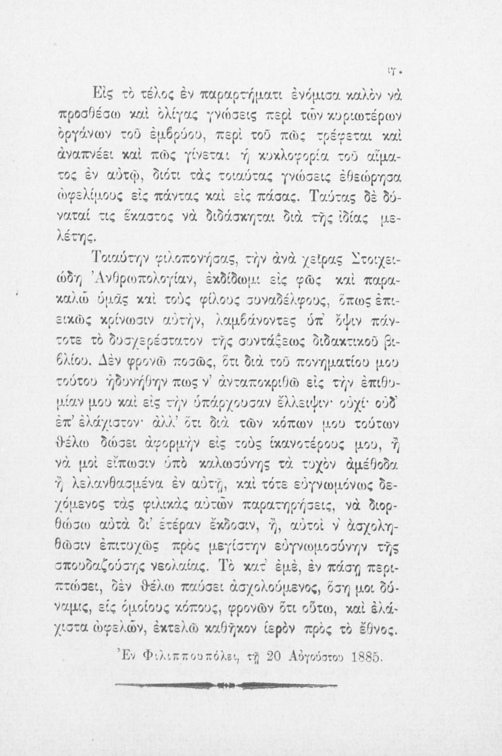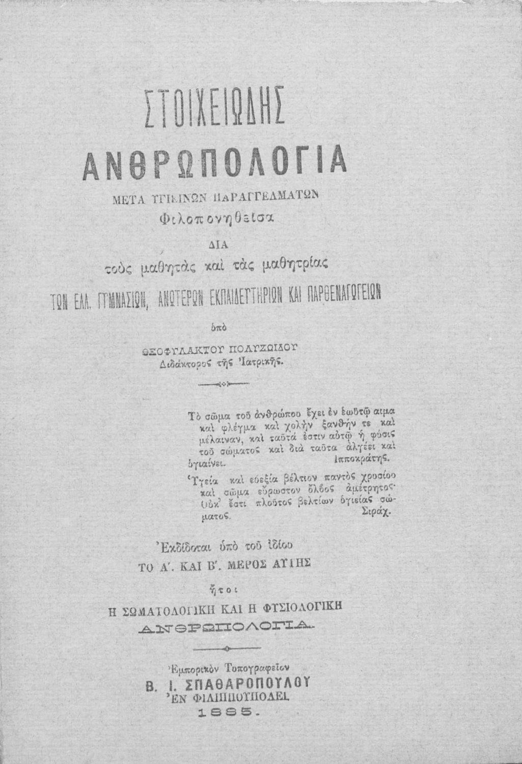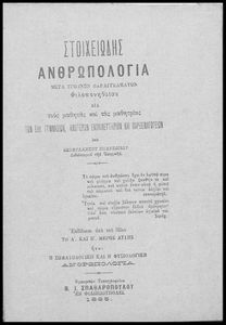 245 0# _aΣτοιχειώδης ανθρωπολογία, μετά υγιεινών παραγγελμάτων, φιλοπονηθείσα διά τους μαθητάς και τας μαθητρίας των ελληνικών Γυμνασίων, ανωτέρων εκπαιδευτηρίων και Παρθεναγωγείων