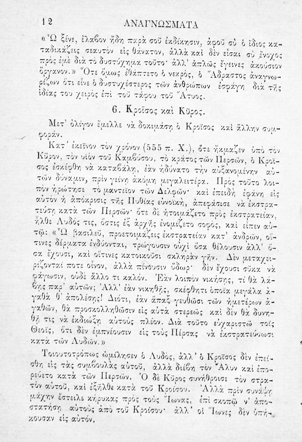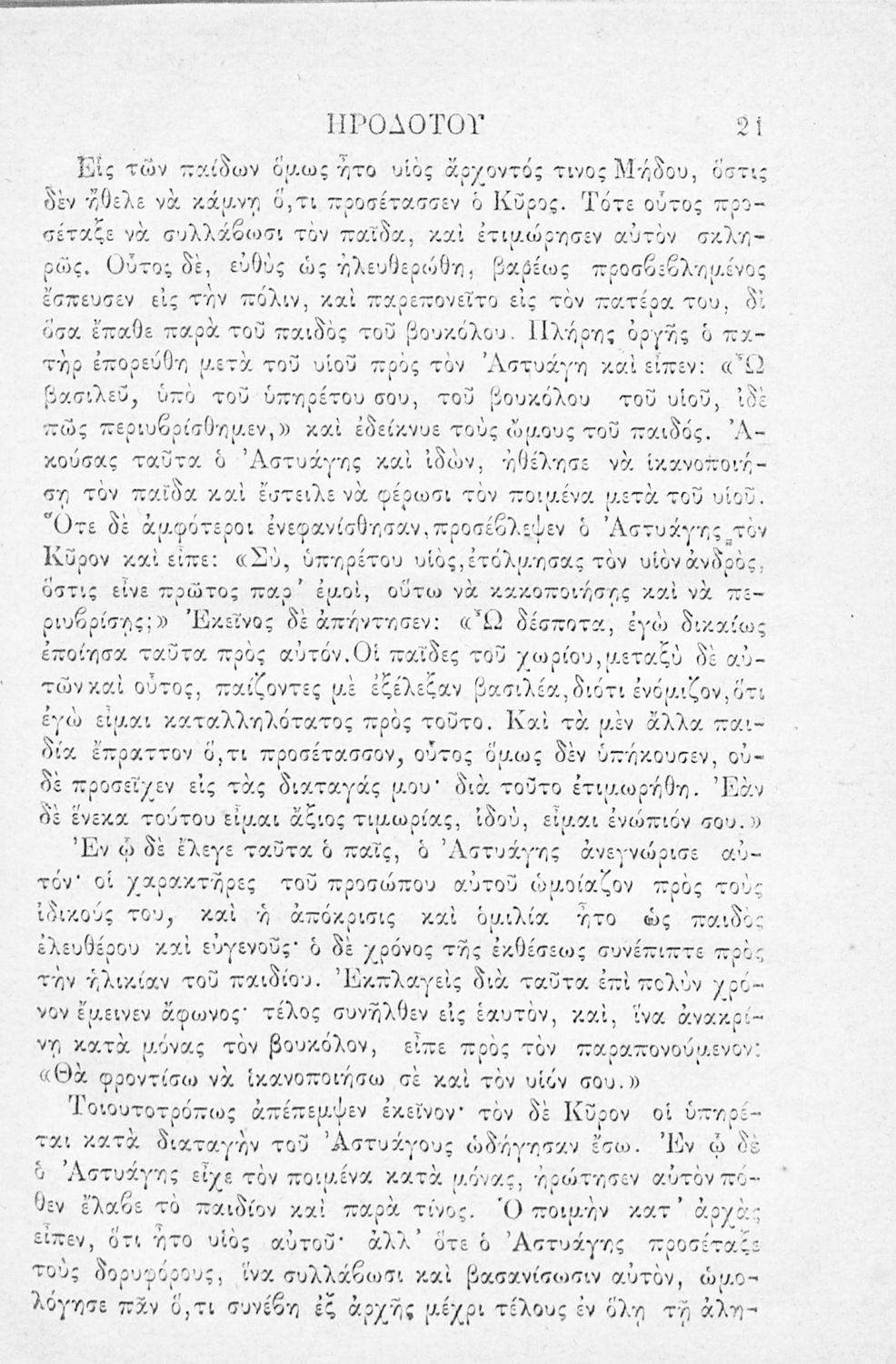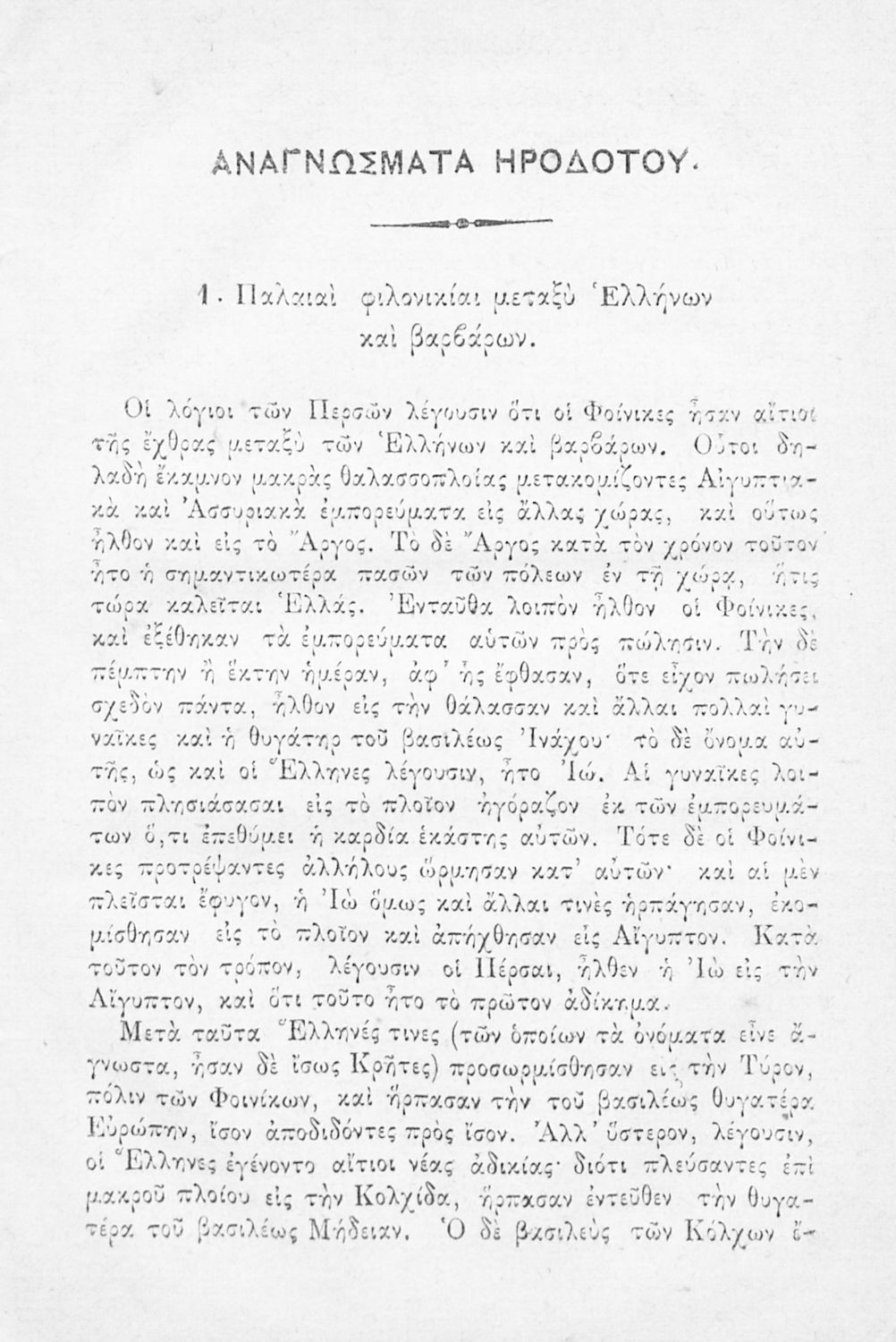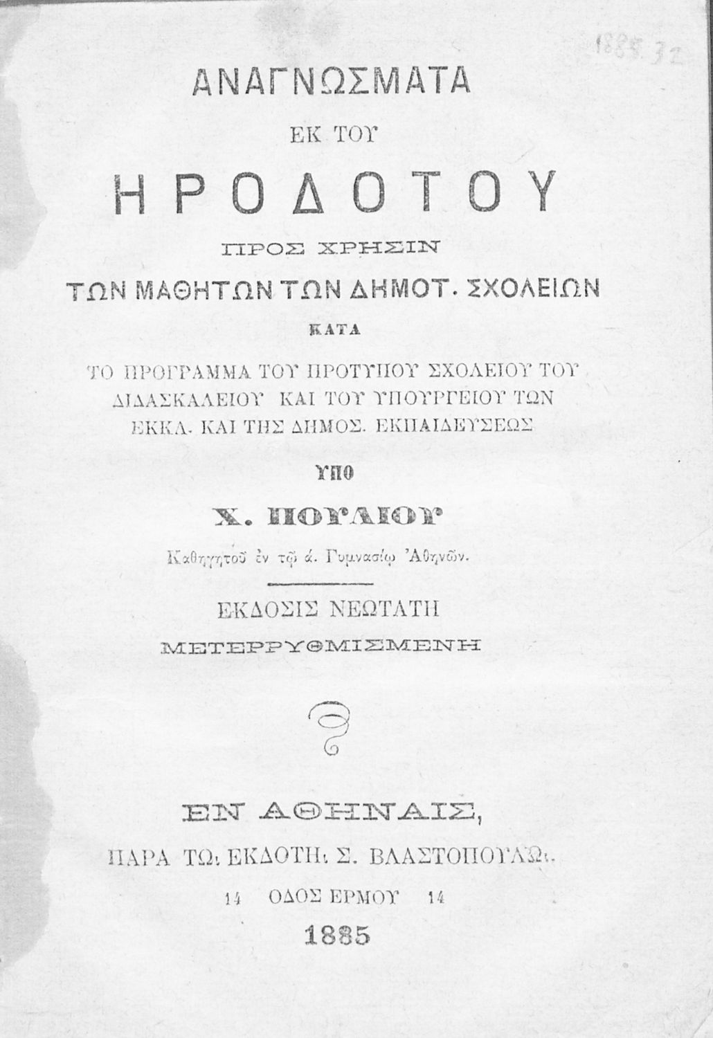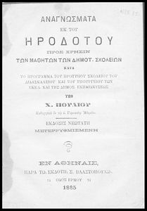 Βαθμίδα εκπαίδευσης: Πρωτοβάθμια Μάθημα: Νέα Ελληνικά Γλώσσα: Καθαρεύουσα Παρουσίαση περιεχομένου: Αναγνωστικό Δημοτικού που περιλαμβάνει διηγήματα εμπνευσμένα από την Ιστορία του Ηρόδοτου. |
