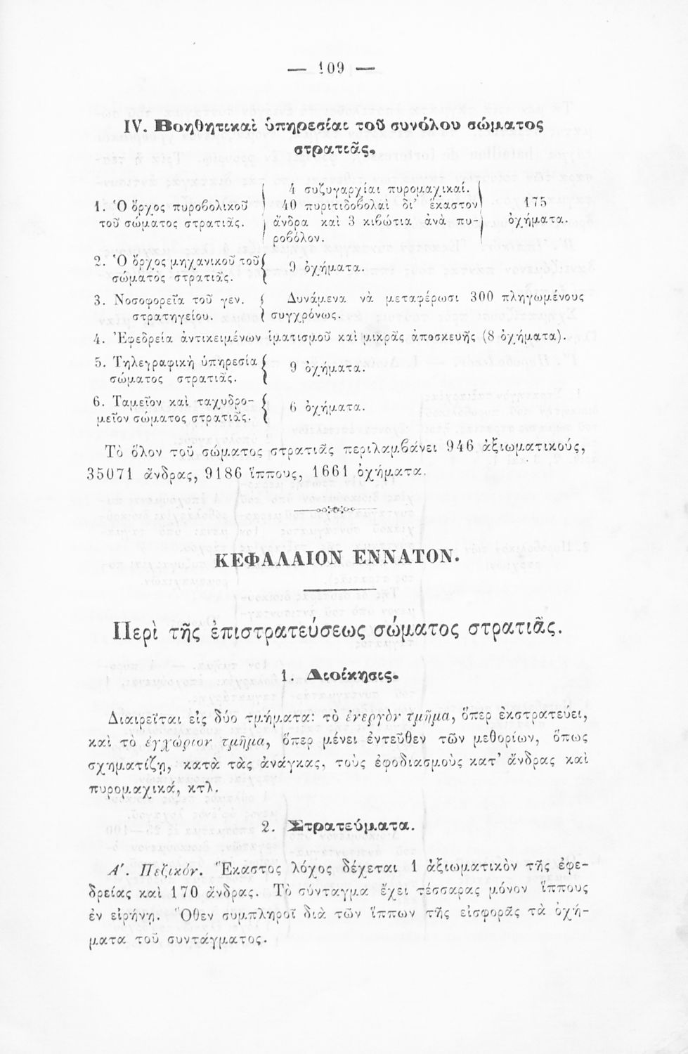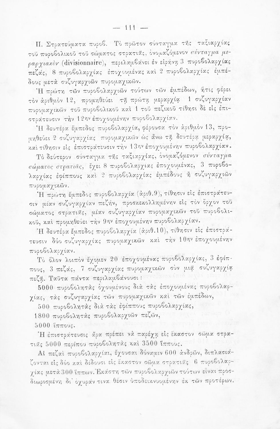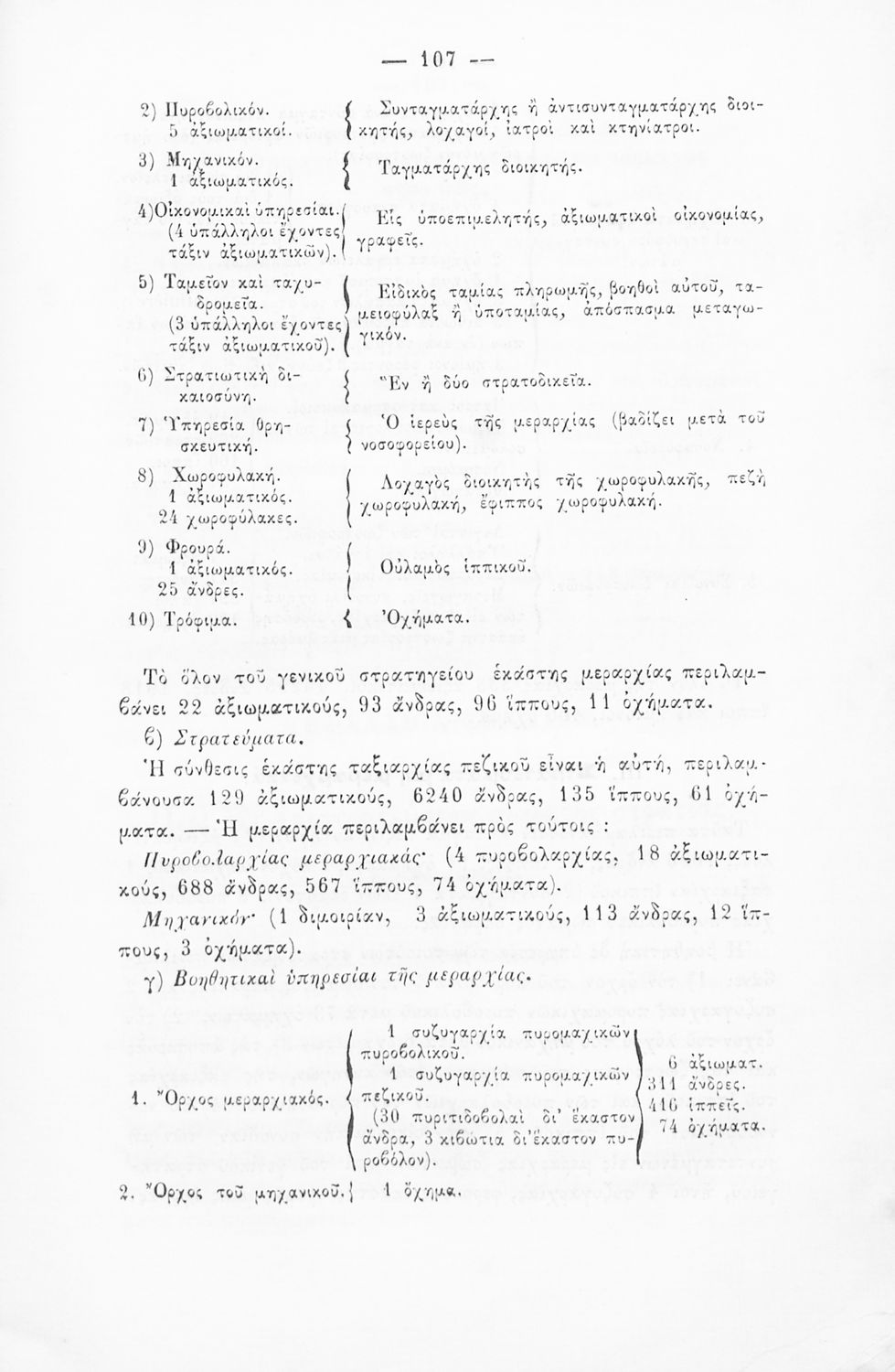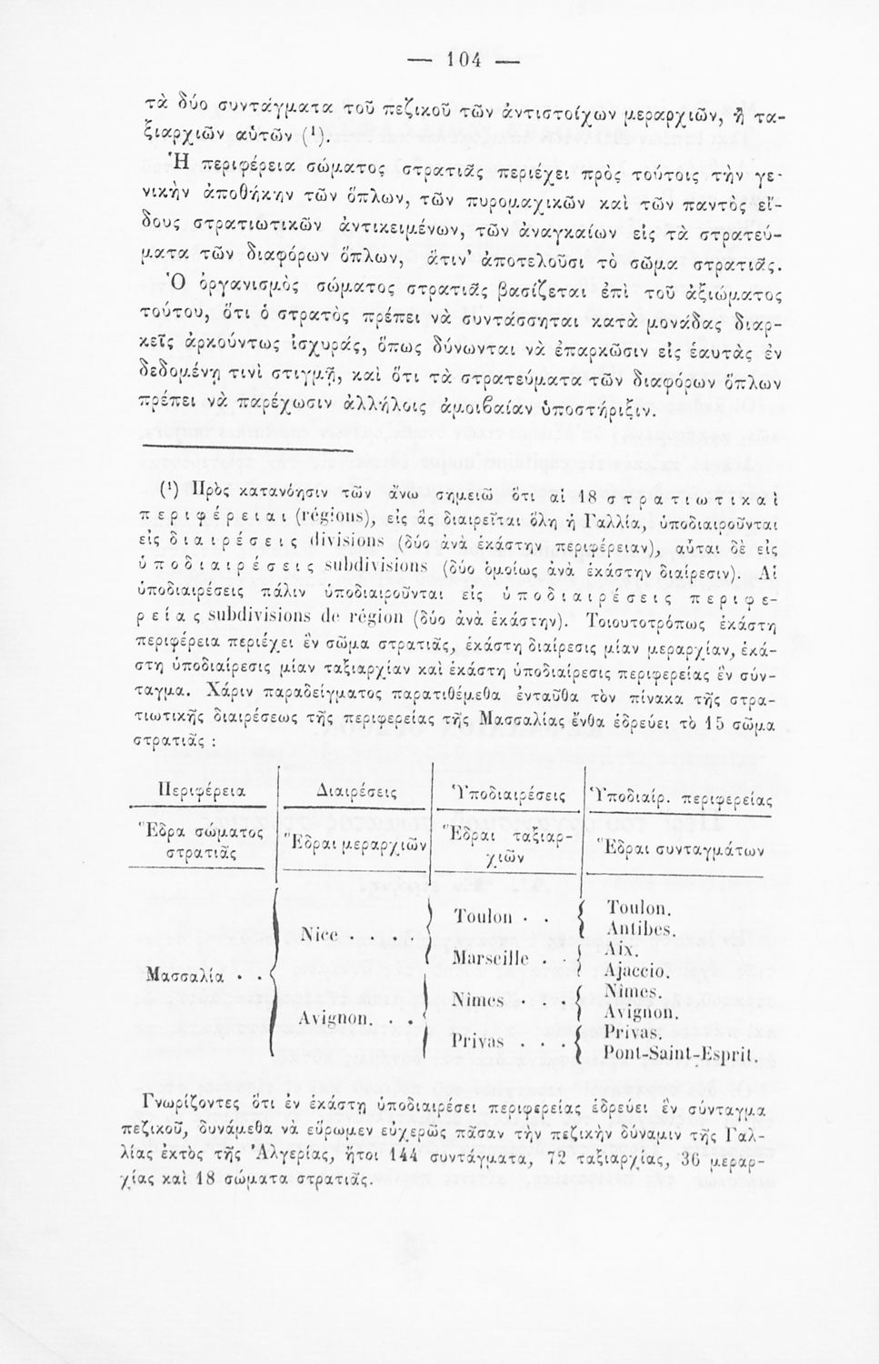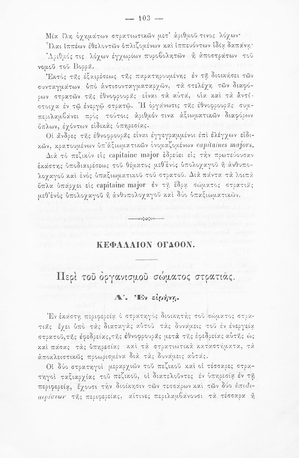 Παρουσίαση περιεχομένου: Εγχειρίδιο, μεταφρασμένο από τα Γαλλικά, που στόχο είχε τη διδασκαλία του στρατιωτικού συστήματος ορισμένων κρατών της Ευρώπης στη Στρατιωτική σχολή των Ευελπίδων. Στο βιβλίο παρουσιάζεται η δομή των στρατιωτικών οργανισμών και τα συστήματα στρατολόγησης των διαφόρων χωρών.