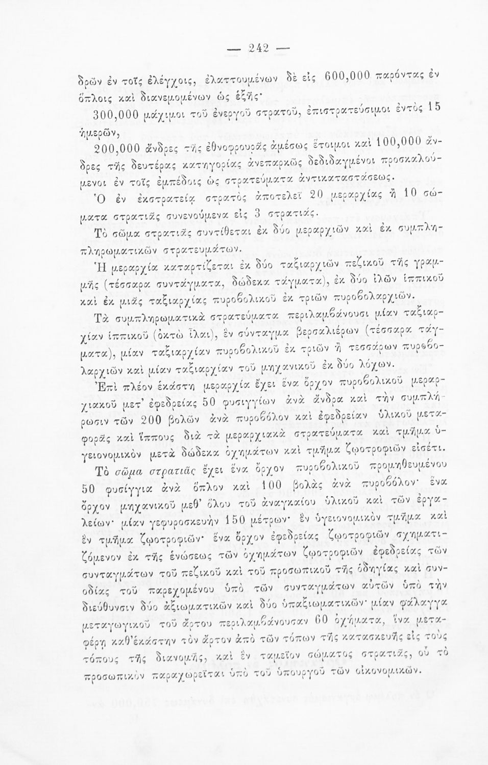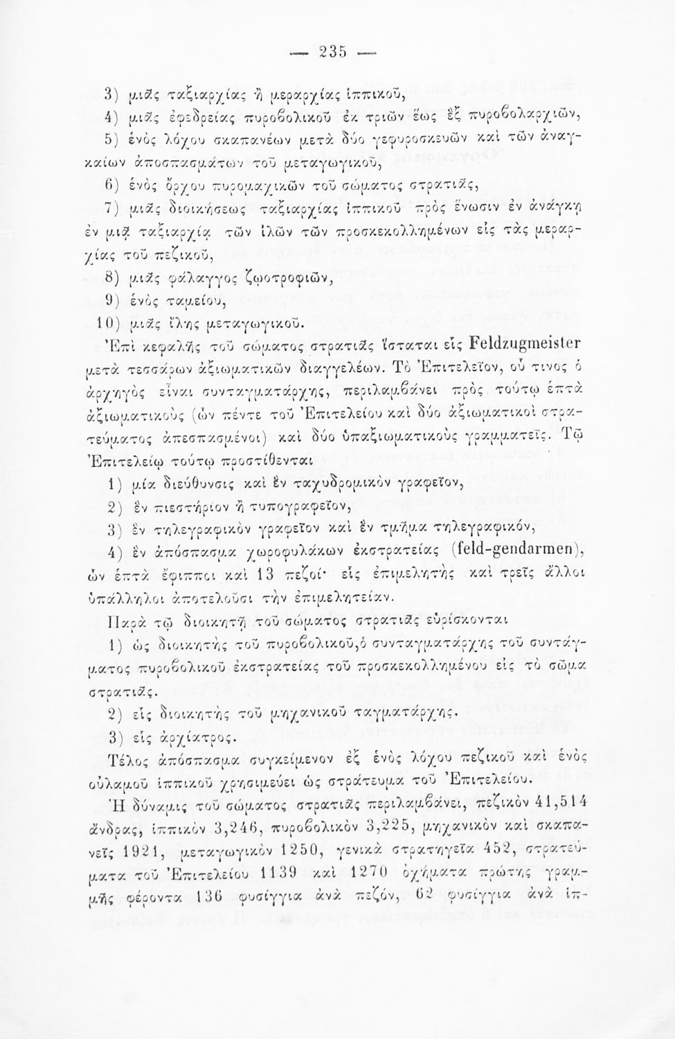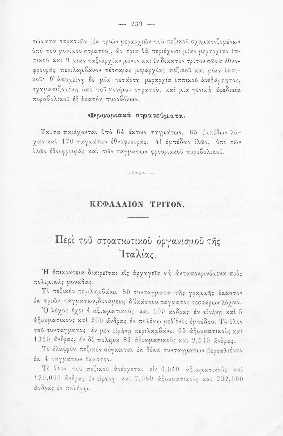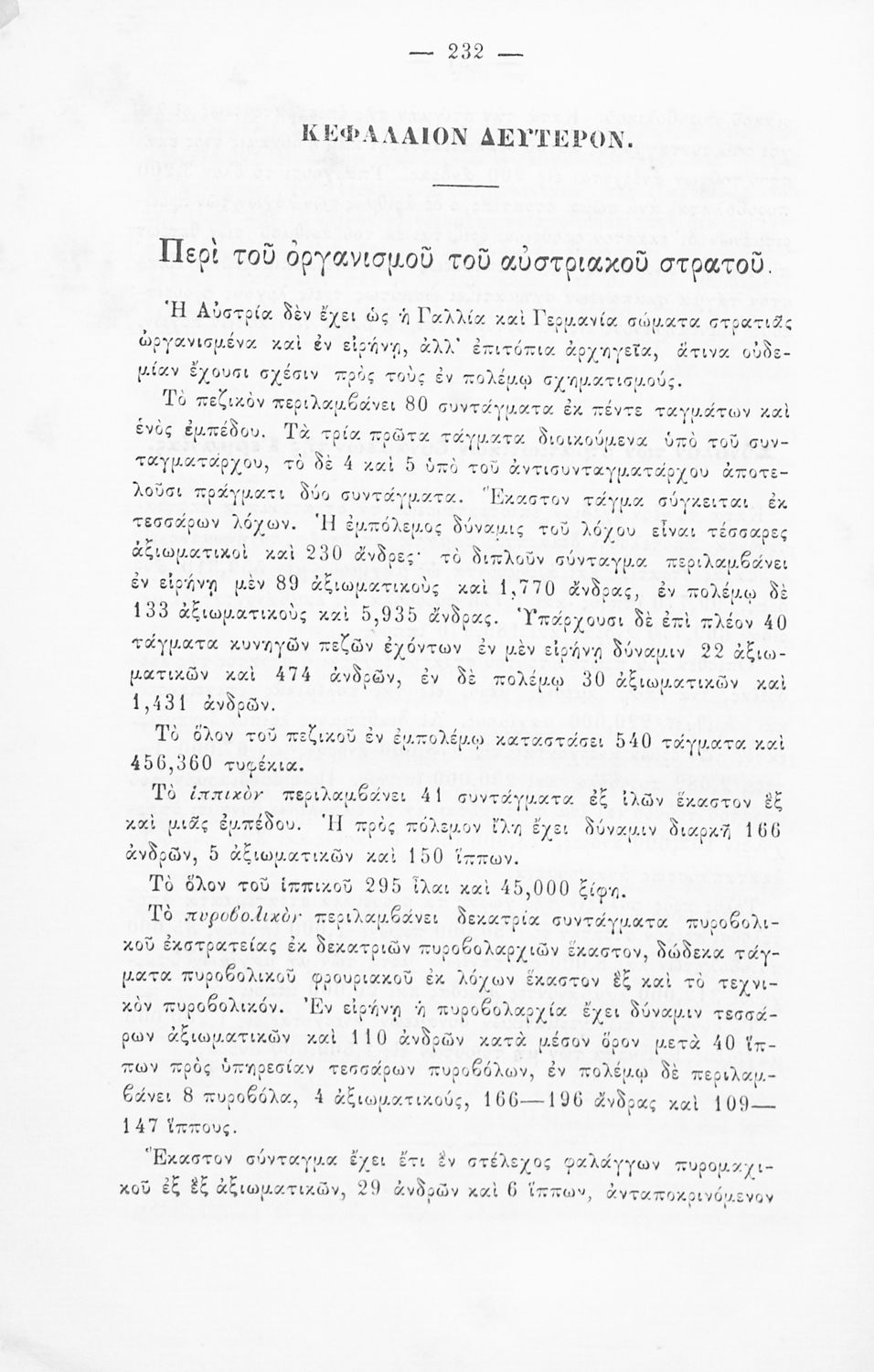 Παρουσίαση περιεχομένου: Εγχειρίδιο, μεταφρασμένο από τα Γαλλικά, που στόχο είχε τη διδασκαλία του στρατιωτικού συστήματος ορισμένων κρατών της Ευρώπης στη Στρατιωτική σχολή των Ευελπίδων. Στο βιβλίο παρουσιάζεται η δομή των στρατιωτικών οργανισμών και τα συστήματα στρατολόγησης των διαφόρων χωρών.