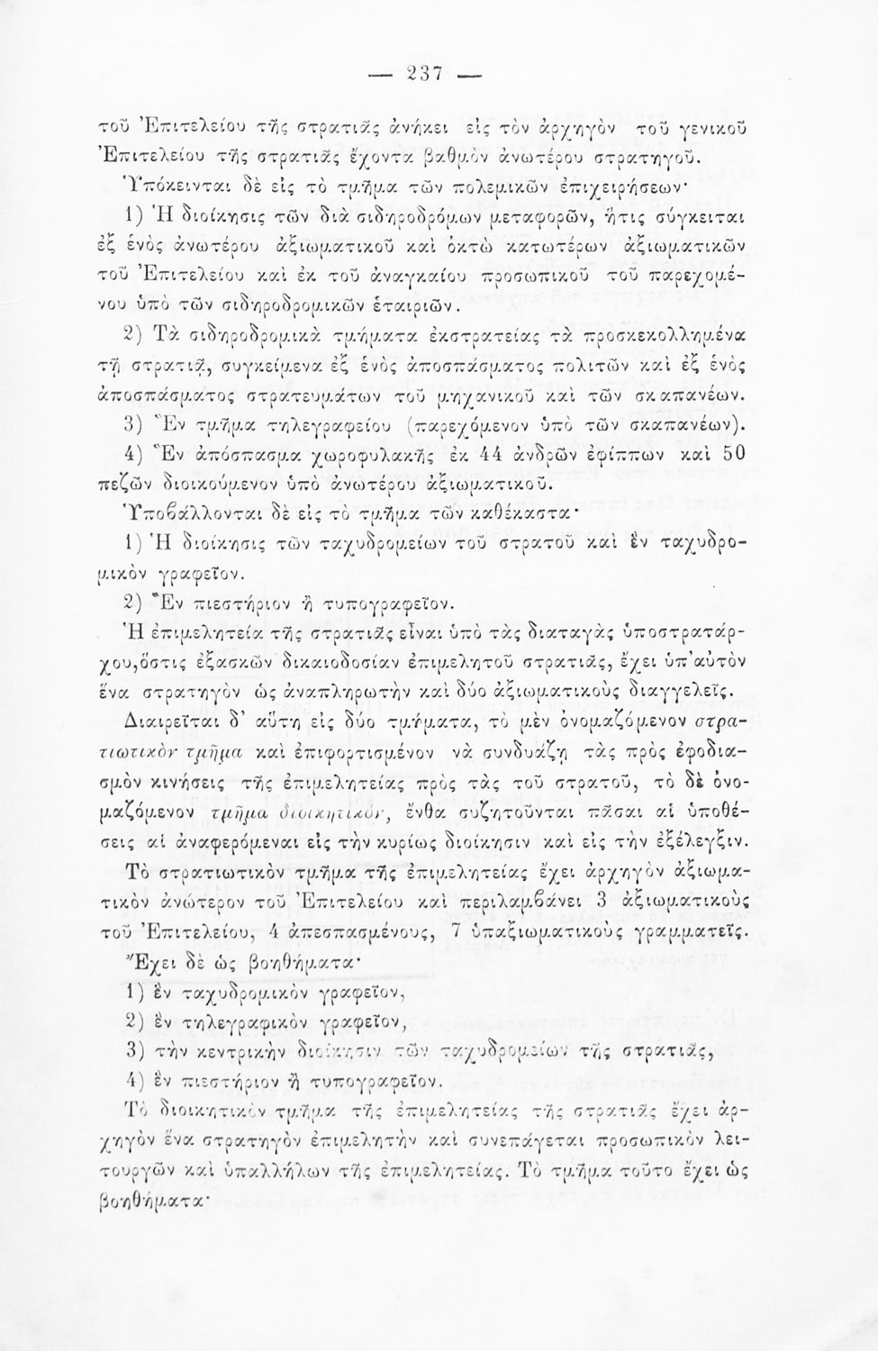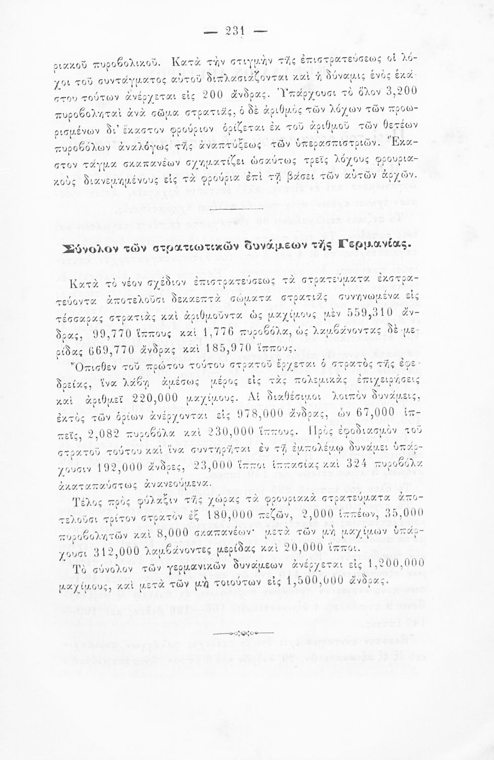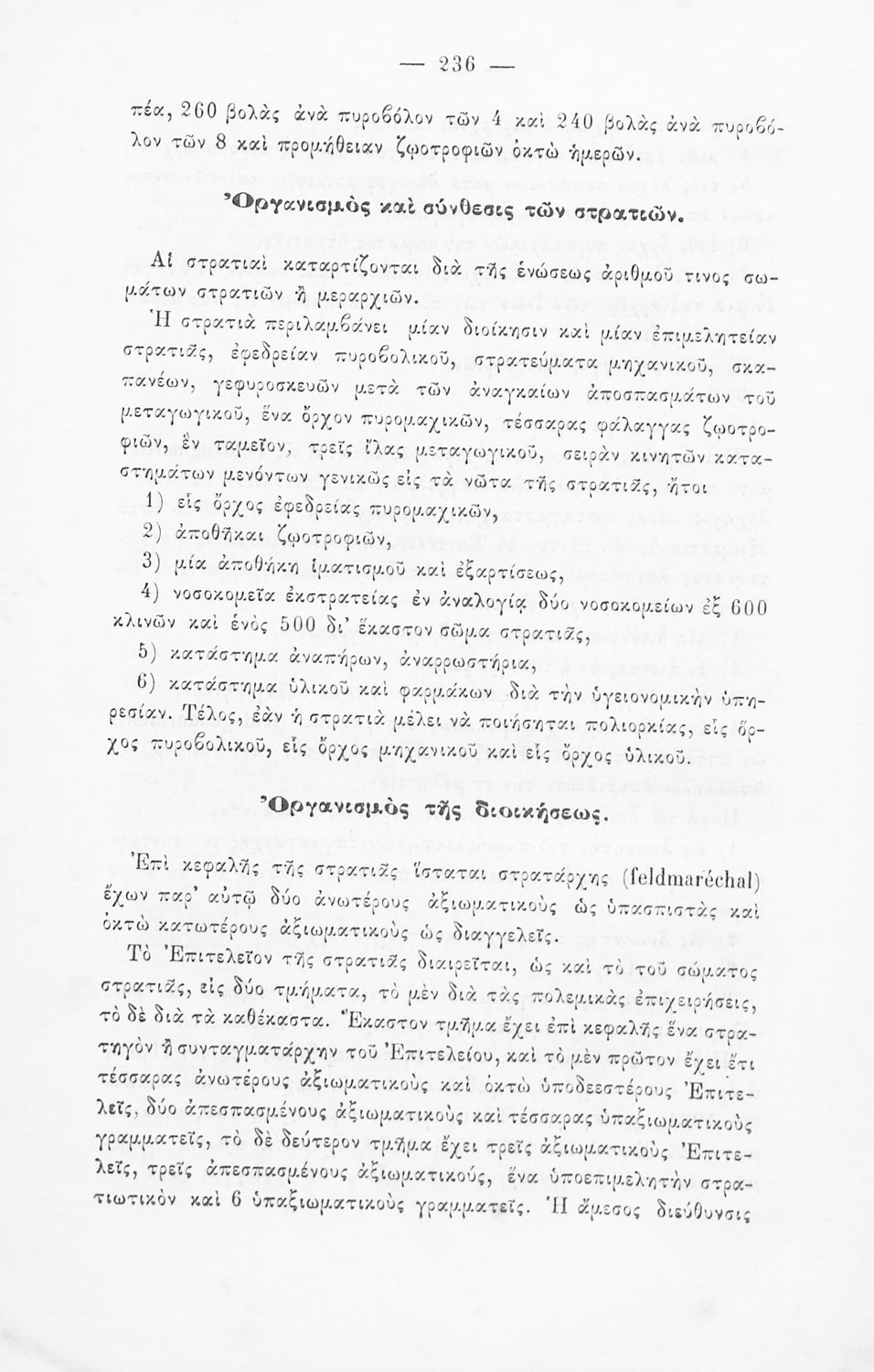 Παρουσίαση περιεχομένου: Εγχειρίδιο, μεταφρασμένο από τα Γαλλικά, που στόχο είχε τη διδασκαλία του στρατιωτικού συστήματος ορισμένων κρατών της Ευρώπης στη Στρατιωτική σχολή των Ευελπίδων. Στο βιβλίο παρουσιάζεται η δομή των στρατιωτικών οργανισμών και τα συστήματα στρατολόγησης των διαφόρων χωρών.