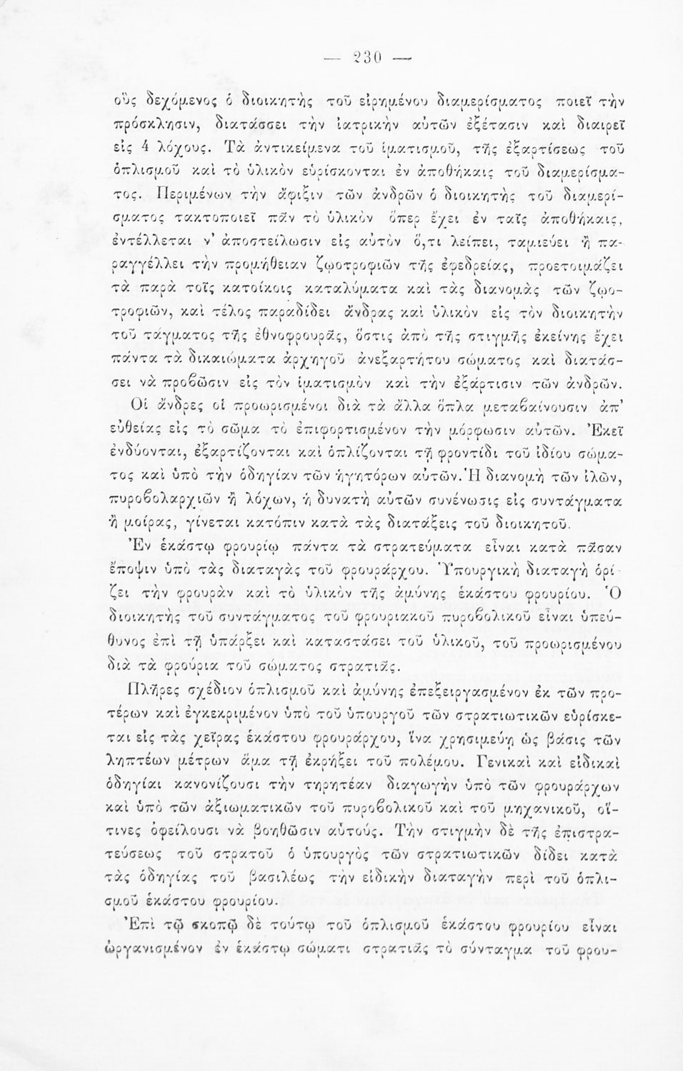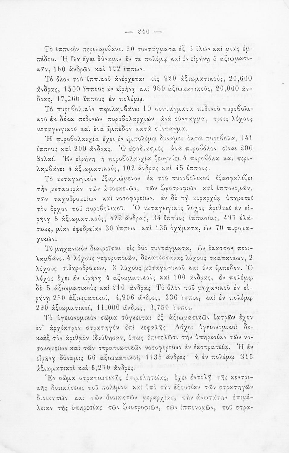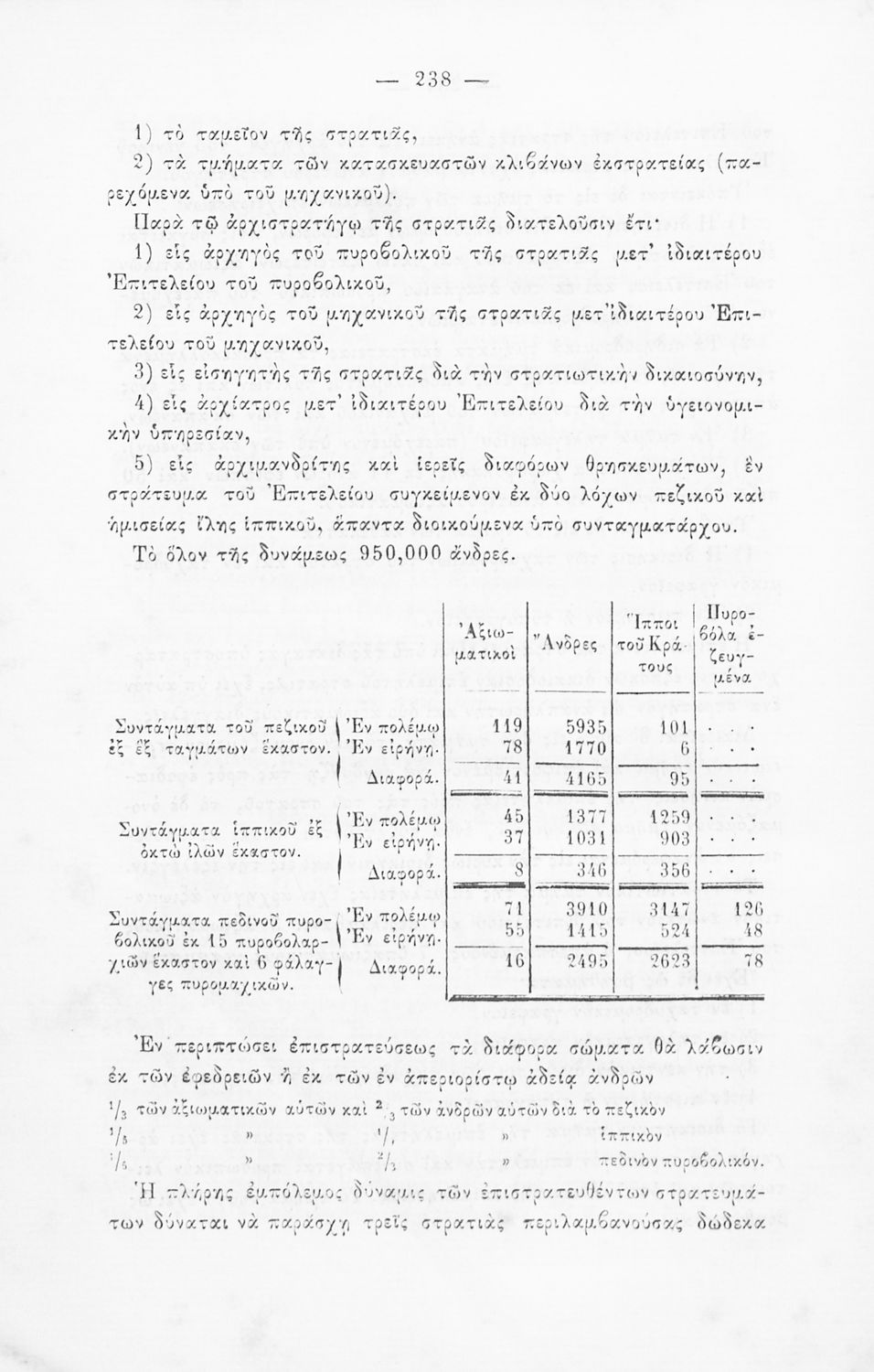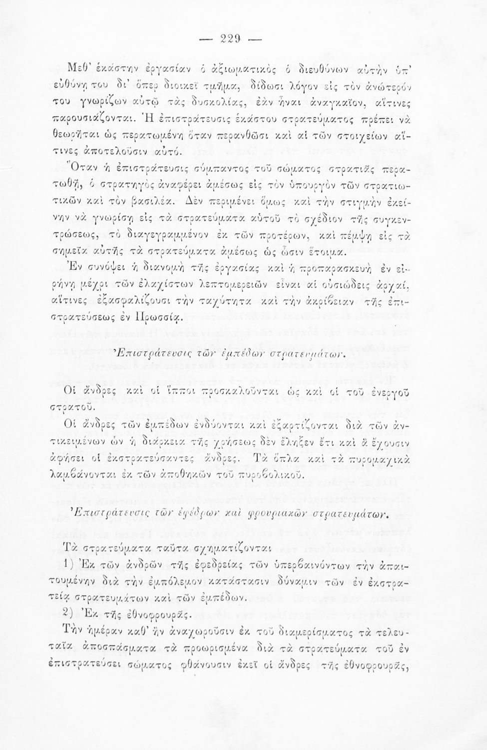 Παρουσίαση περιεχομένου: Εγχειρίδιο, μεταφρασμένο από τα Γαλλικά, που στόχο είχε τη διδασκαλία του στρατιωτικού συστήματος ορισμένων κρατών της Ευρώπης στη Στρατιωτική σχολή των Ευελπίδων. Στο βιβλίο παρουσιάζεται η δομή των στρατιωτικών οργανισμών και τα συστήματα στρατολόγησης των διαφόρων χωρών.