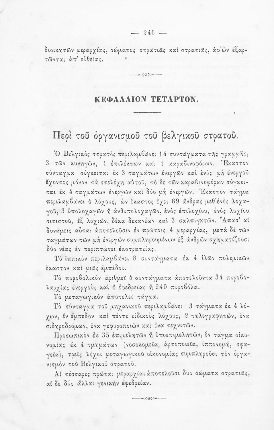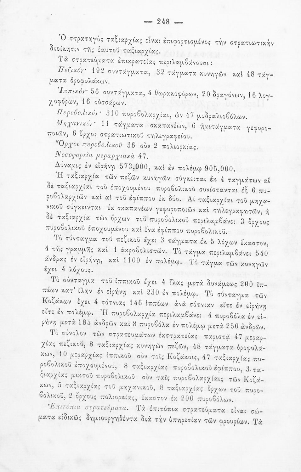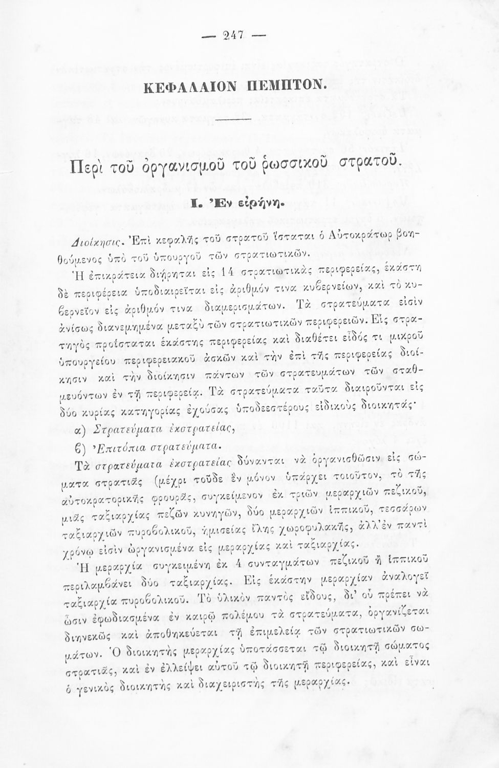 Παρουσίαση περιεχομένου: Εγχειρίδιο, μεταφρασμένο από τα Γαλλικά, που στόχο είχε τη διδασκαλία του στρατιωτικού συστήματος ορισμένων κρατών της Ευρώπης στη Στρατιωτική σχολή των Ευελπίδων. Στο βιβλίο παρουσιάζεται η δομή των στρατιωτικών οργανισμών και τα συστήματα στρατολόγησης των διαφόρων χωρών.