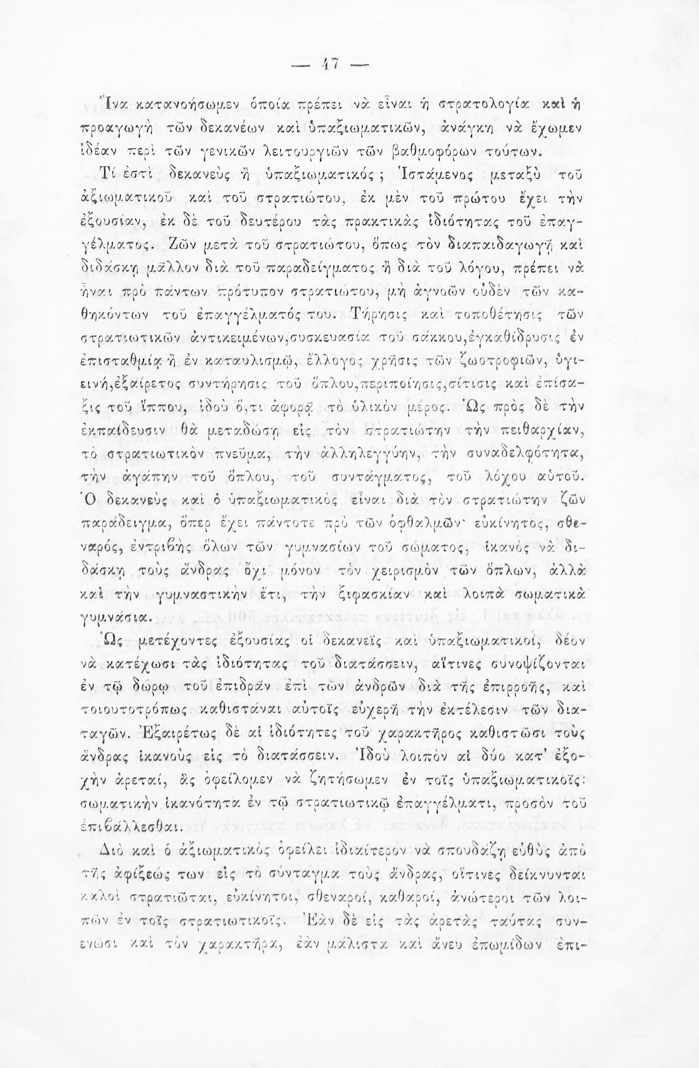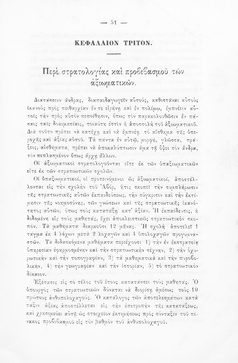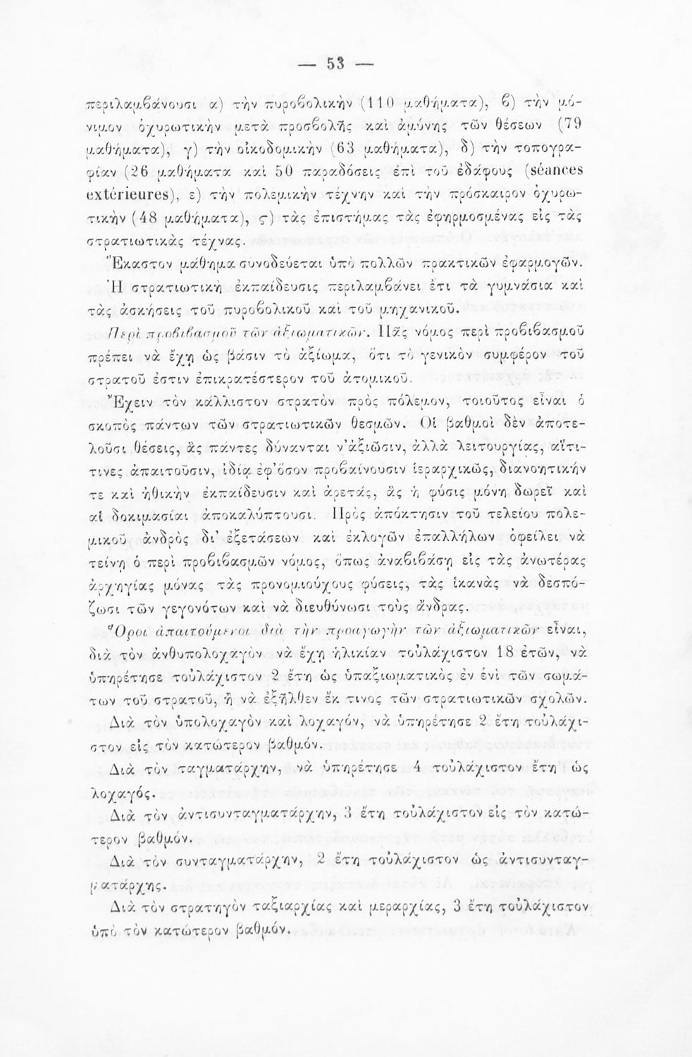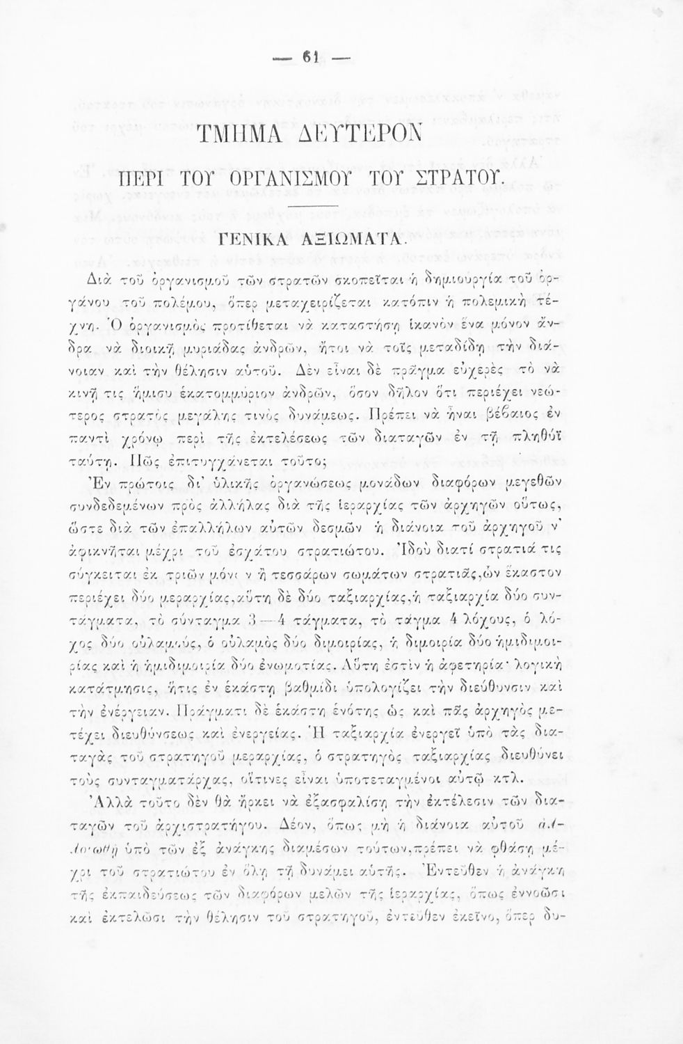 Παρουσίαση περιεχομένου: Εγχειρίδιο, μεταφρασμένο από τα Γαλλικά, που στόχο είχε τη διδασκαλία του στρατιωτικού συστήματος ορισμένων κρατών της Ευρώπης στη Στρατιωτική σχολή των Ευελπίδων. Στο βιβλίο παρουσιάζεται η δομή των στρατιωτικών οργανισμών και τα συστήματα στρατολόγησης των διαφόρων χωρών.