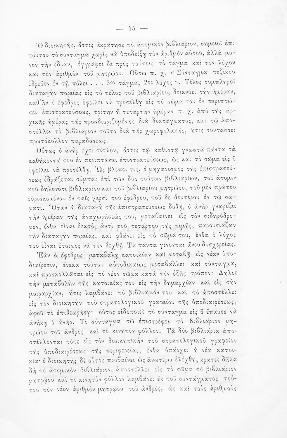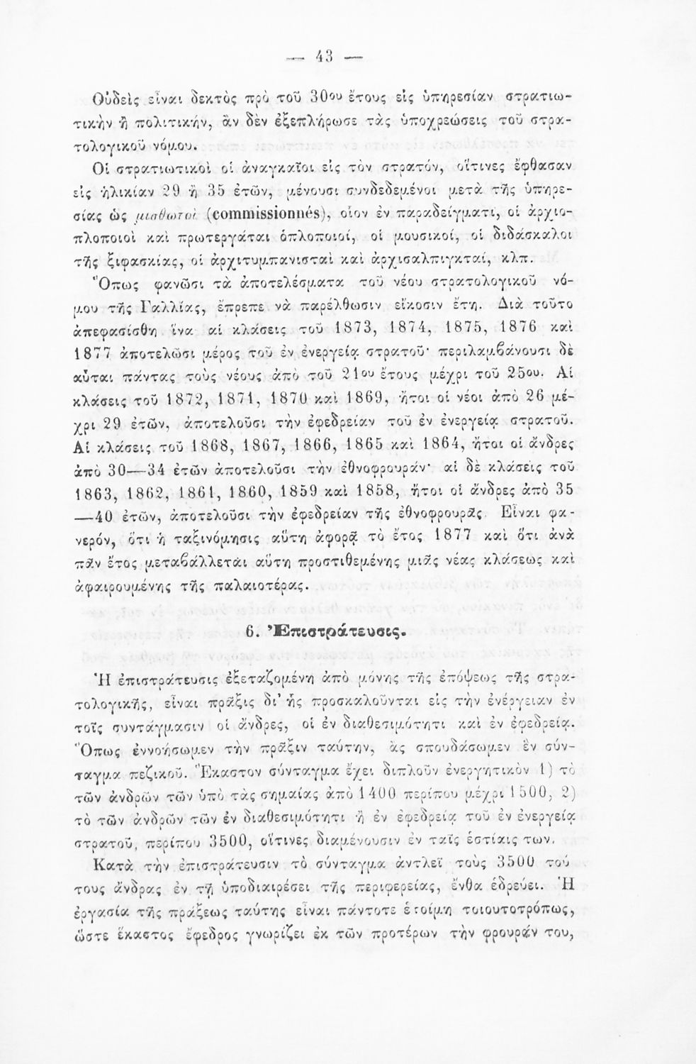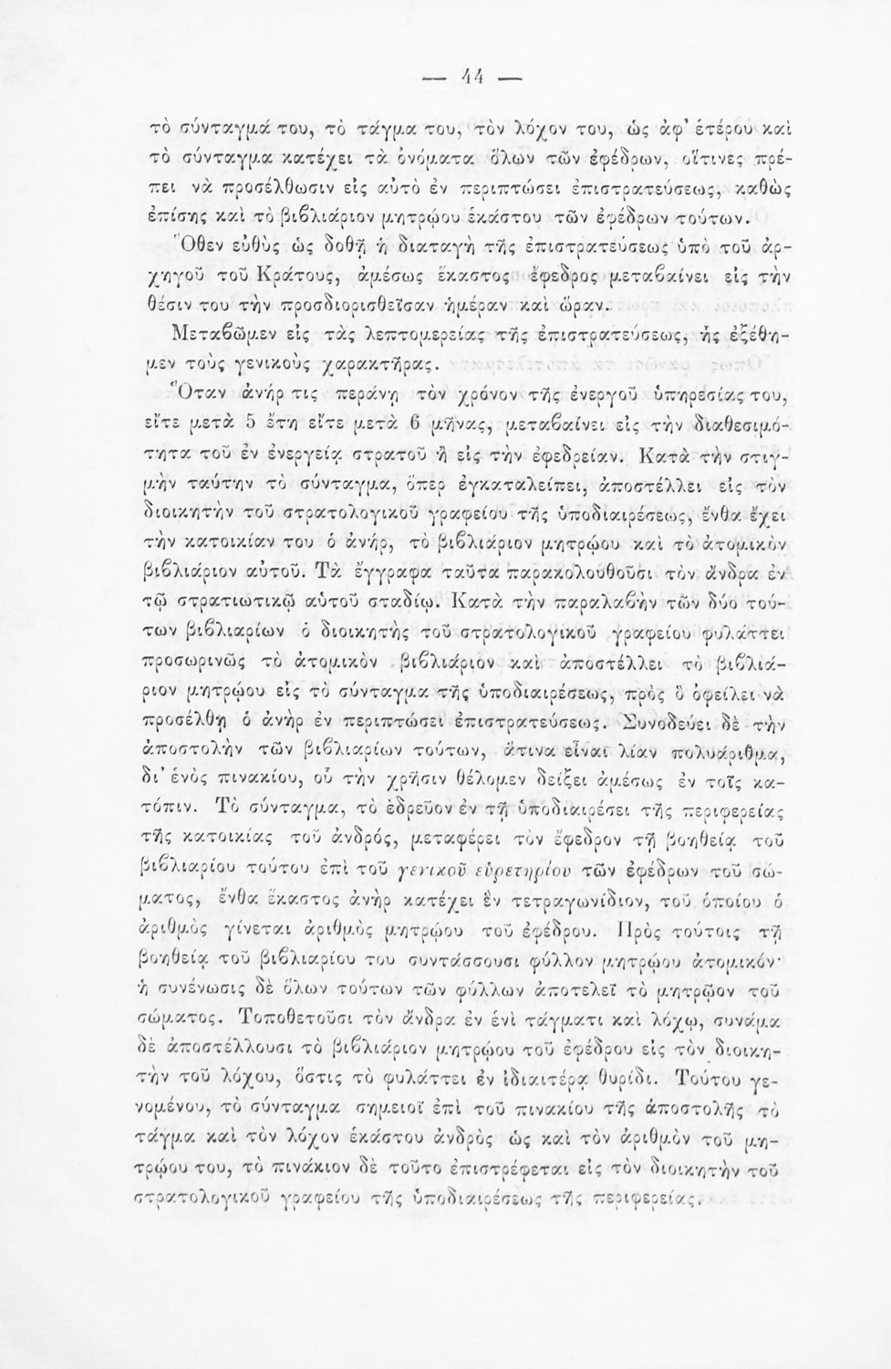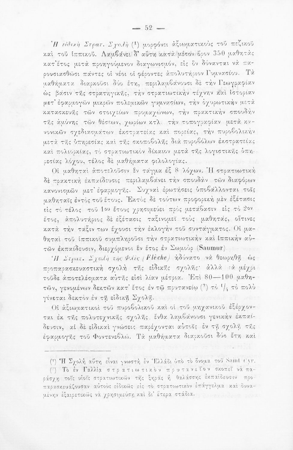 Παρουσίαση περιεχομένου: Εγχειρίδιο, μεταφρασμένο από τα Γαλλικά, που στόχο είχε τη διδασκαλία του στρατιωτικού συστήματος ορισμένων κρατών της Ευρώπης στη Στρατιωτική σχολή των Ευελπίδων. Στο βιβλίο παρουσιάζεται η δομή των στρατιωτικών οργανισμών και τα συστήματα στρατολόγησης των διαφόρων χωρών.