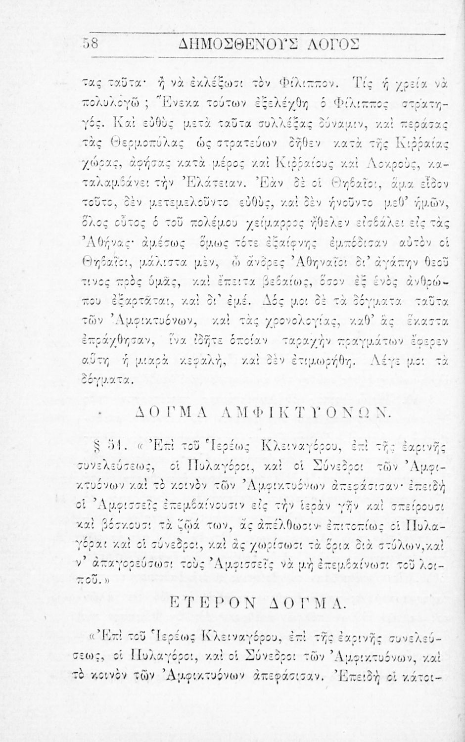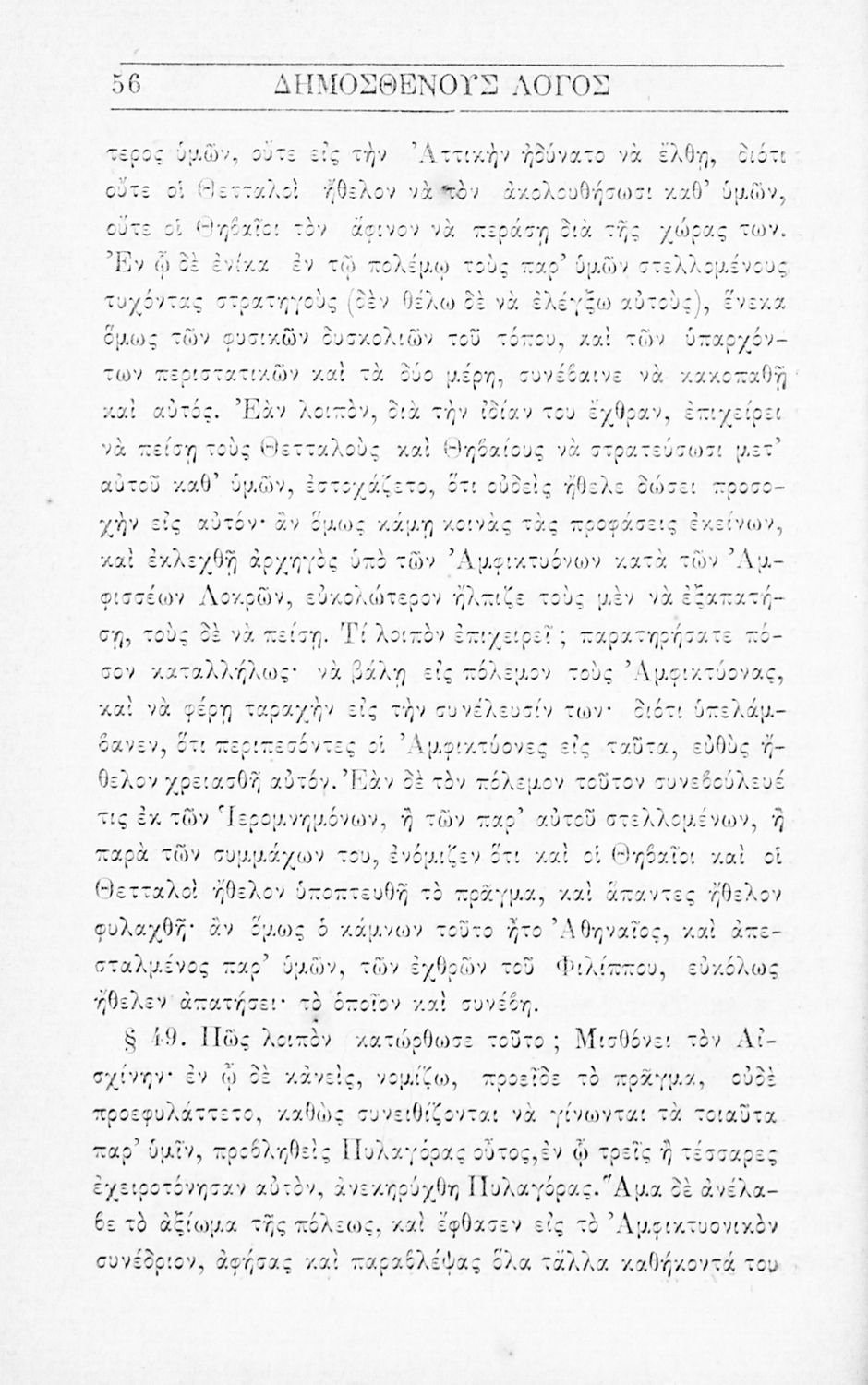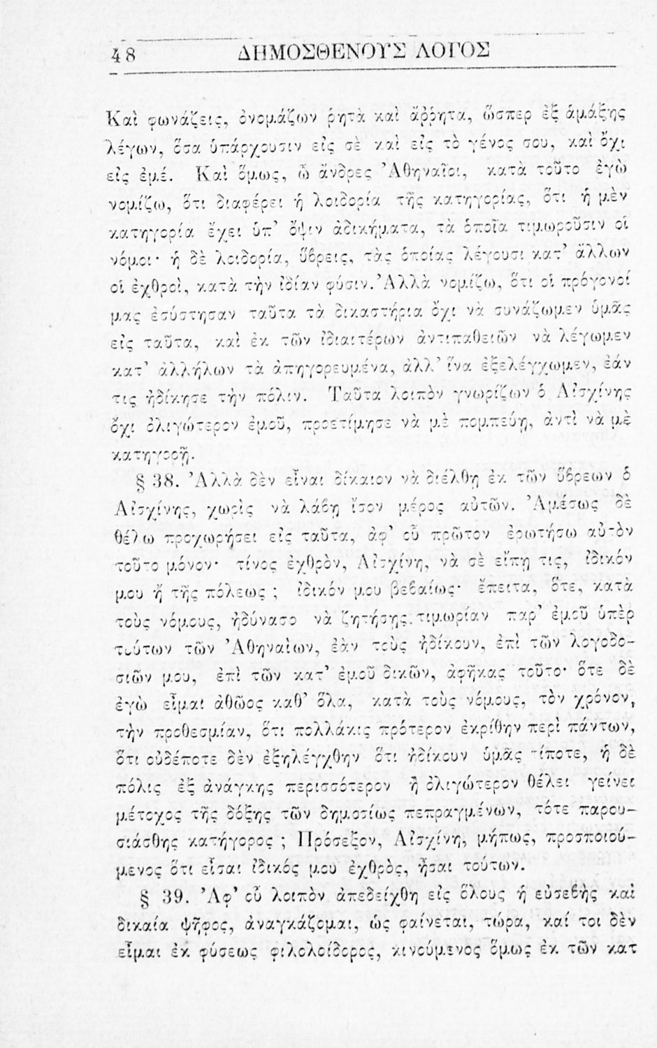 Μαθητικό βοήθημα Αρχαίων Ελληνικών της τρίτης τάξης των τετρατάξιων Γυμνασίων. Το βιβλίο περιέχει τα έργα του Δημοσθένη, Περί της ειρήνης και Α΄ Φιλιππικός από μετάφραση.